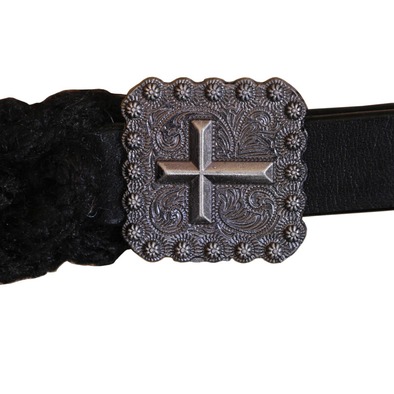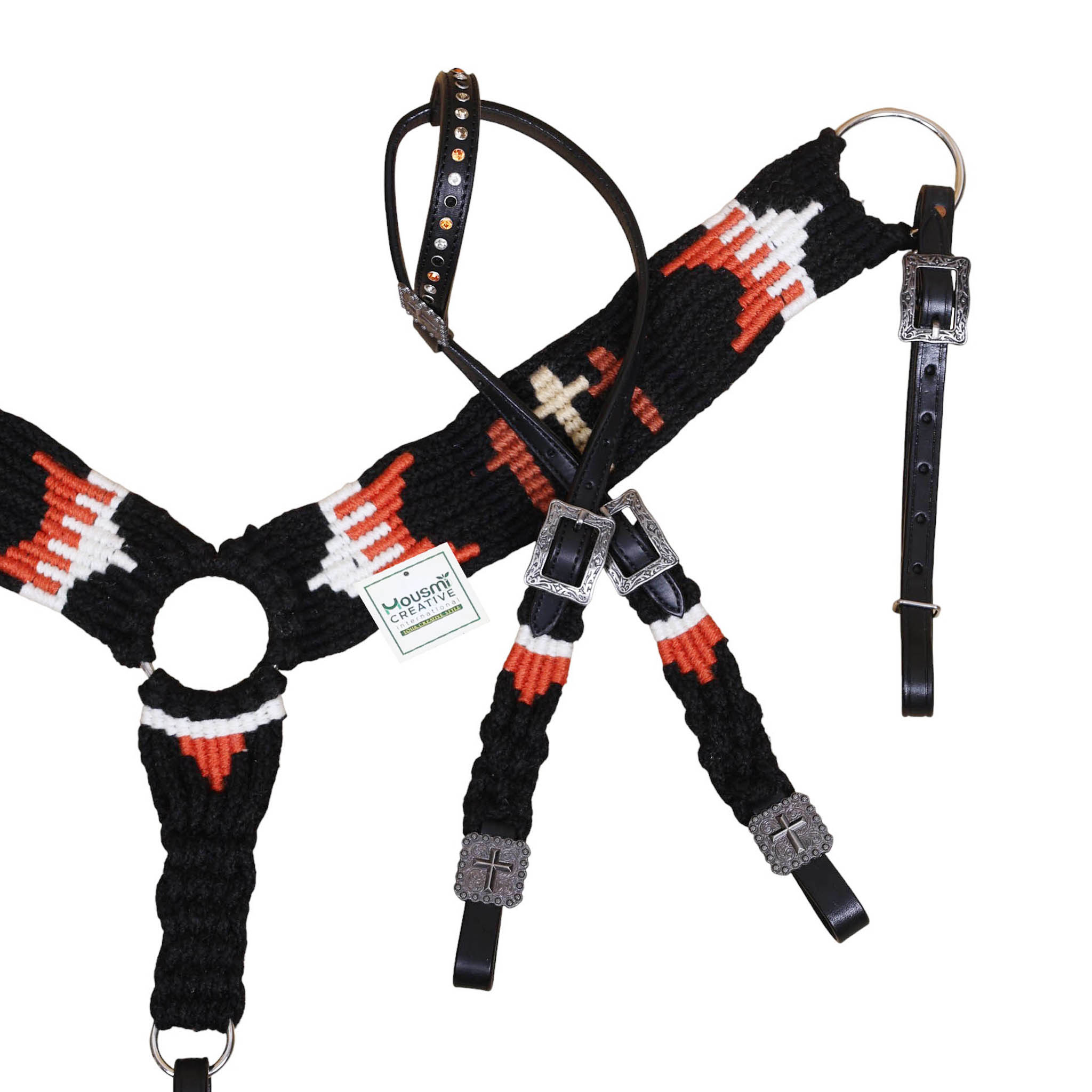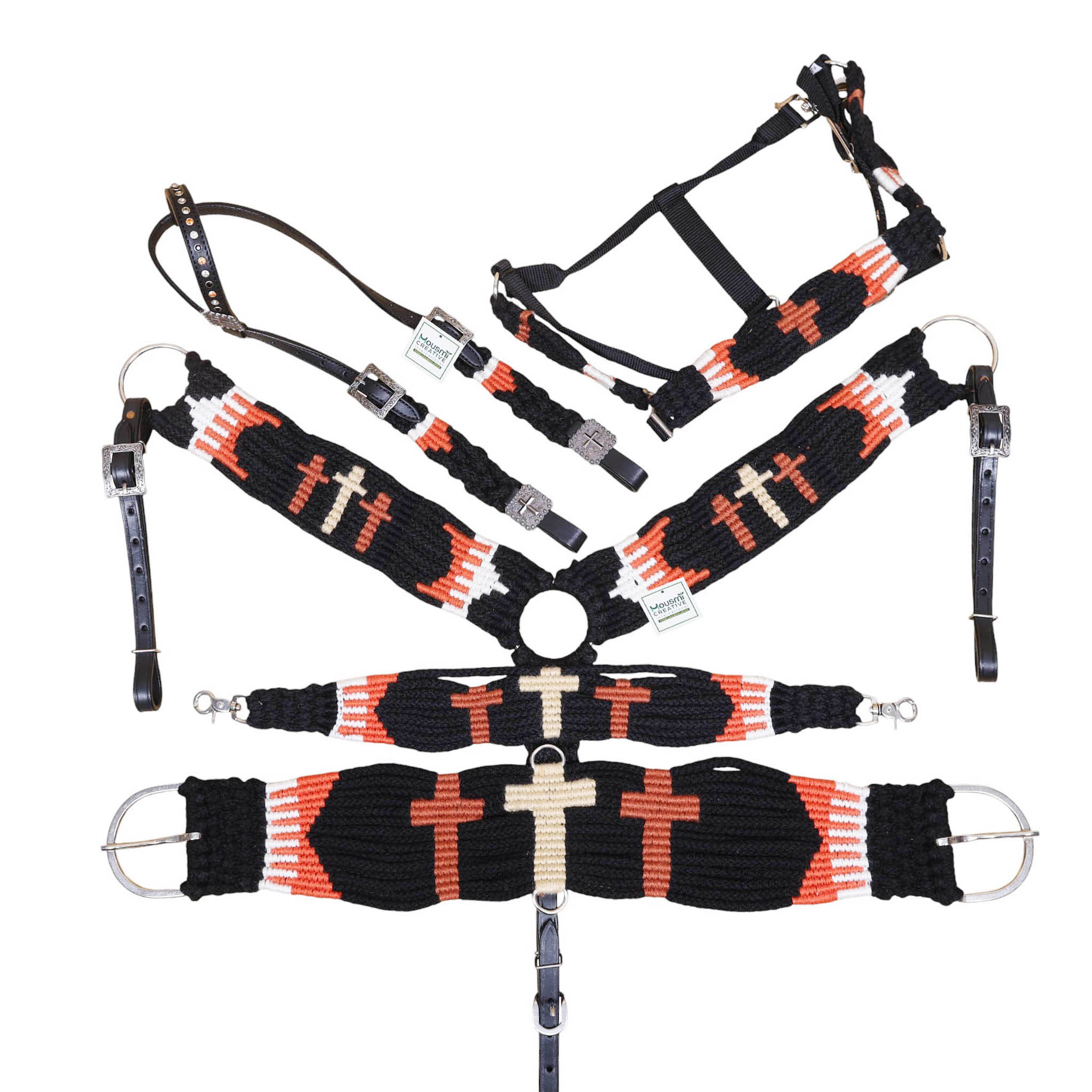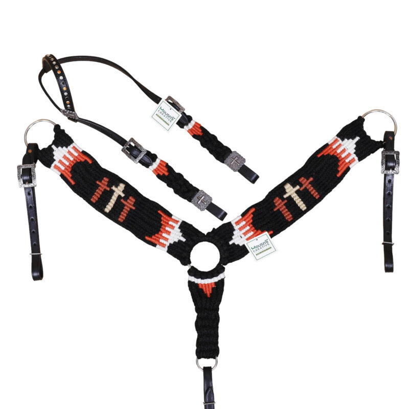Headstall Type: Western Headstall and Breast Collar tack Set decorated with 3 cross design Mohair Headstall tack set decorated with matching front girth 32″ on argentina leather
