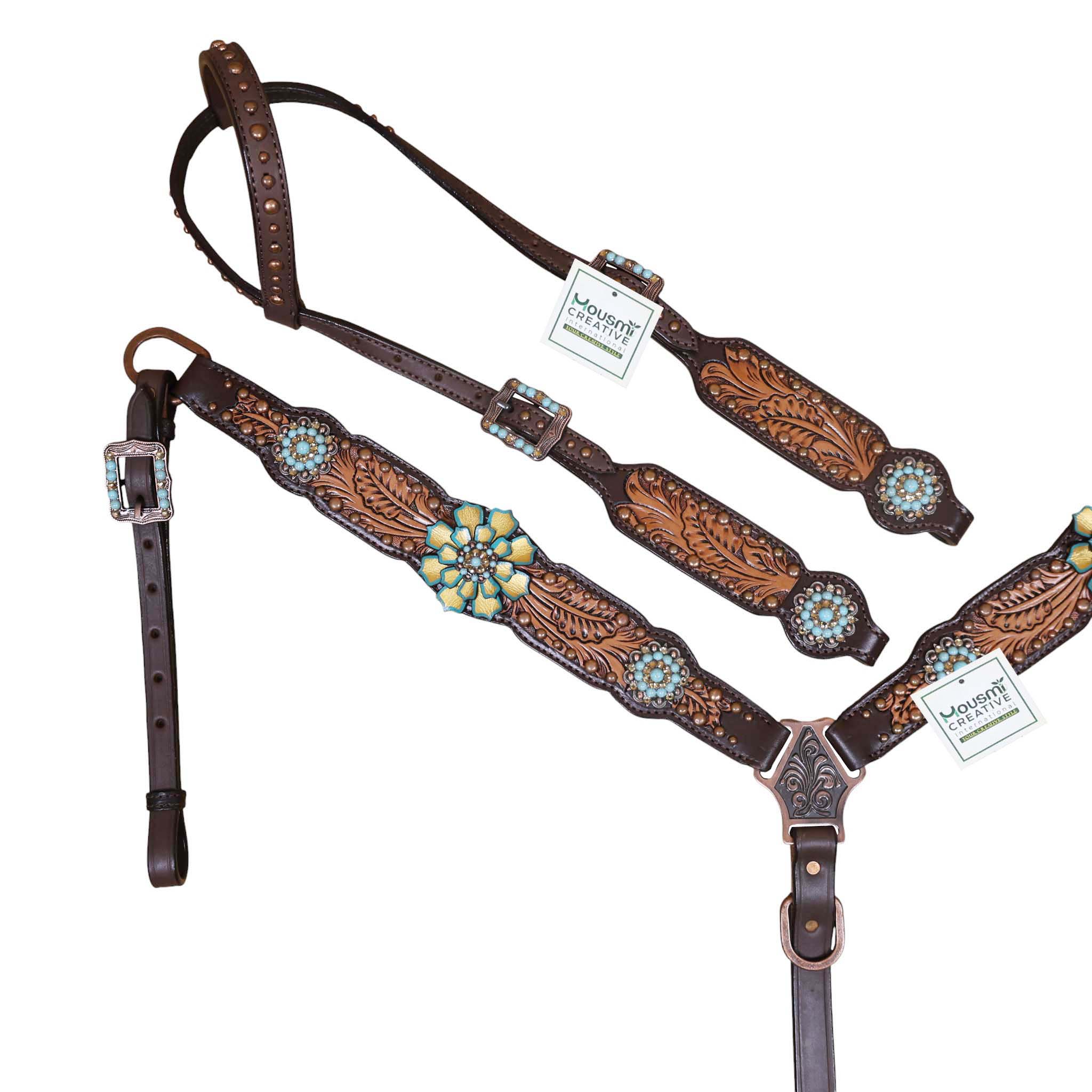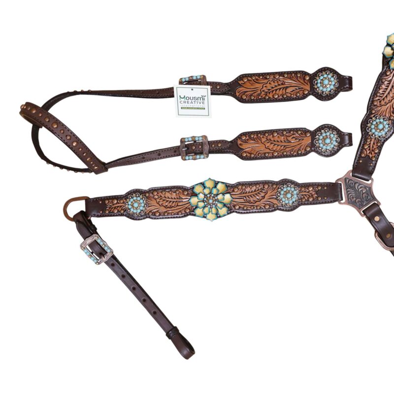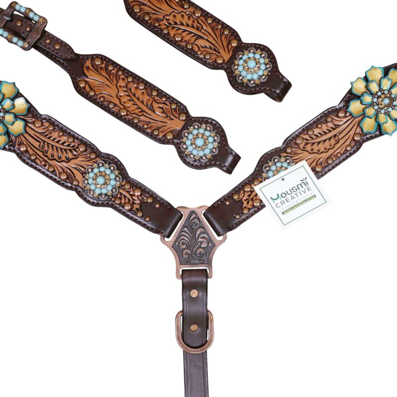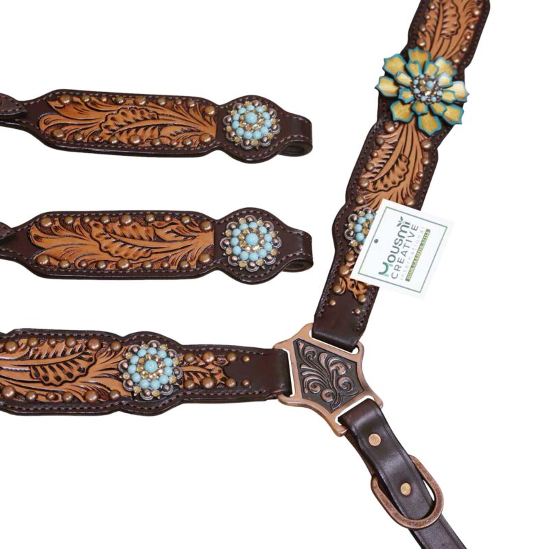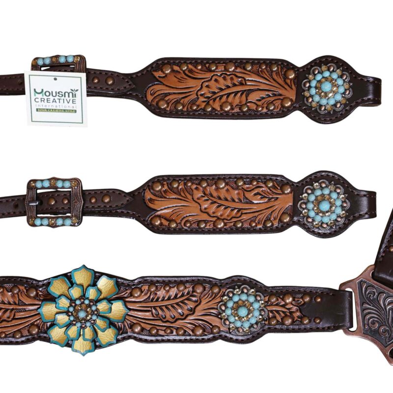 Headstall Type: Headstall and Breast Collar tack Set decorated with copper studs, leaf carving,g antique finish, turquoise stone, berry conchos with golden leather 3D flower on the centre of breast collar