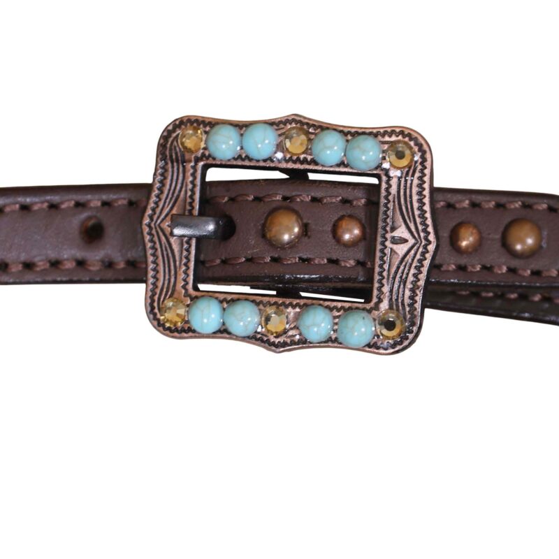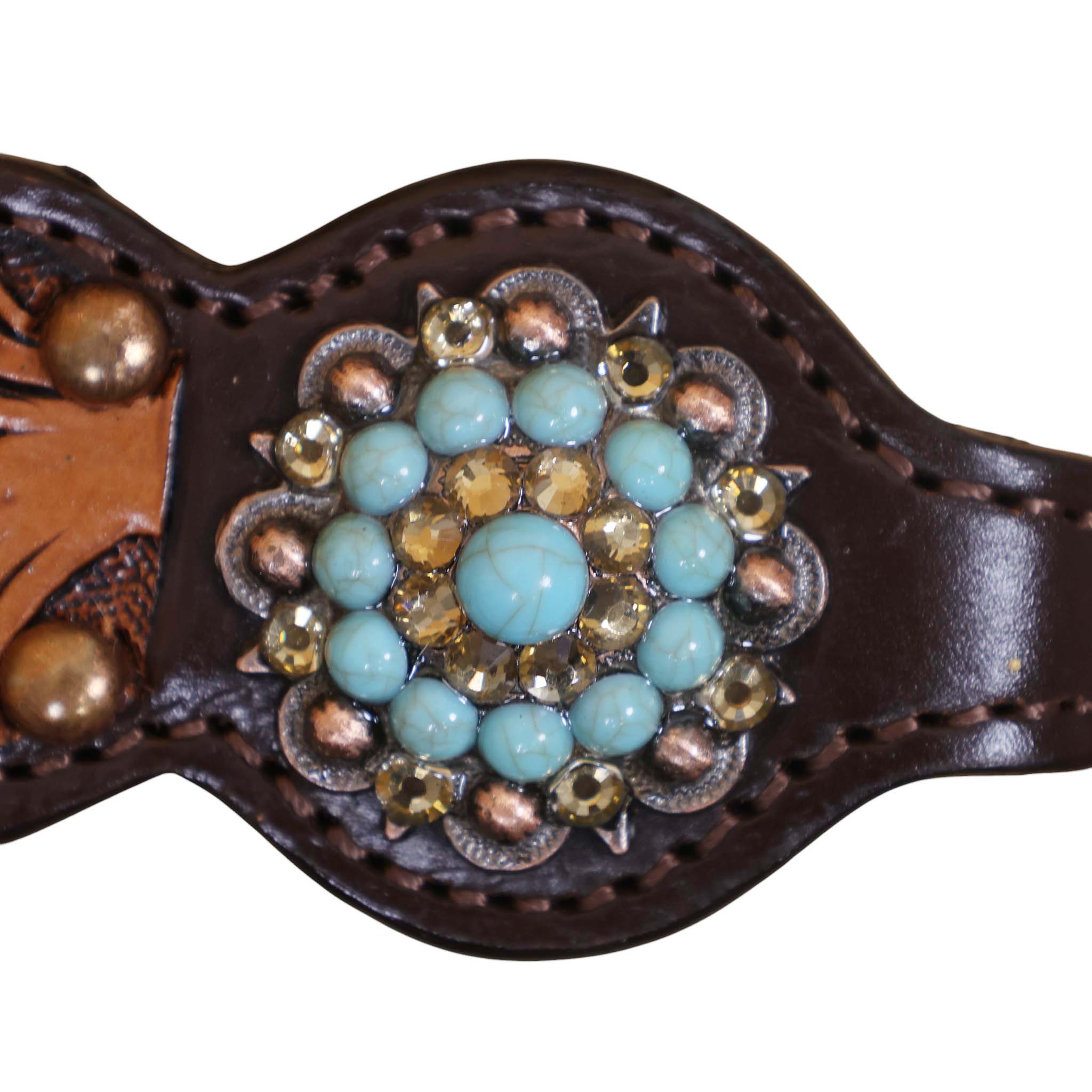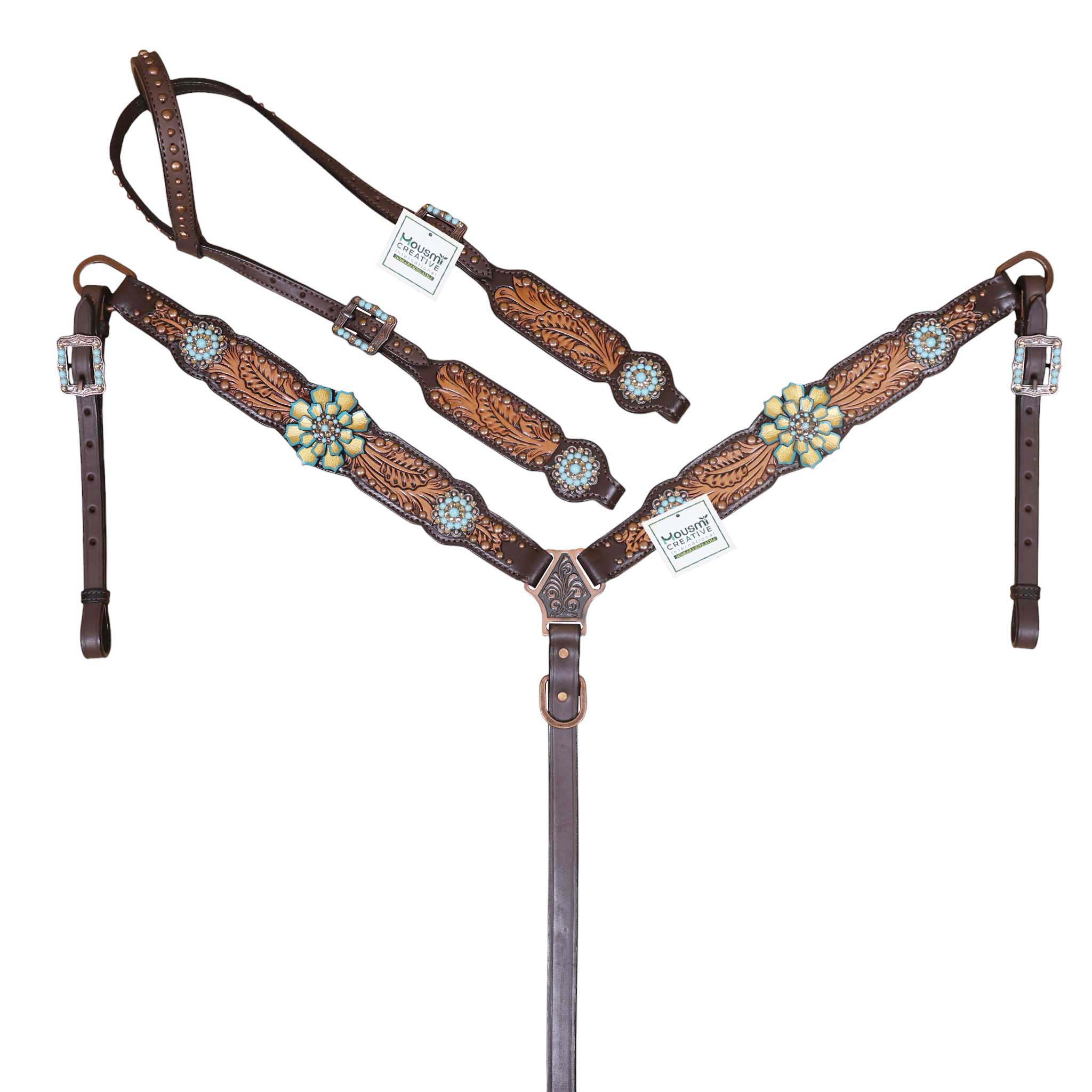 Headstall Type: Headstall and Breast Collar tack Set decorated with copper studs, leaf carving,g antique finish, turquoise stone, berry conchos with golden leather 3D flower on the centre of breast collar
