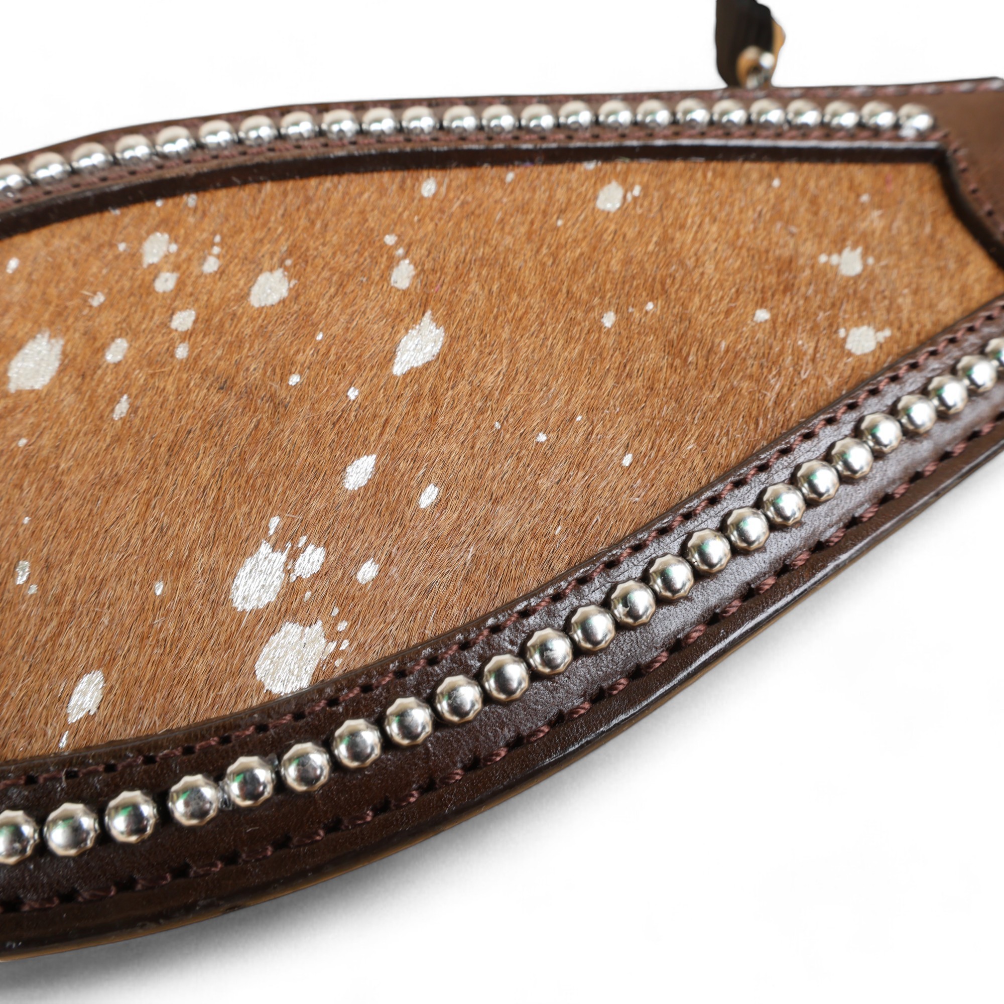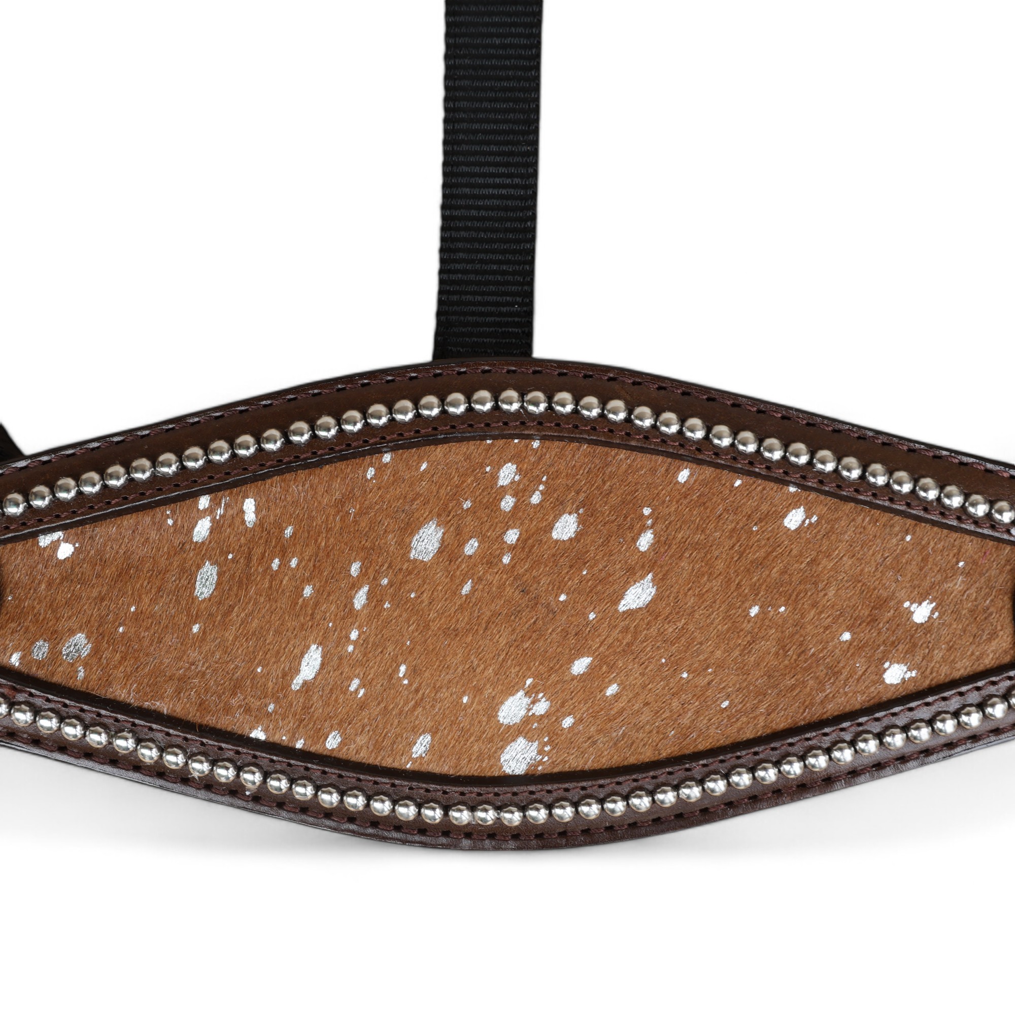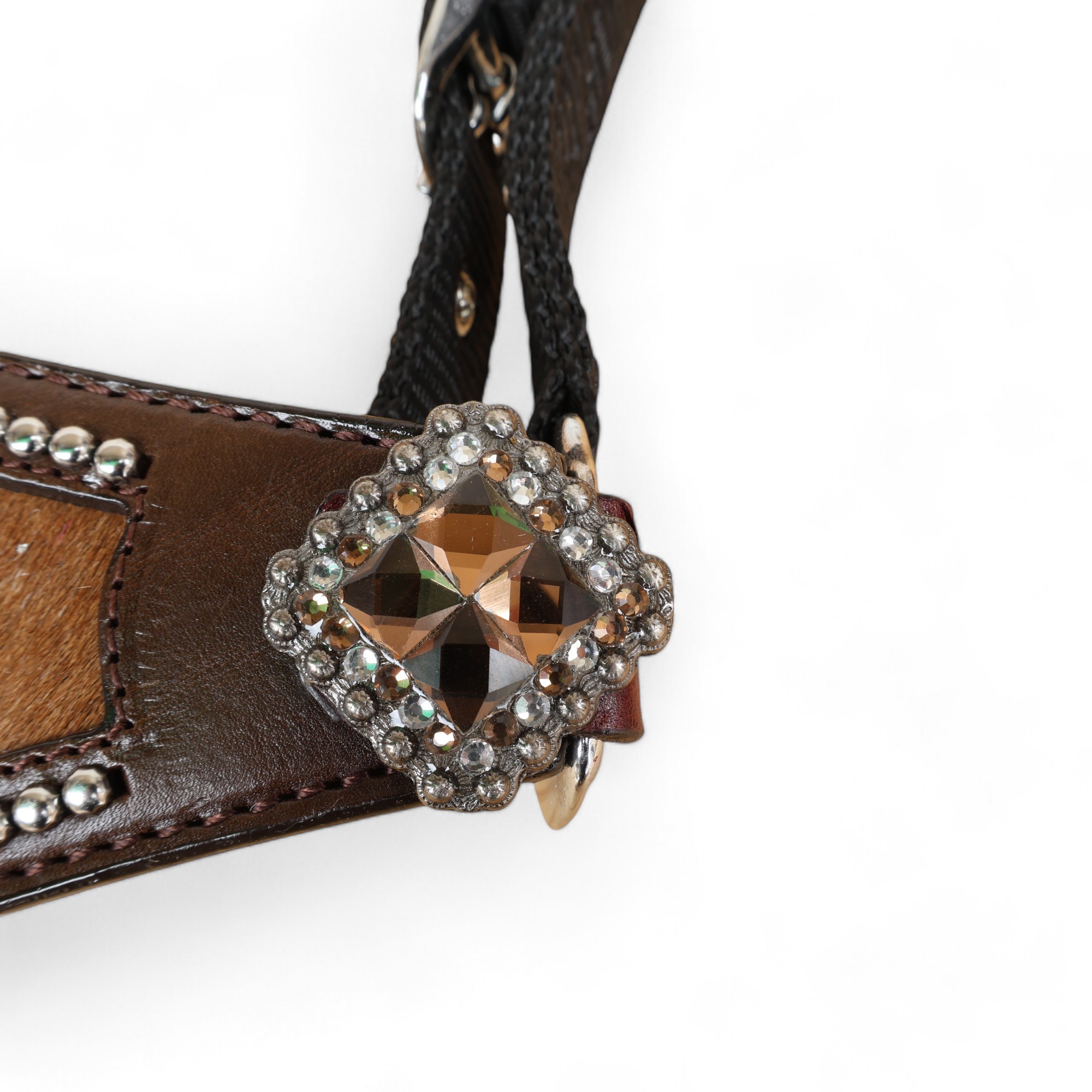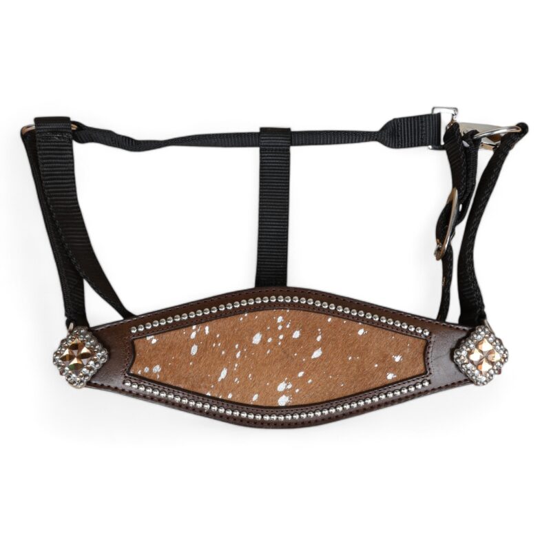 Western Horse Bronc Halter with Brown Acid Wash Hair on Leather Decorated with Matching Rhinestone Jeweled Conchos Having Nickel Hardware Provides More Elegant Dressage Look to you While Leading, Tying and Controlling a Horse Handling for Tasks Like- Grooming, Training and General Management. To know More About This Product, Please Send Us Your Enquiry, We Will Revert Back Within 24 Hours.Â
