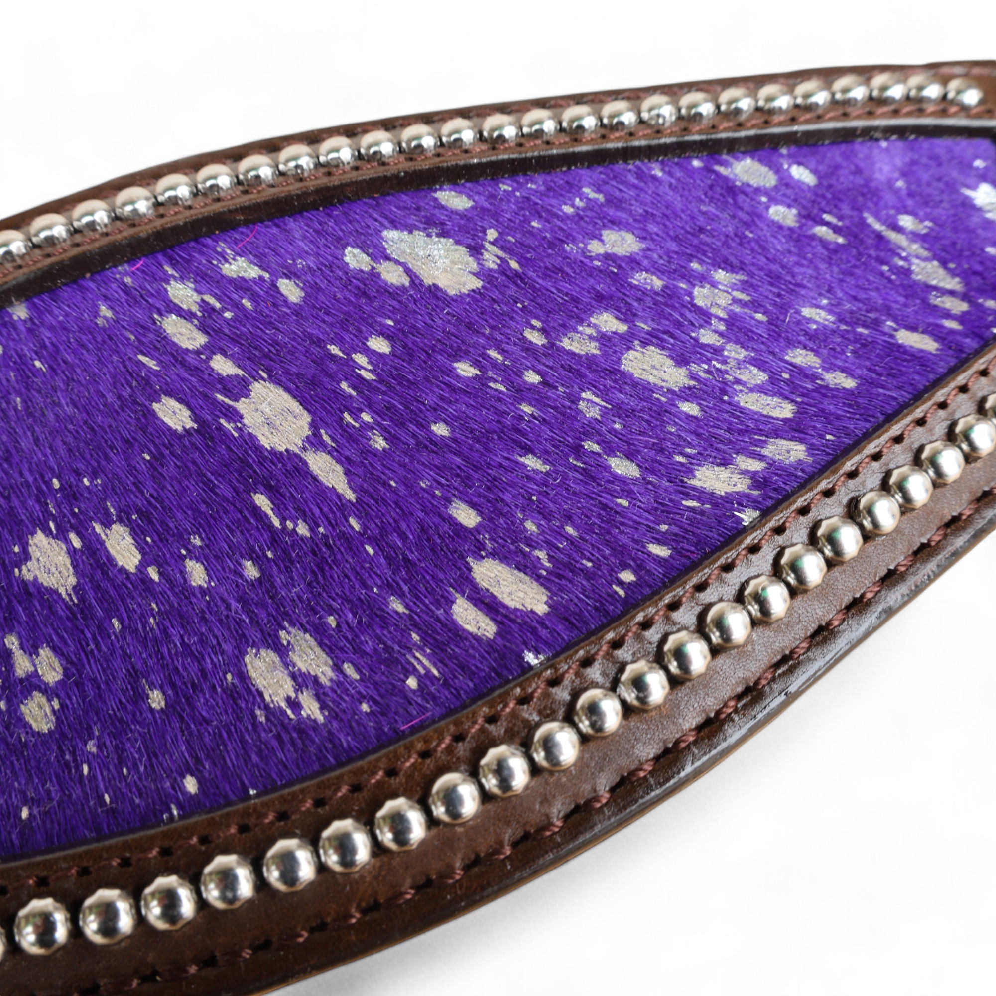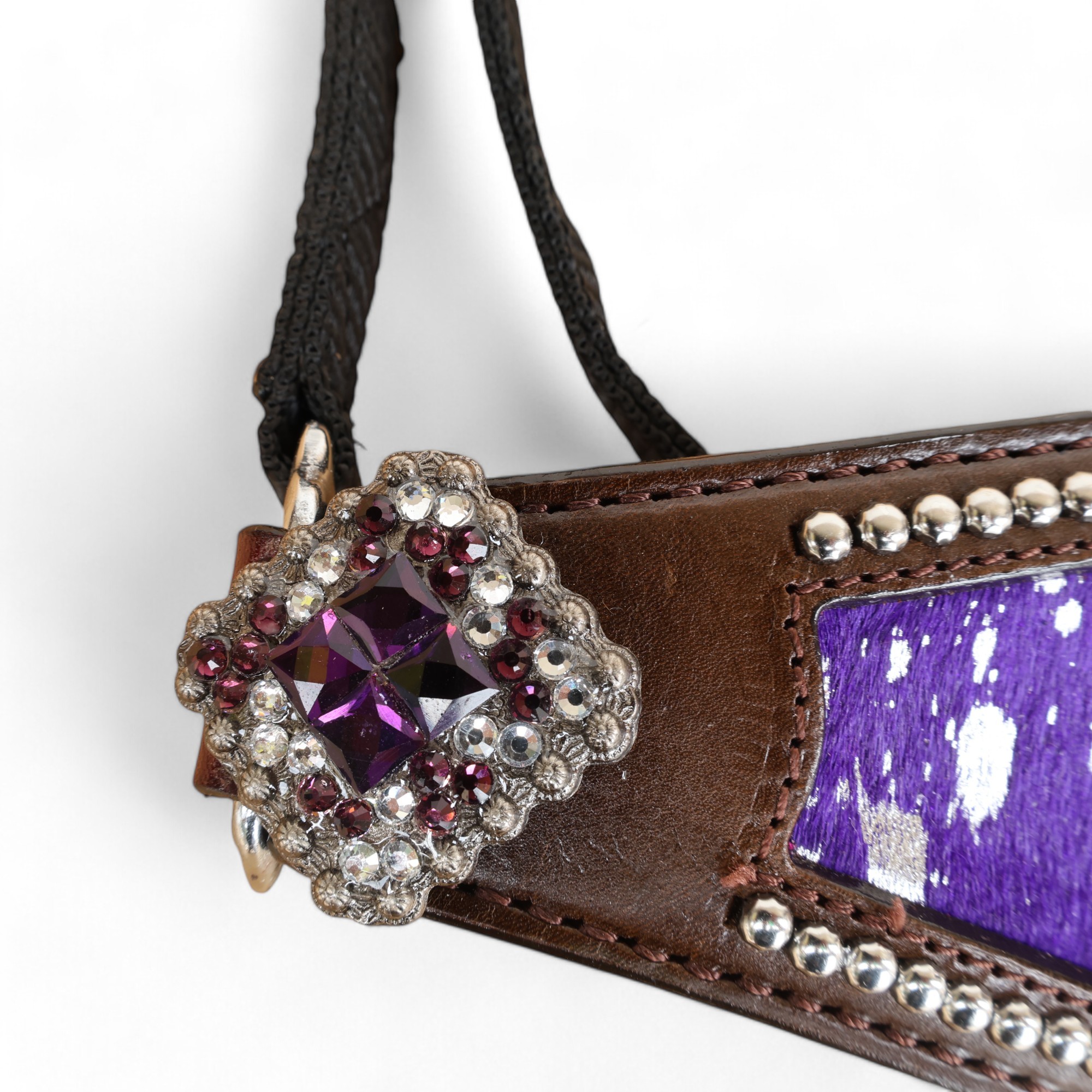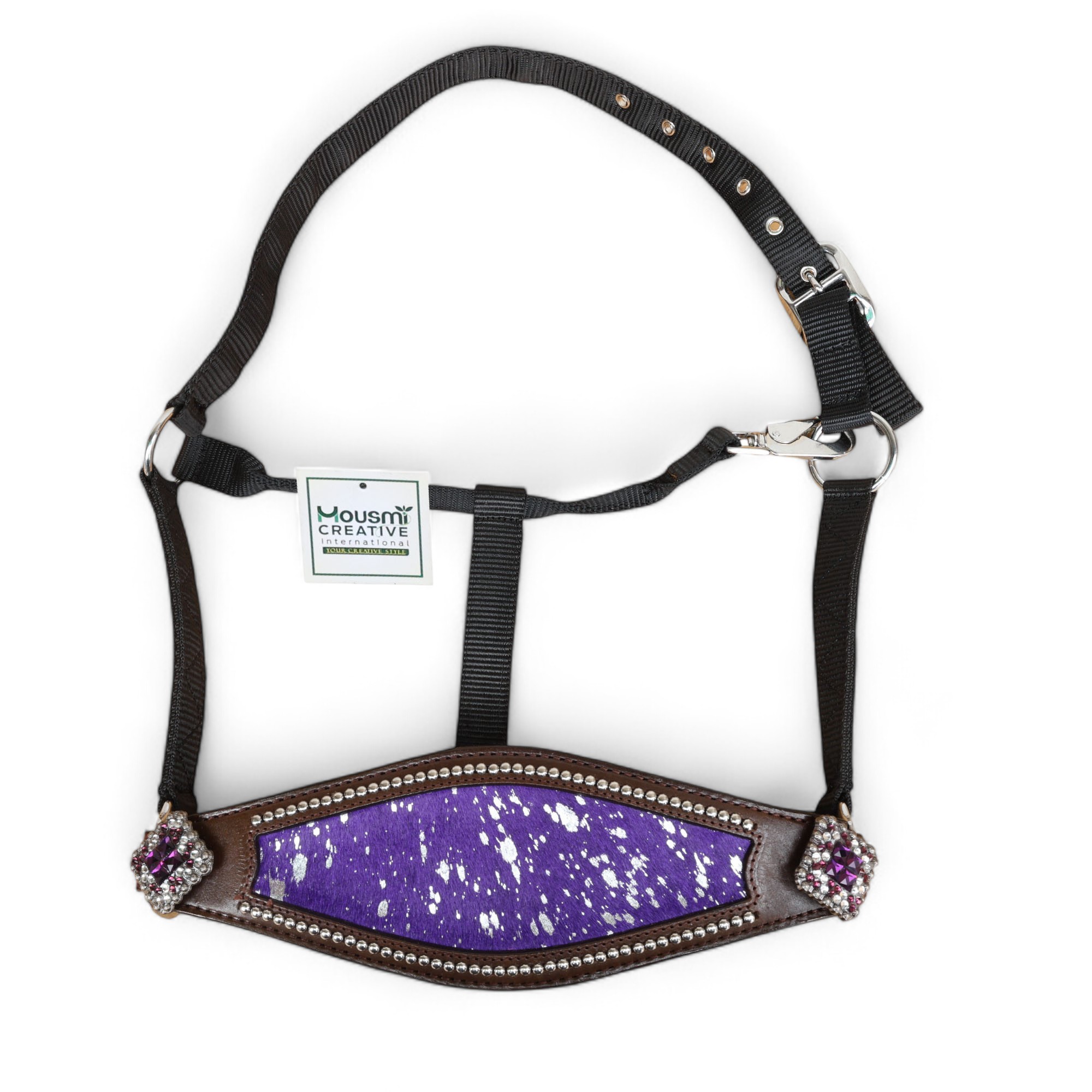 Western Horse Bronc Halter with Purple Acid Wash Hair on Leather Decorated with Matching Rhinestone Jeweled Conchos Having Nickel Hardware Provides More Elegant Dressage Look to you While Leading, Tying and Controlling a Horse Handling for Tasks Like- Grooming, Training and General Management. To know More About This Product, Please Send Us Your Enquiry, We Will Revert Back Within 24 Hours.Â