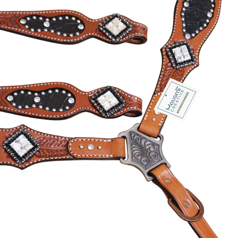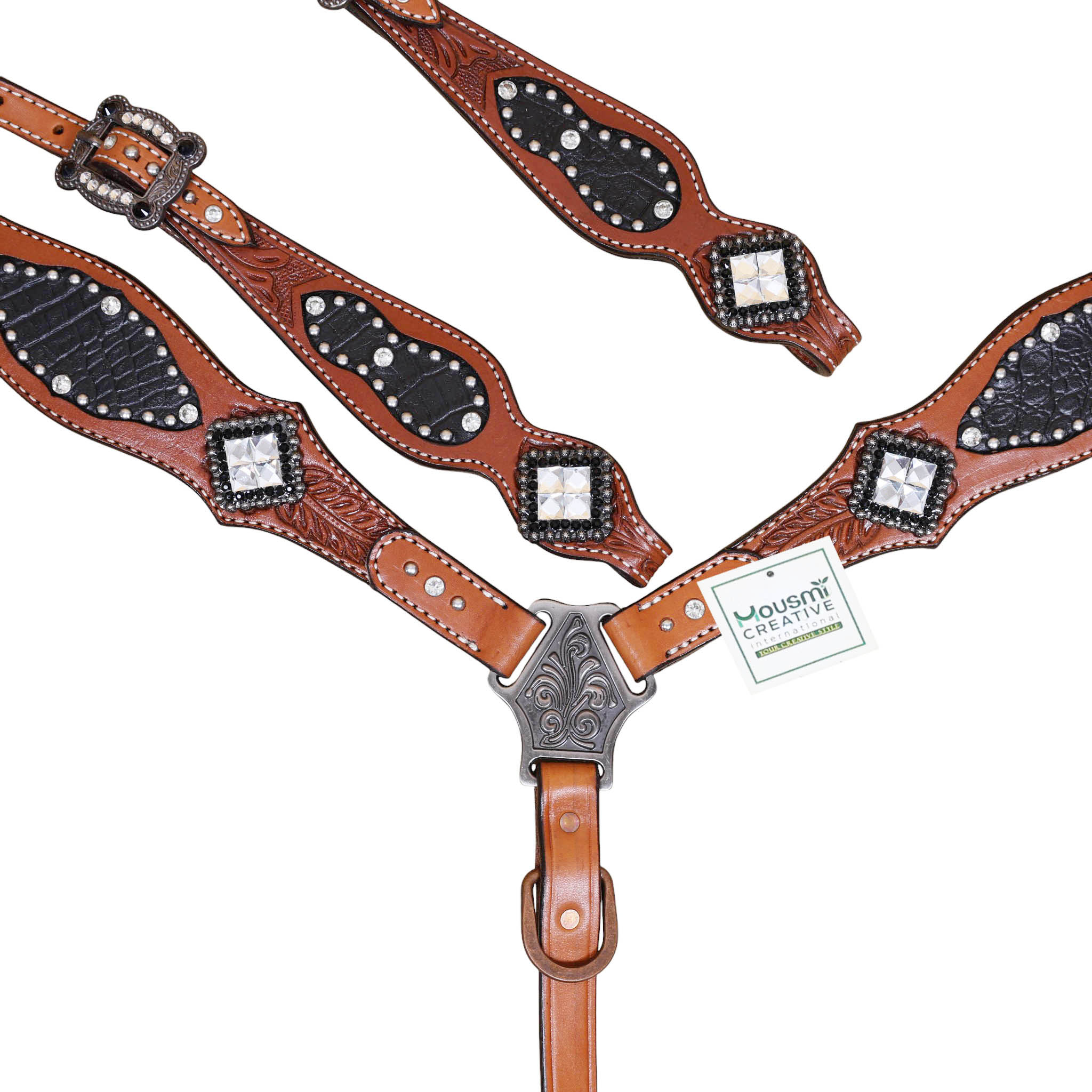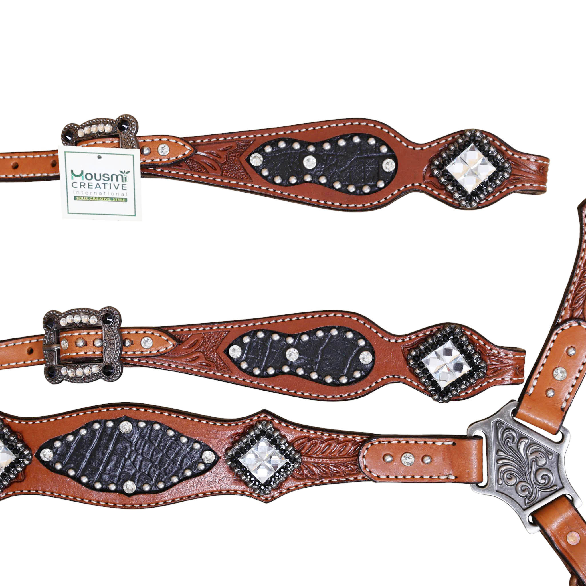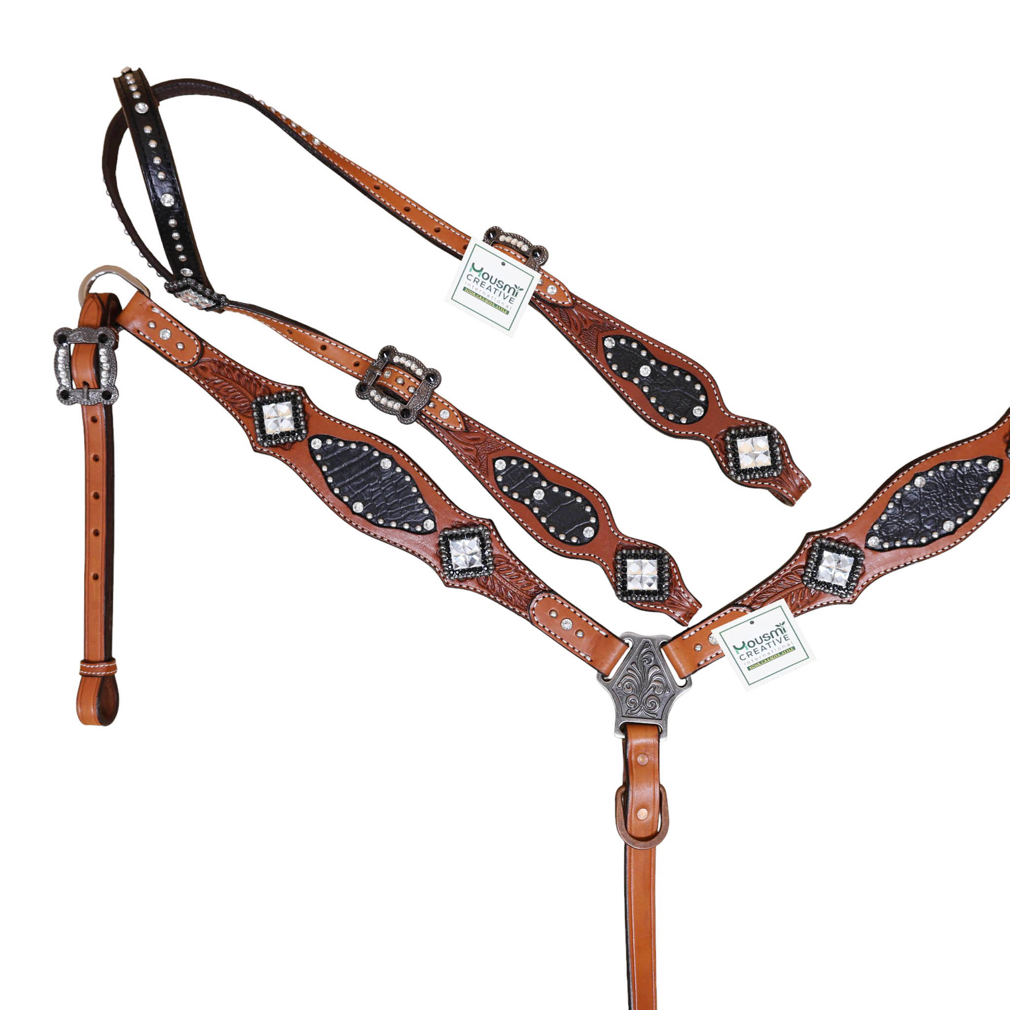 Headstall Type: Headstall and Breast Collar tack Set decorated Black Alligator fashion with black alligator inlay decorated with silver studs and white rhinestones with big Clear rhine stone square hardware on chestnut leather