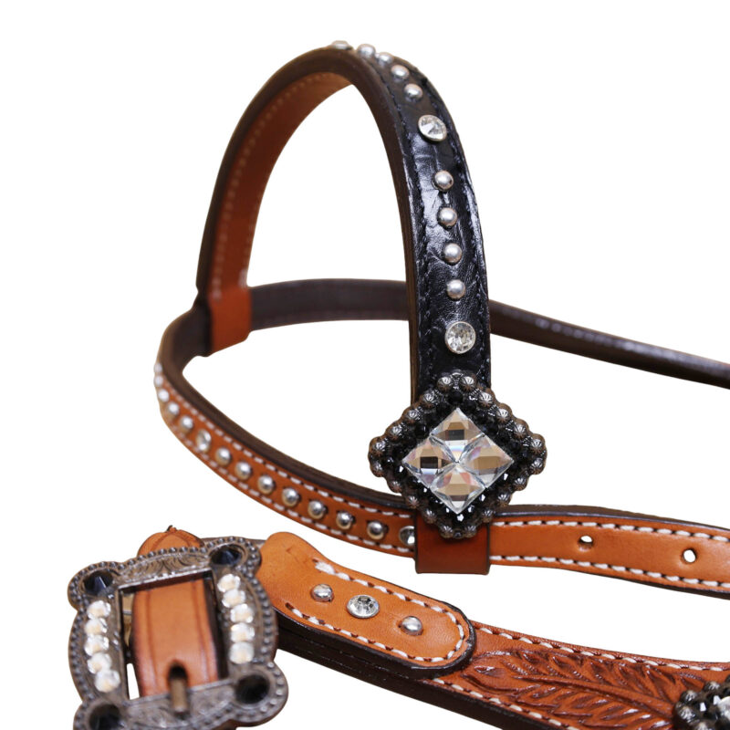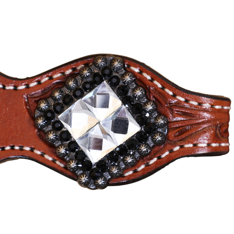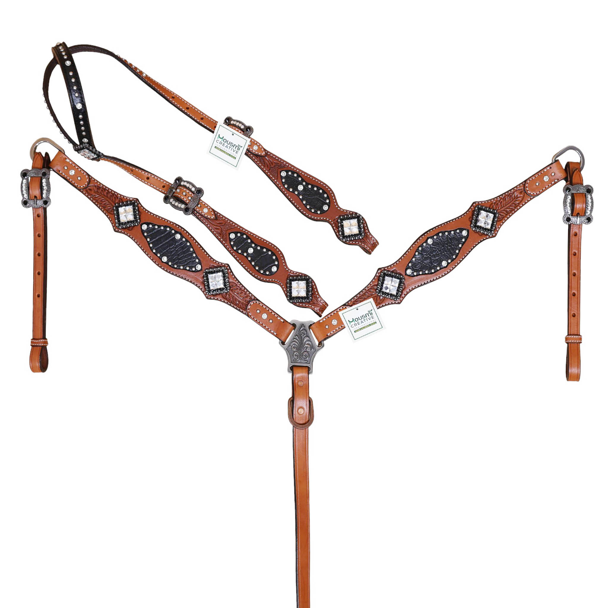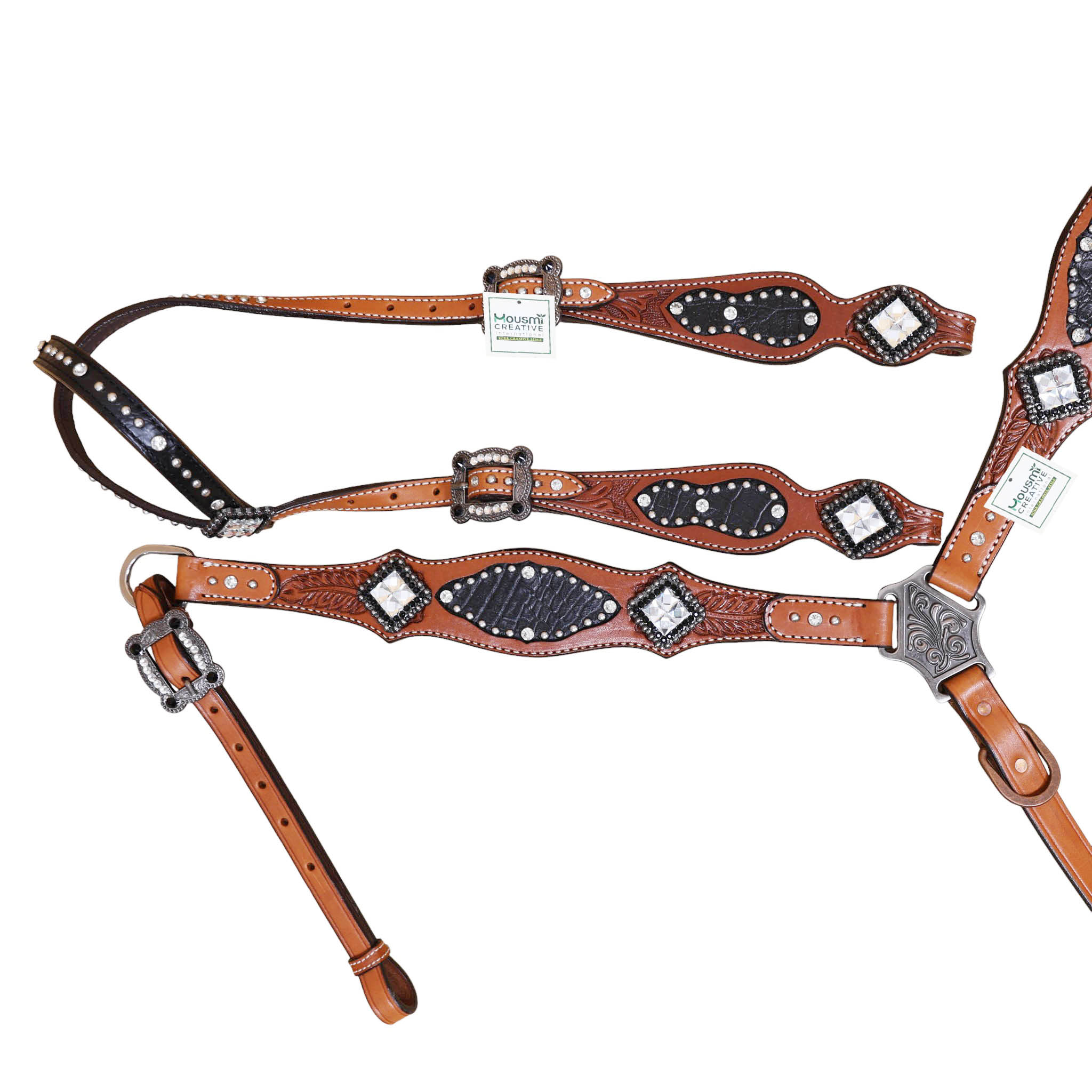 Headstall Type: Headstall and Breast Collar tack Set decorated Black Alligator fashion with black alligator inlay decorated with silver studs and white rhinestones with big Clear rhine stone square hardware on chestnut leather