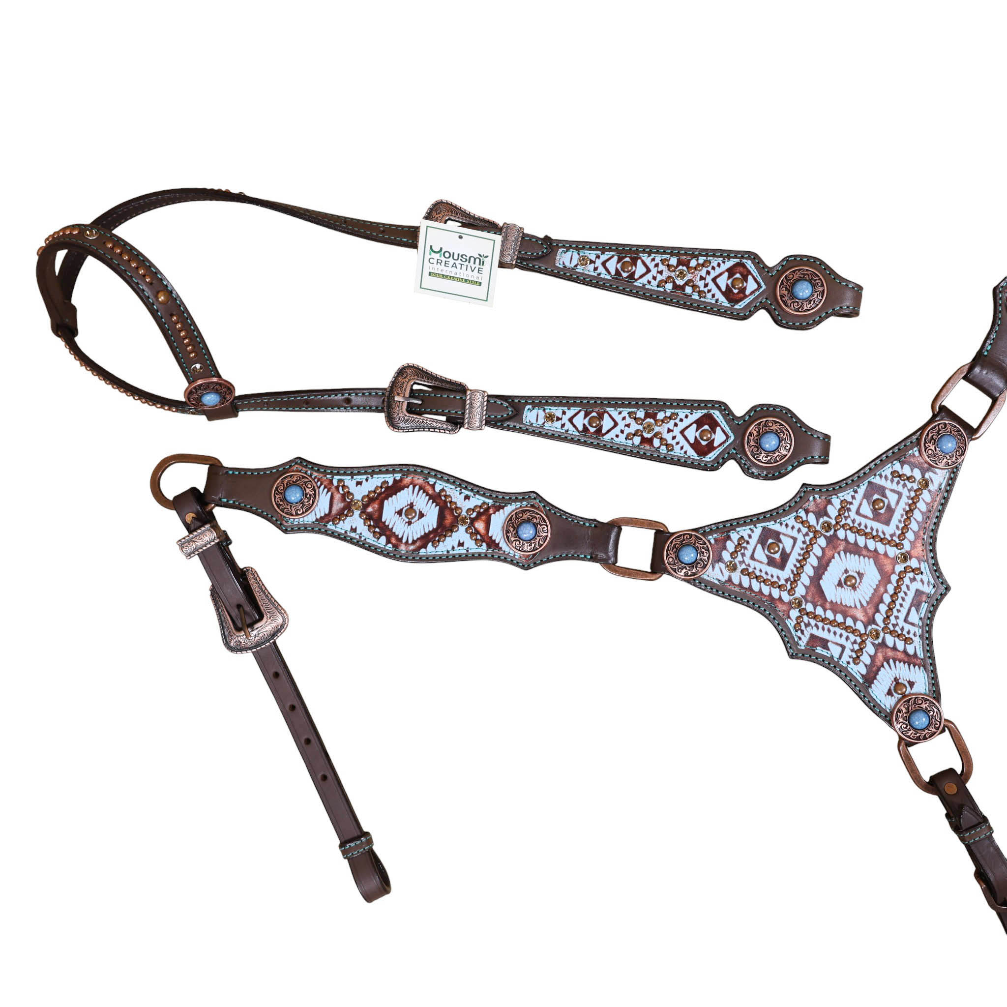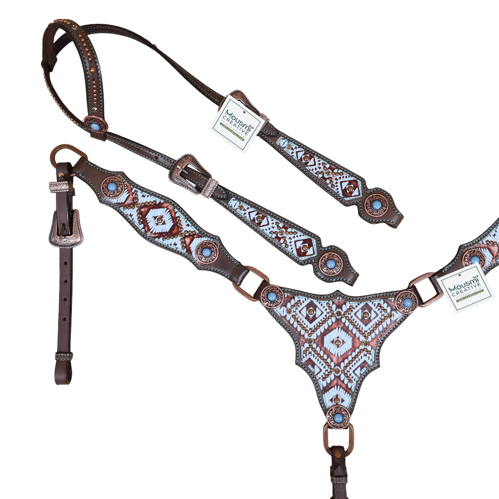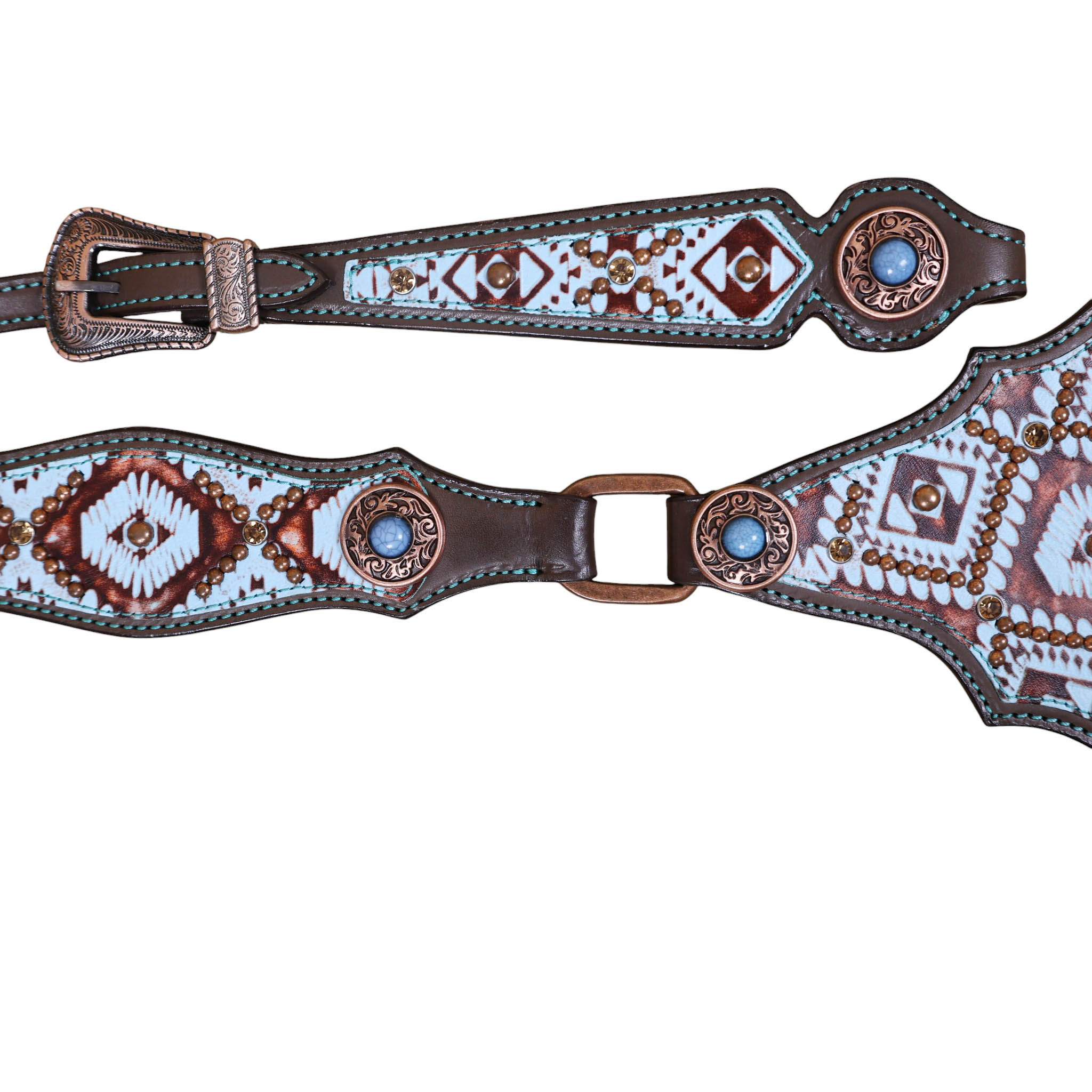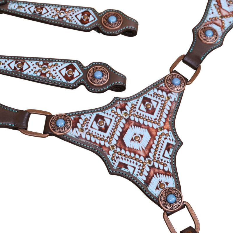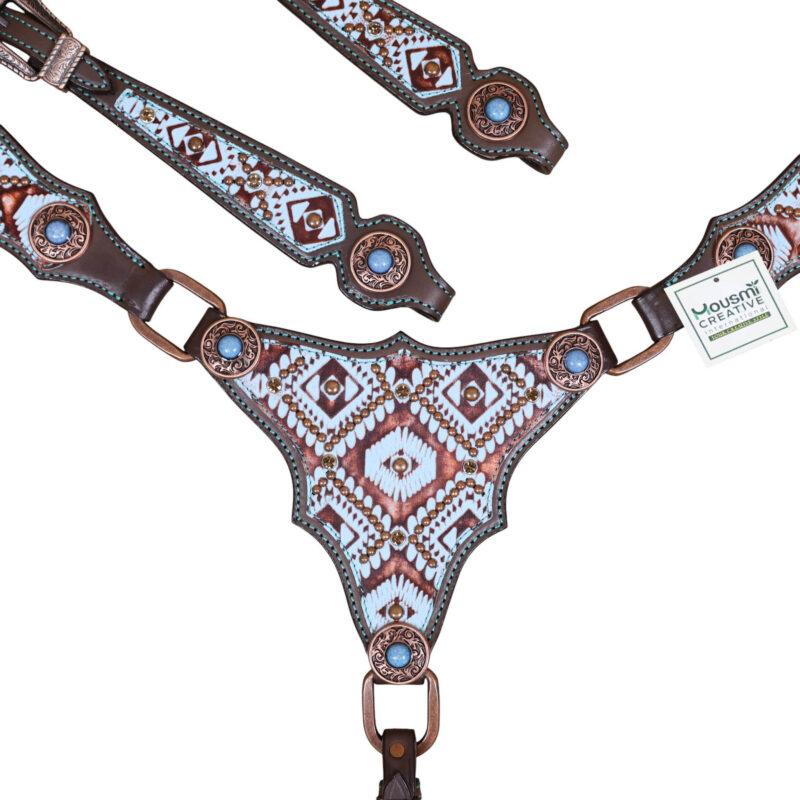 Headstall Type: Headstall and Breast Collar tack Set decorated with Copper slot concho with turquoise and copper embossed Aztec print with copper studs decoration