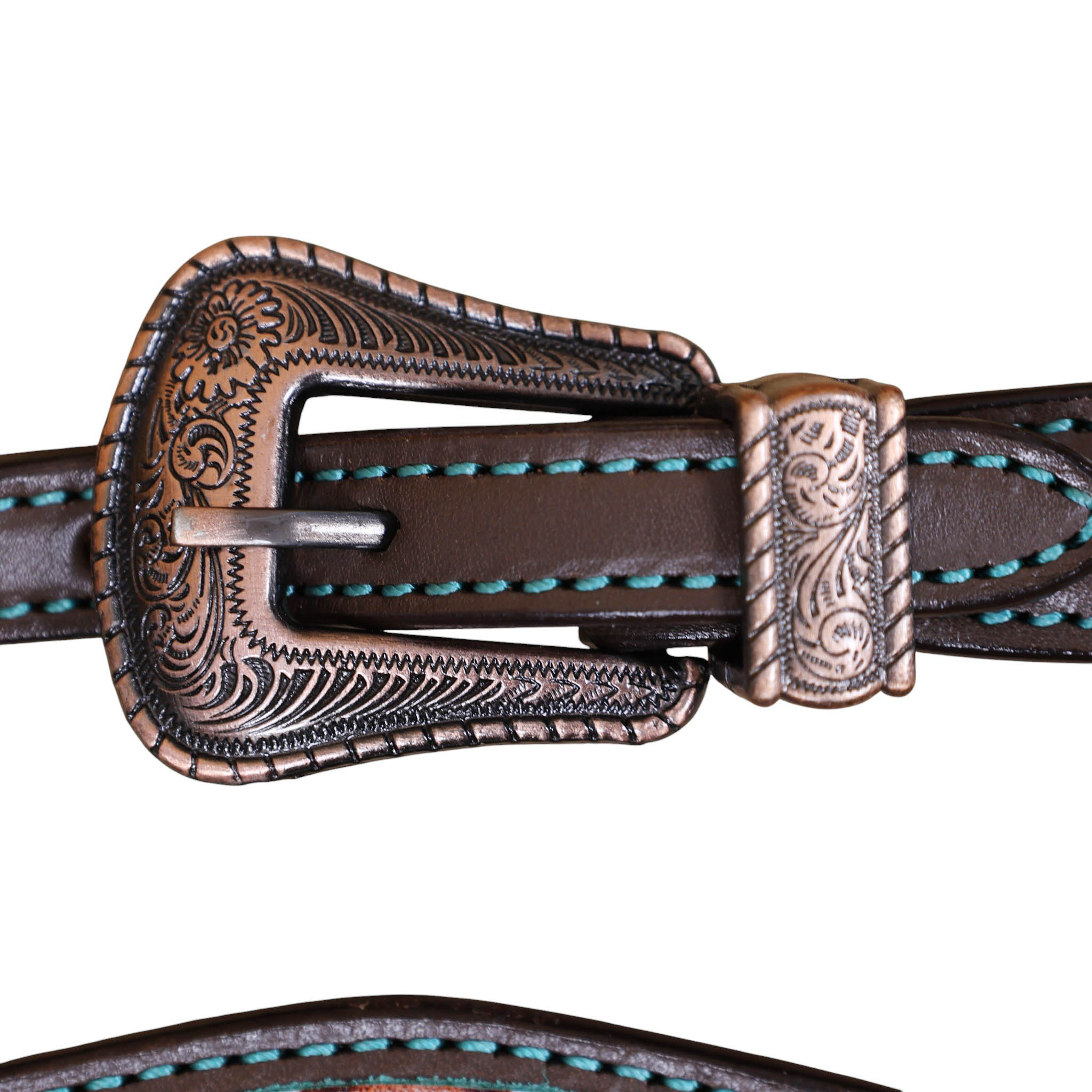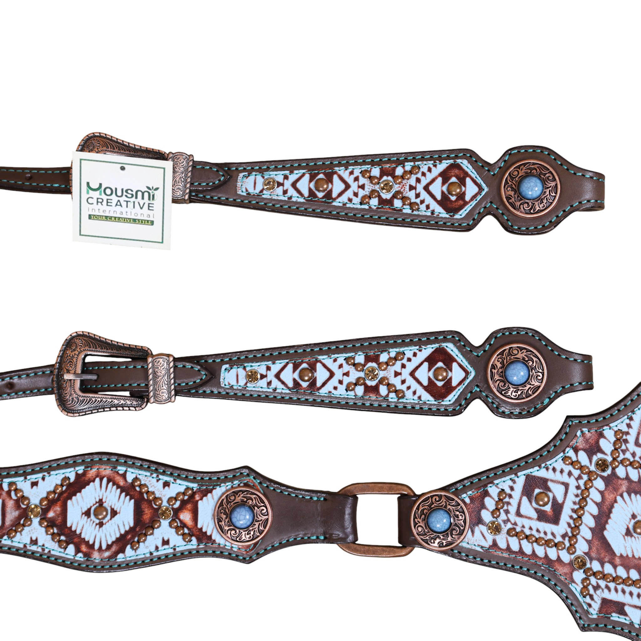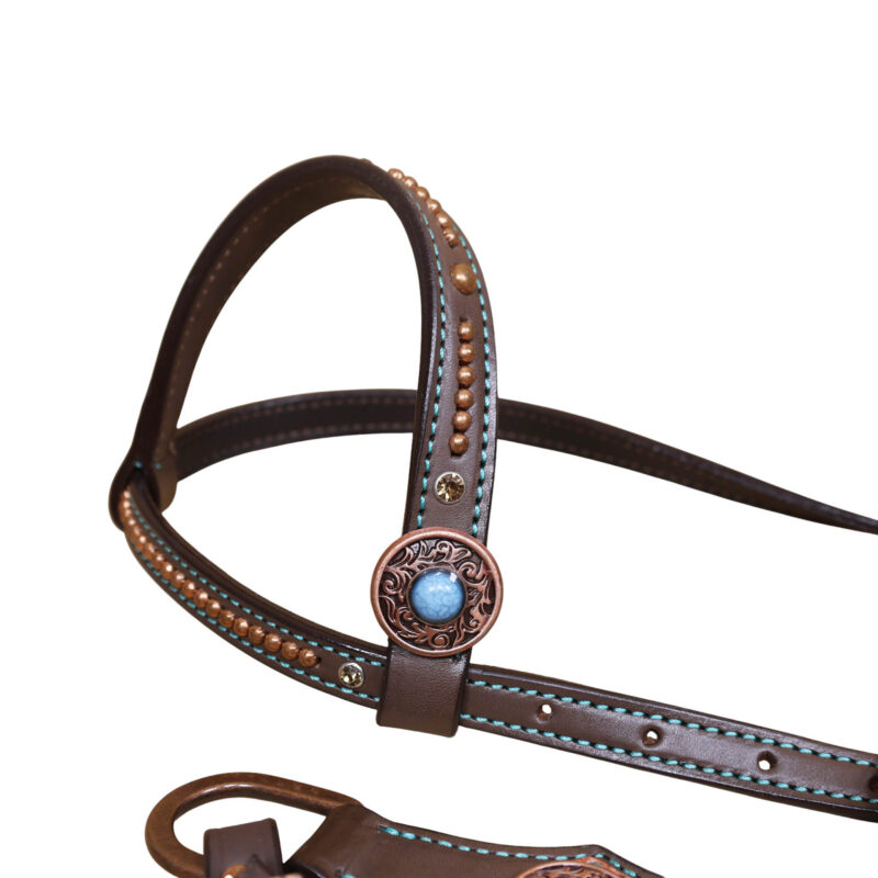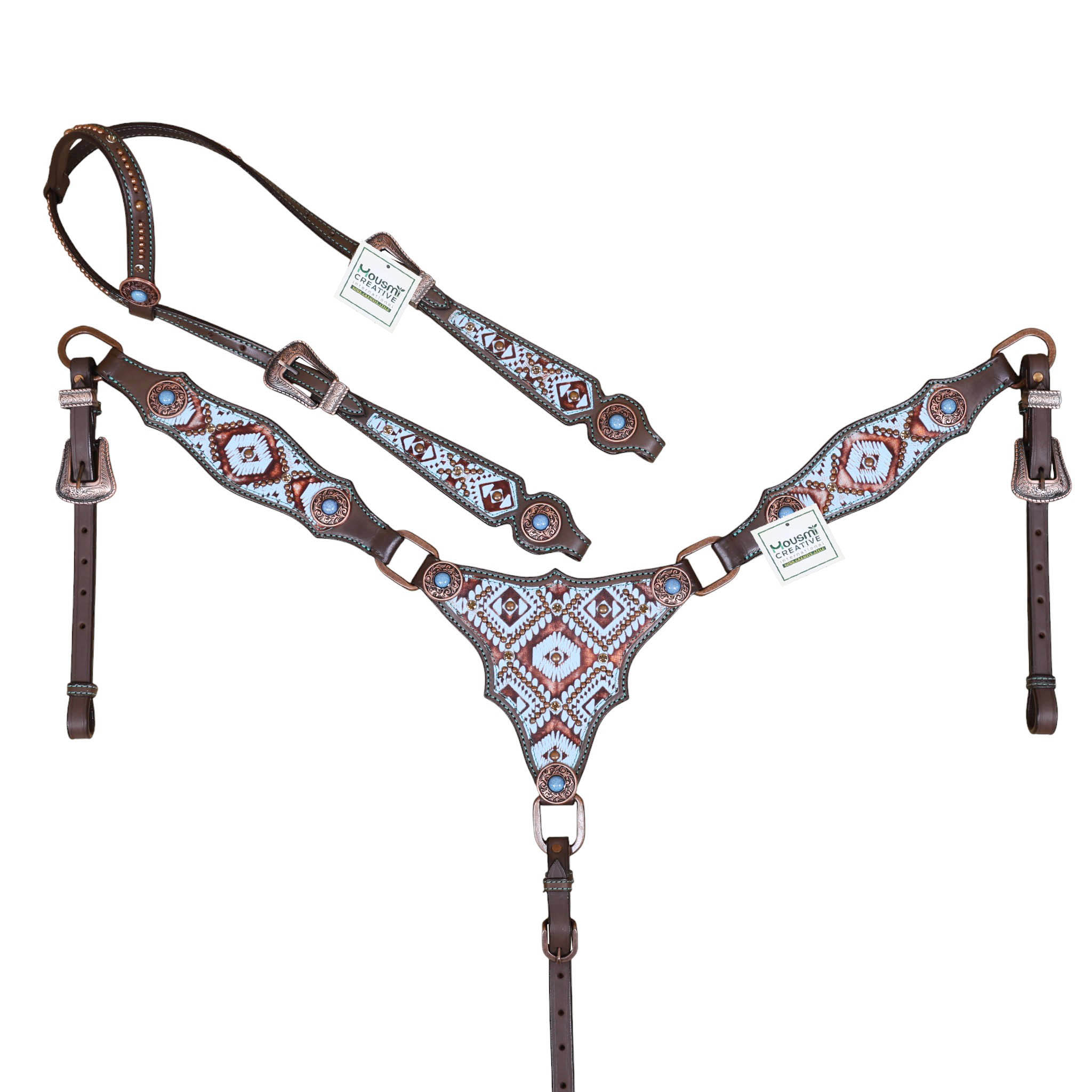 Headstall Type: Headstall and Breast Collar tack Set decorated with Copper slot concho with turquoise and copper embossed Aztec print with copper studs decoration