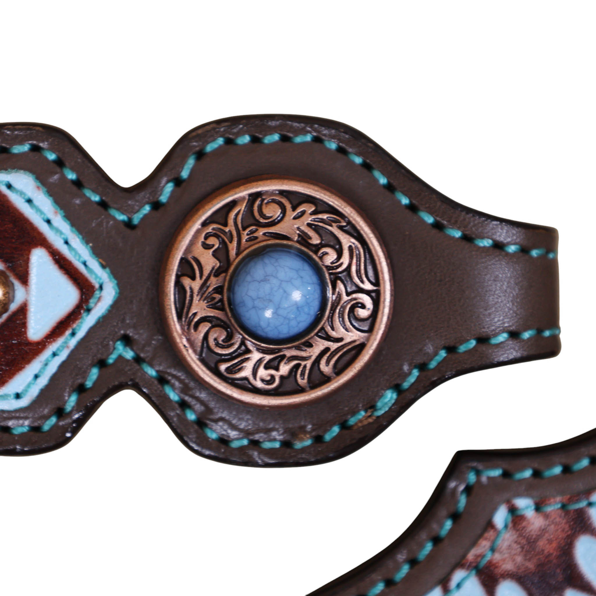 decorated with Copper slot concho with turquoise and copper embossed aztec print with copper studs decoration