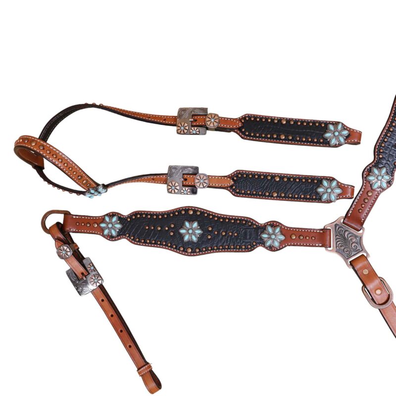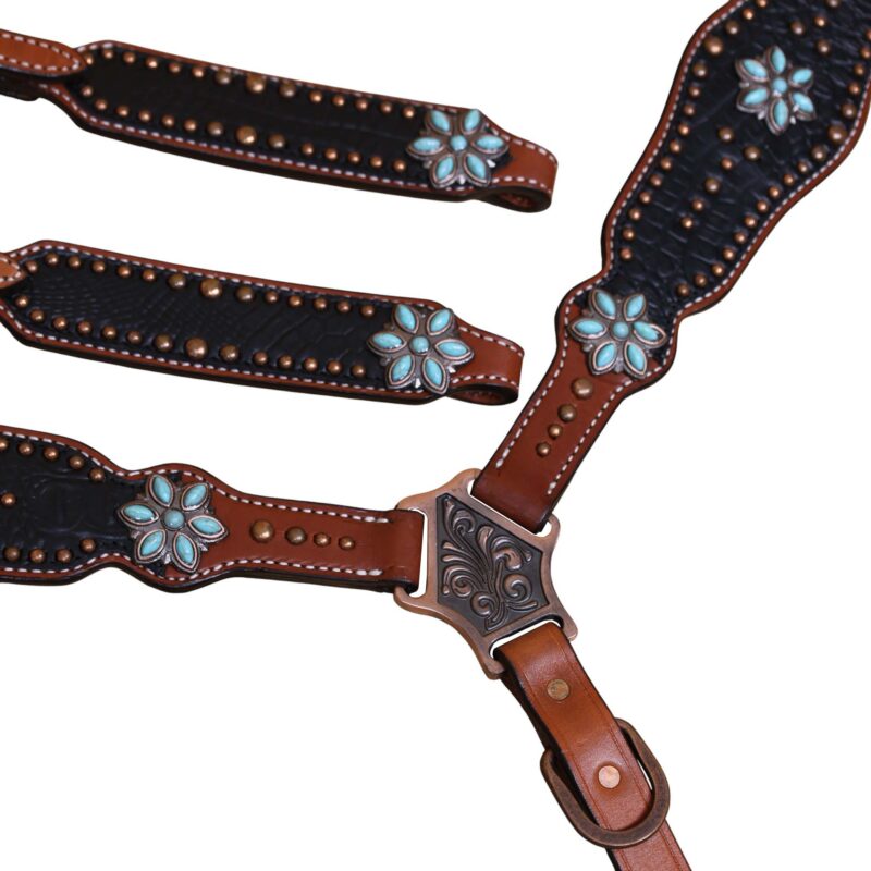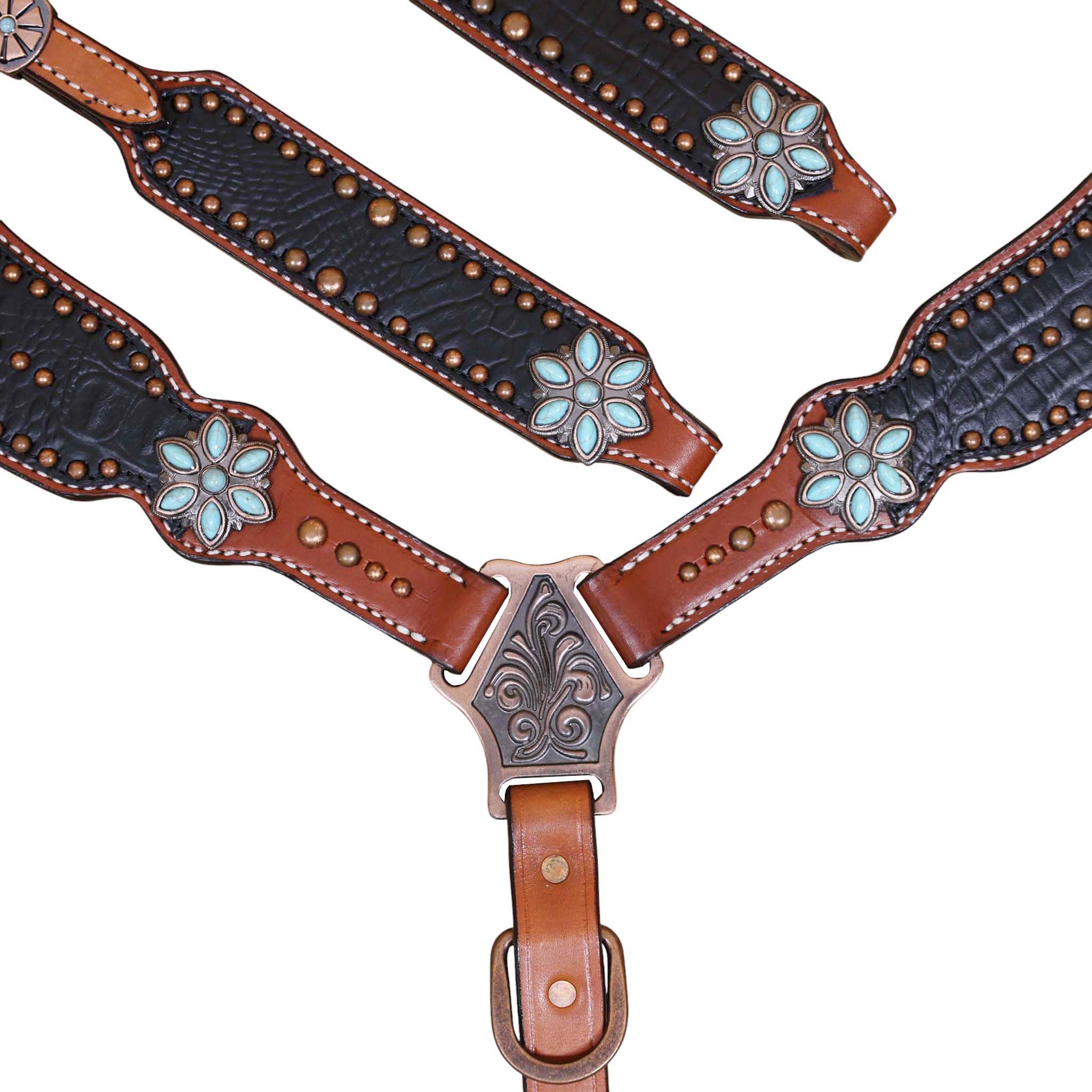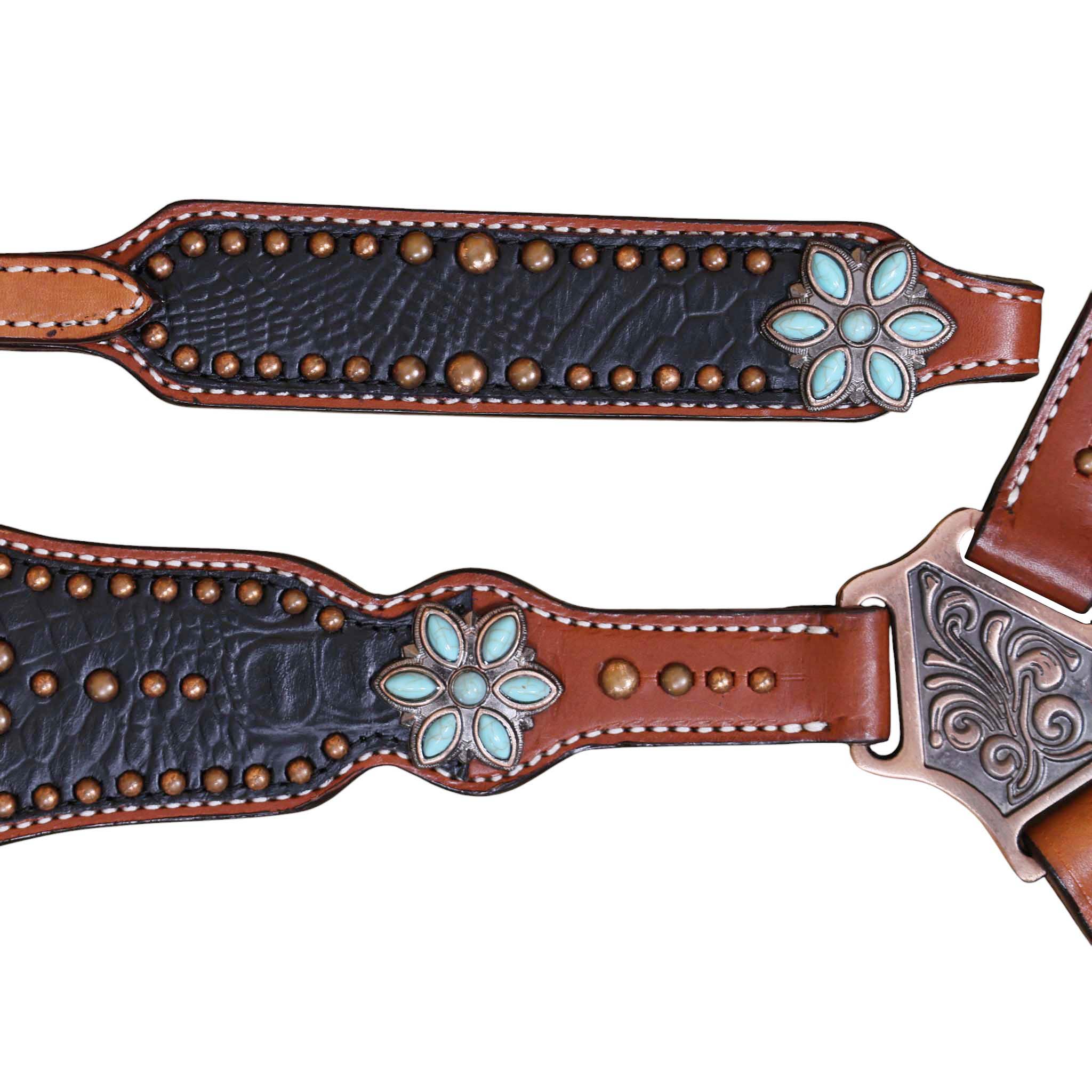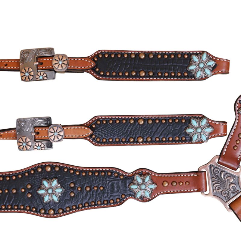 Headstall Type: Headstall and Breast Collar tack Set decorated Black Alligator fashion with copper studs and turquoise stone flower concho on chestnut leather