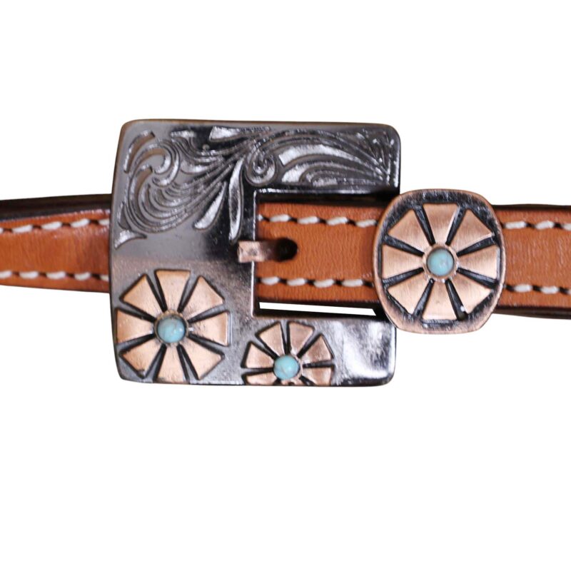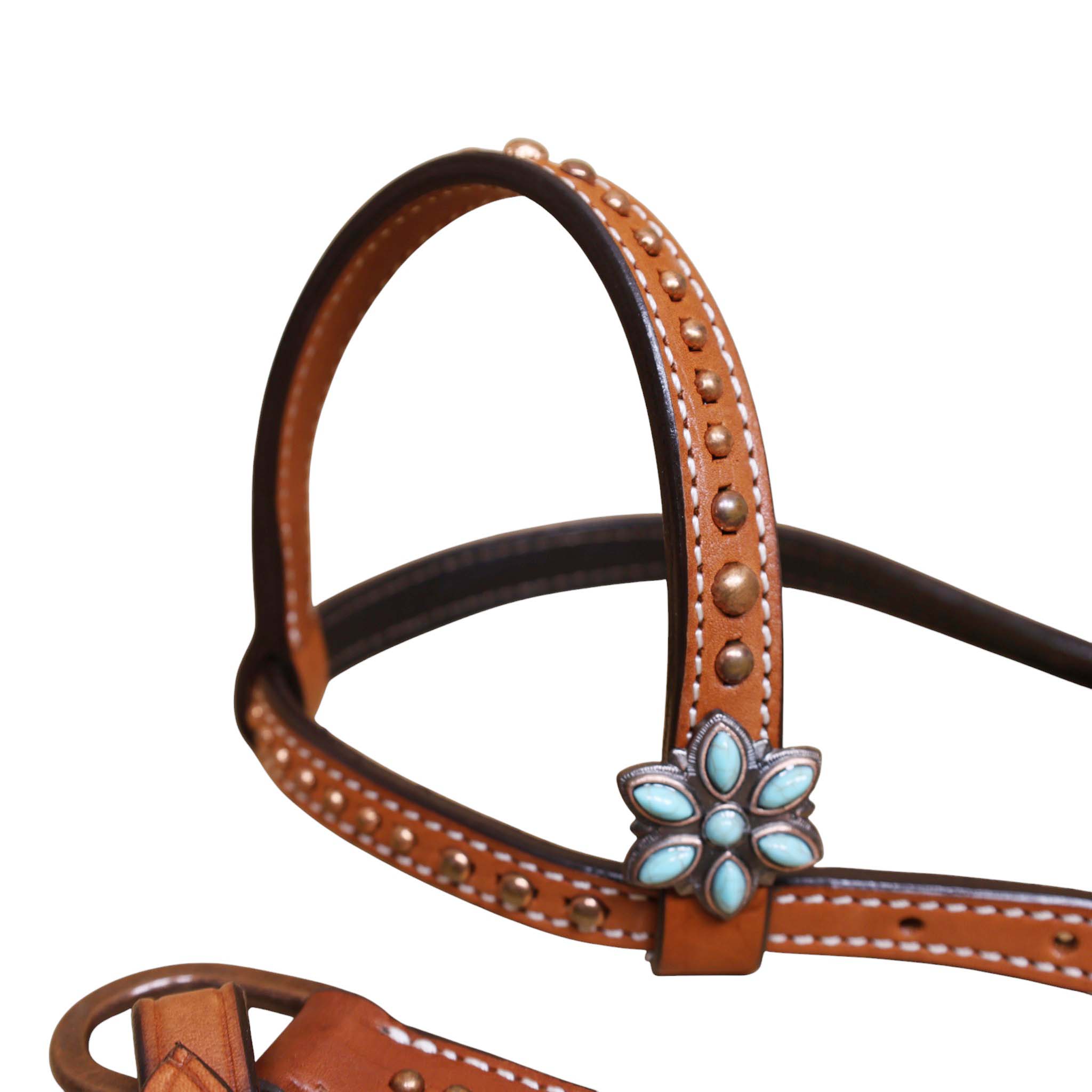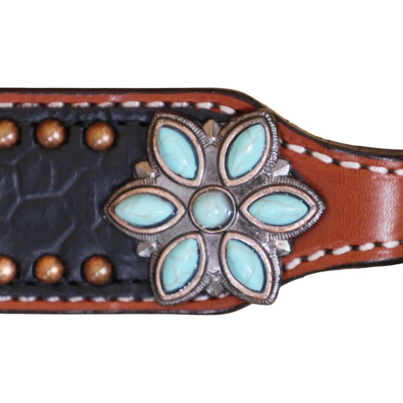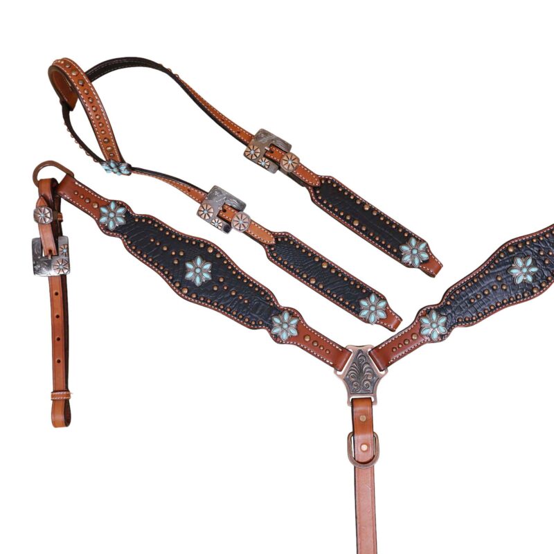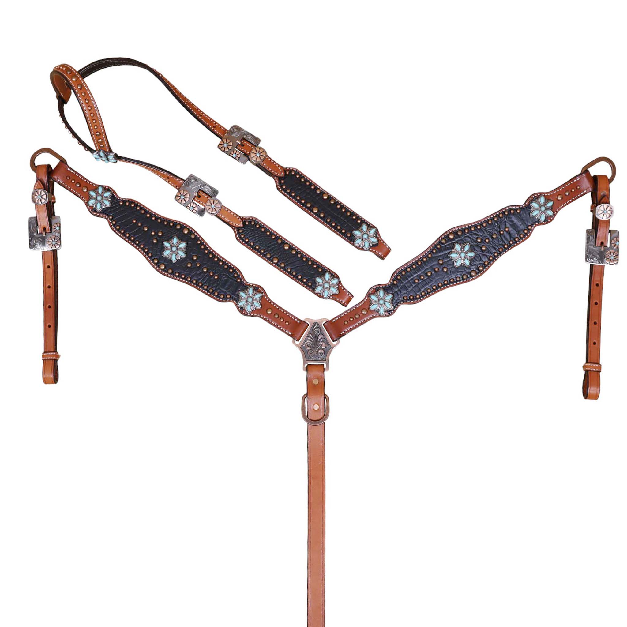 Headstall Type: Headstall and Breast Collar tack Set decorated Black Alligator fashion with copper studs and turquoise stone flower concho on chestnut leather
