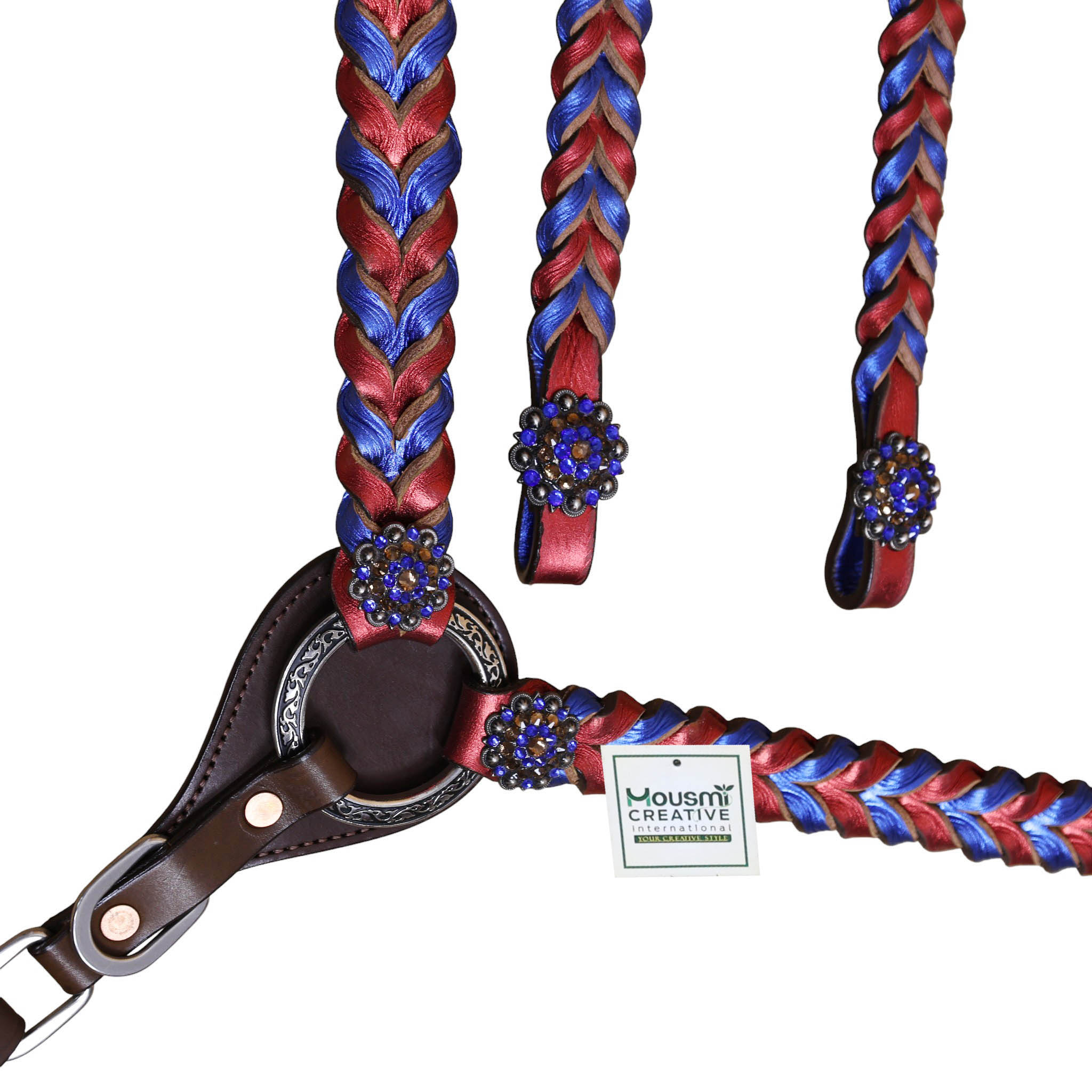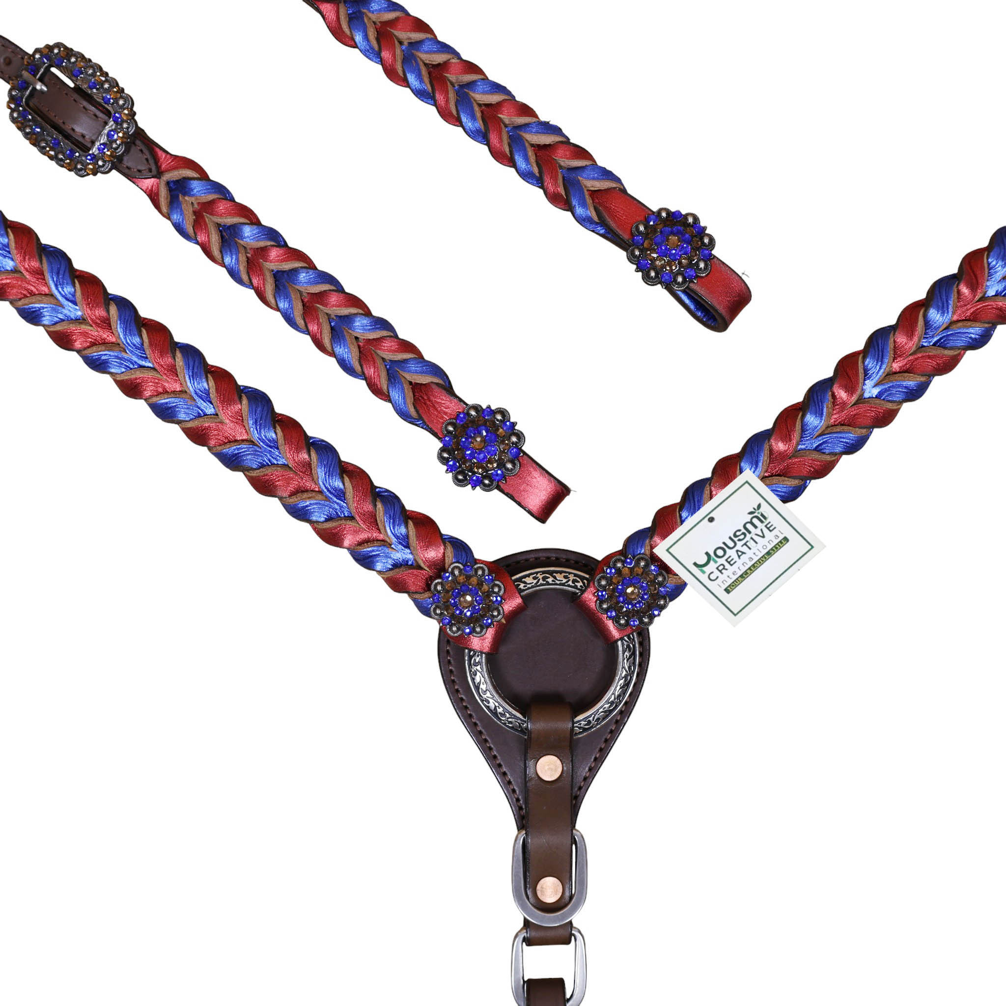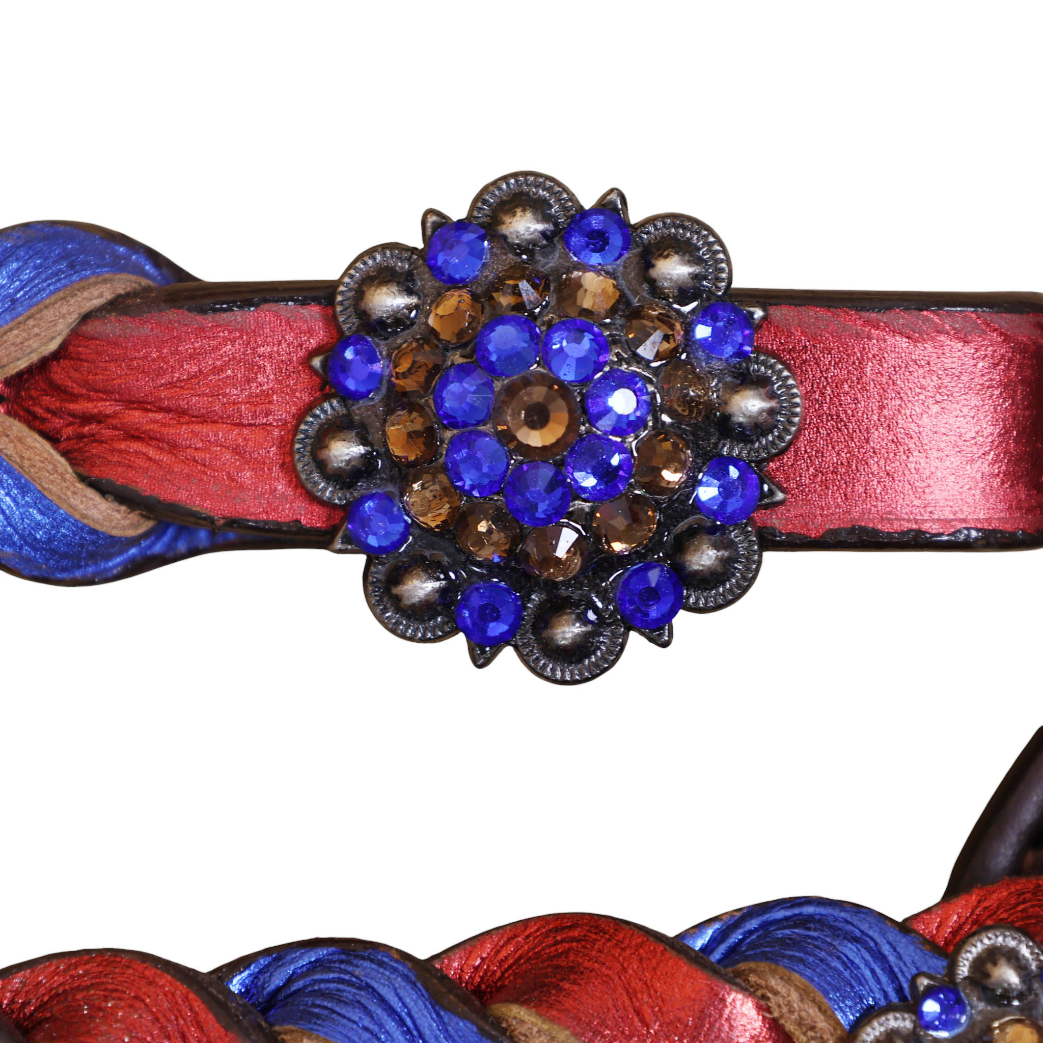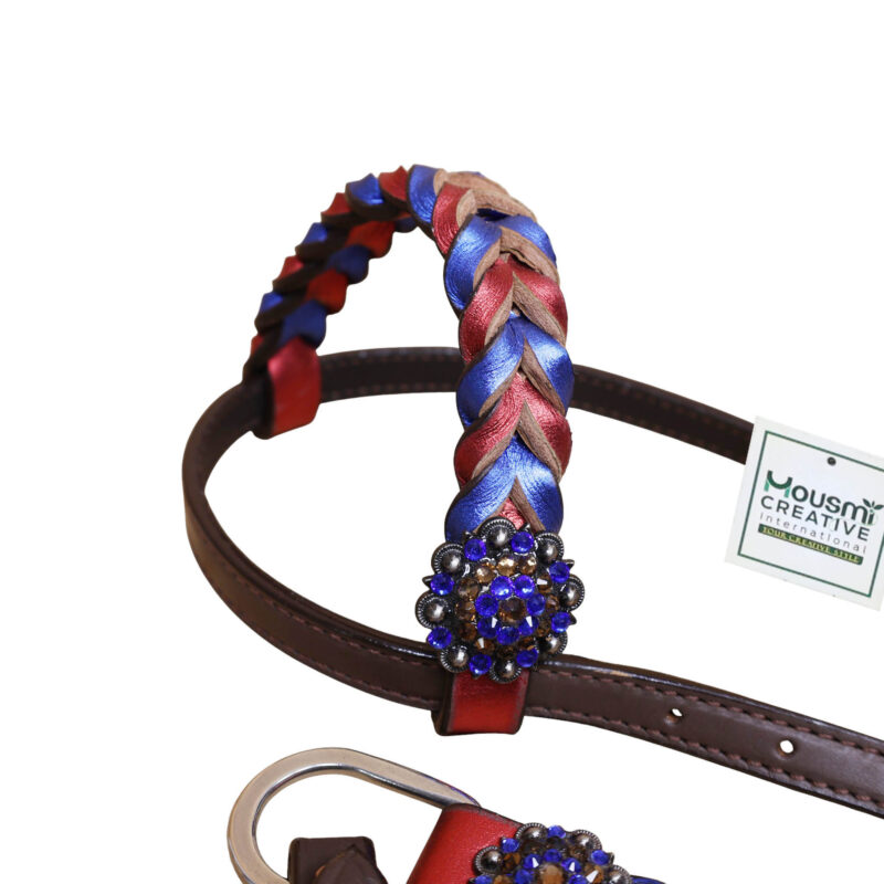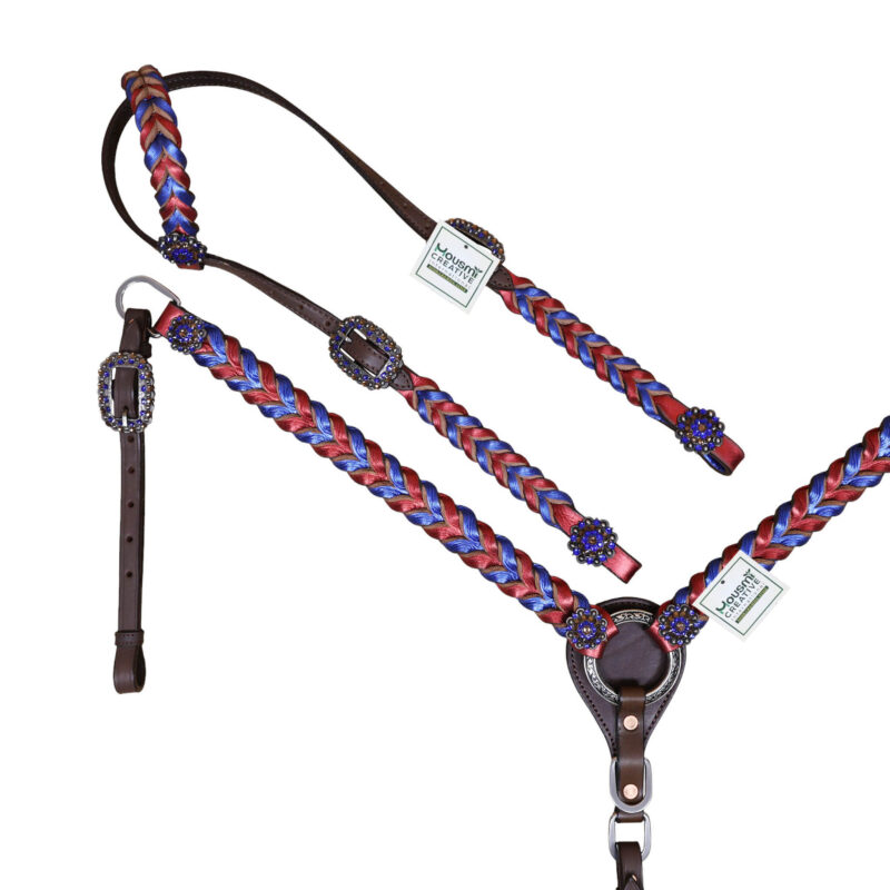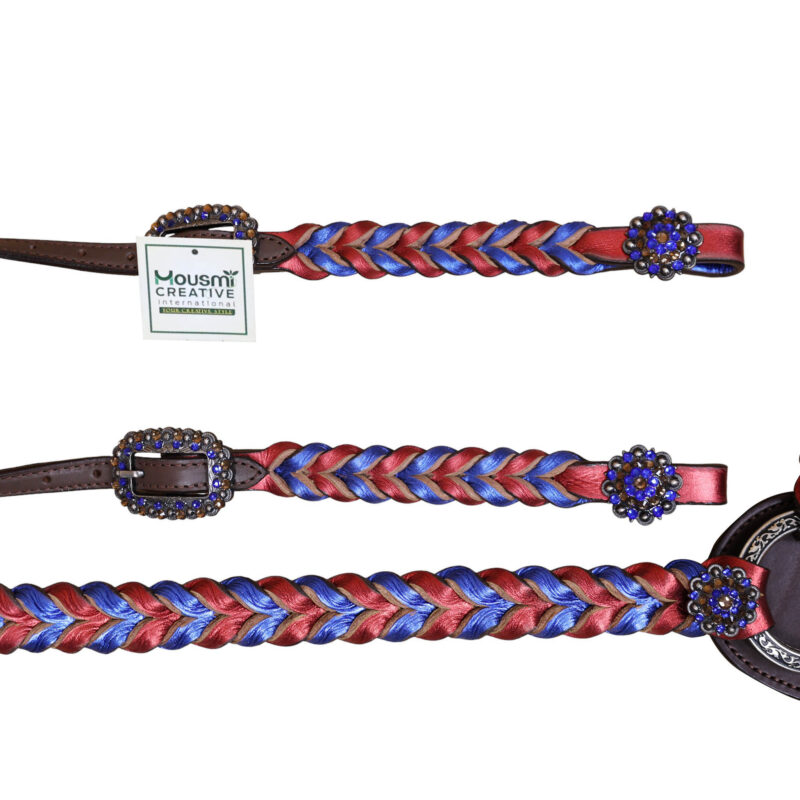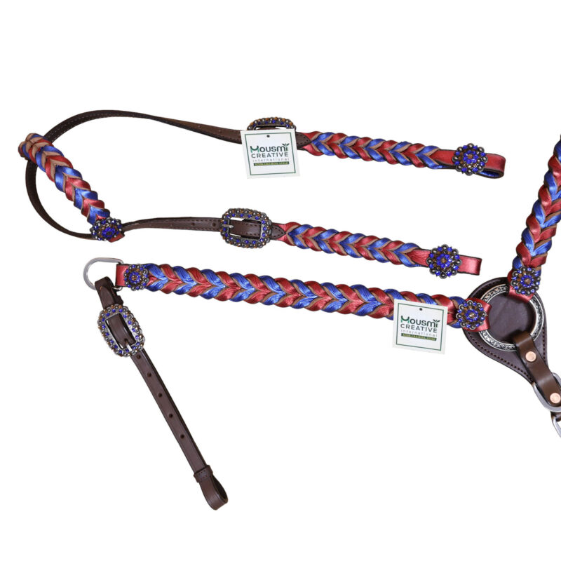 Headstall Type: Headstall and Breast Collar tack Set decorated with Royal and Red metallic Leather twisted braiding on tack set with rhinestone berry conchoes