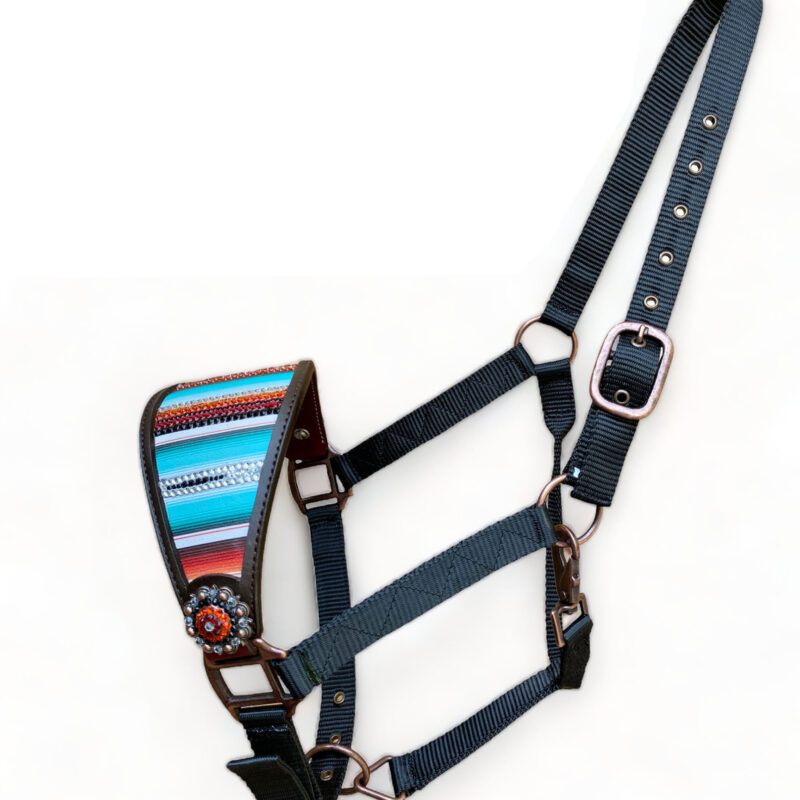 - Bronc Halter Decorated with orange turquoise scrap print with stone on them