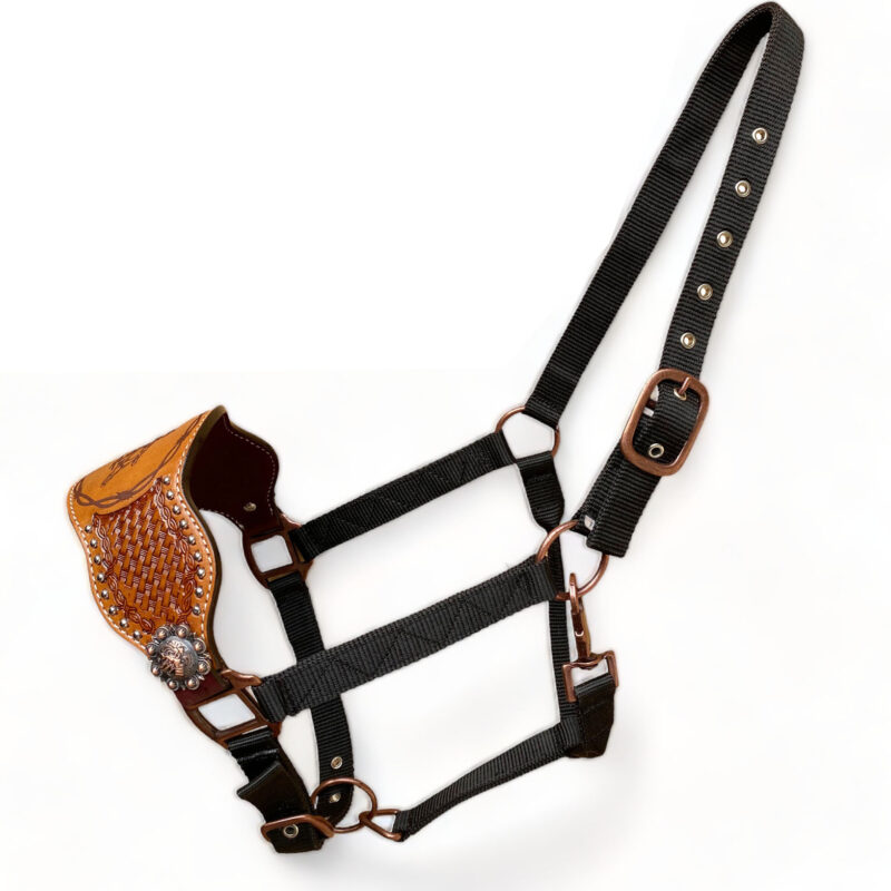 - Bronc Halter Decorated with basket tooling with BOB wire engraving with barrel horse