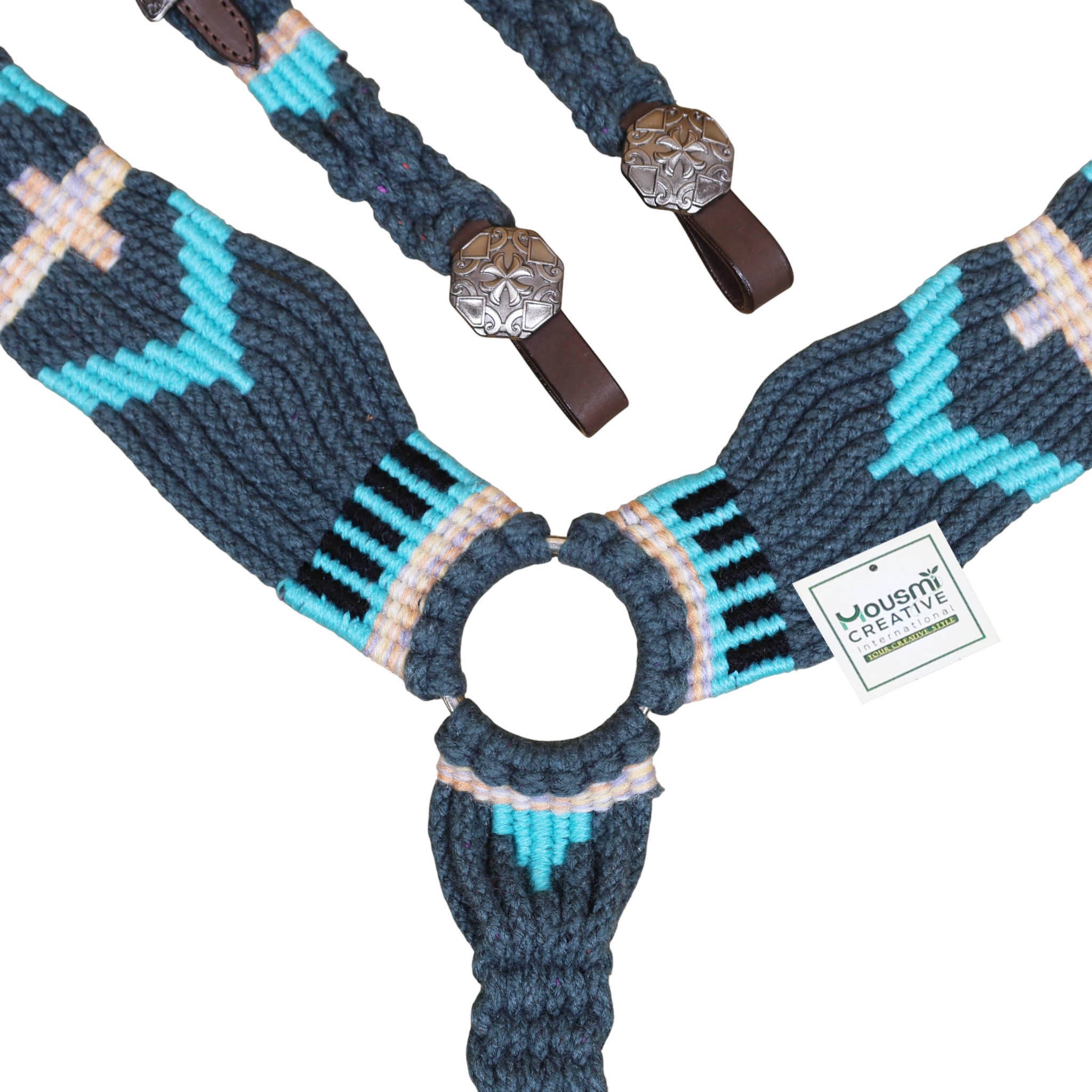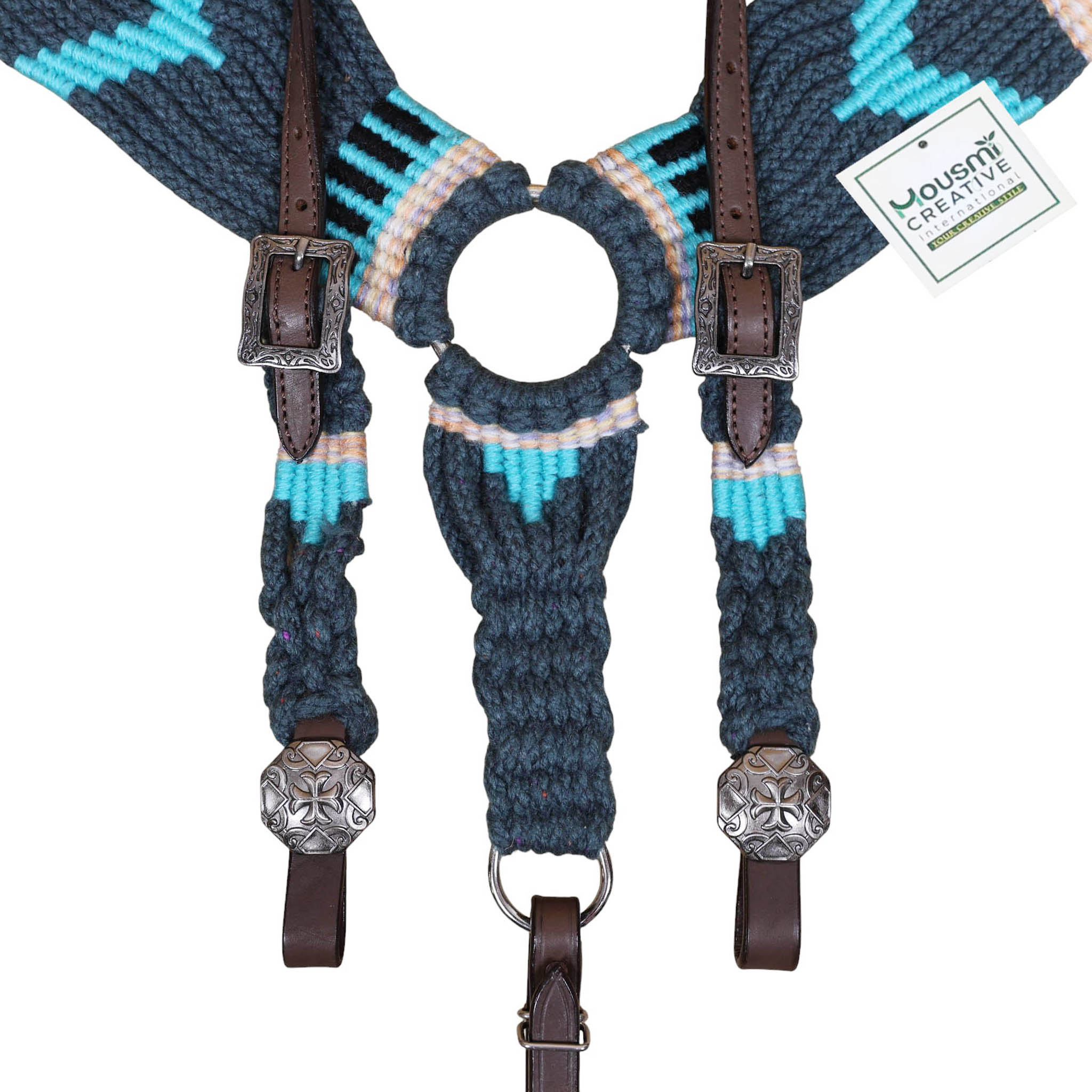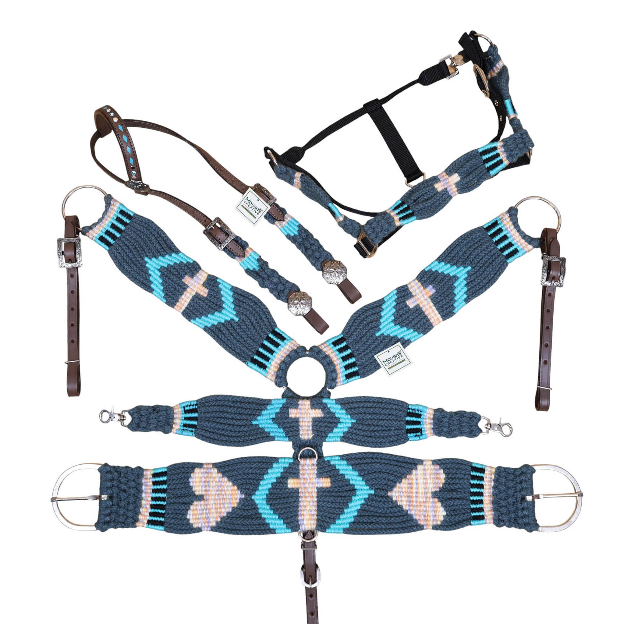 Dark Grey, Sky Blue and Biege Mohair Headstall tack set decorated with matching front girth 32″ on argentina leather (HSBM 114502)