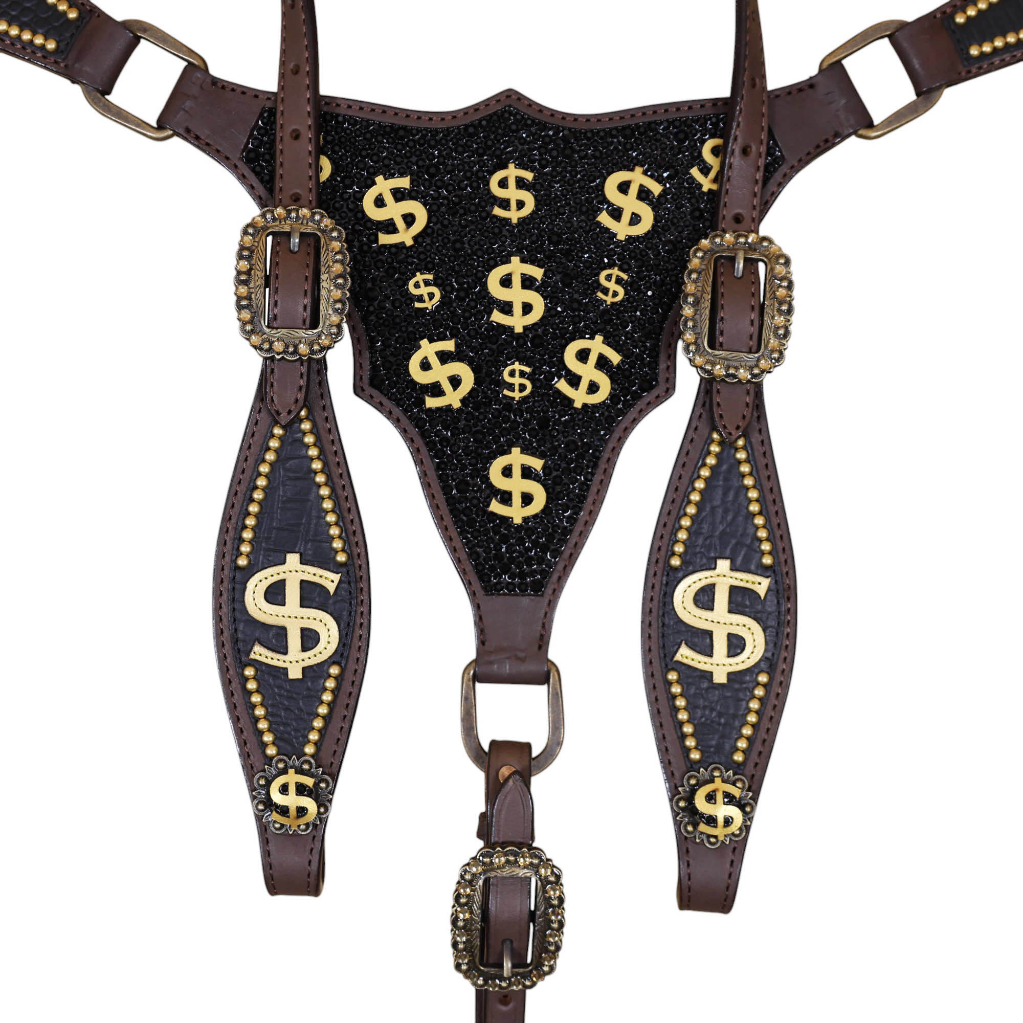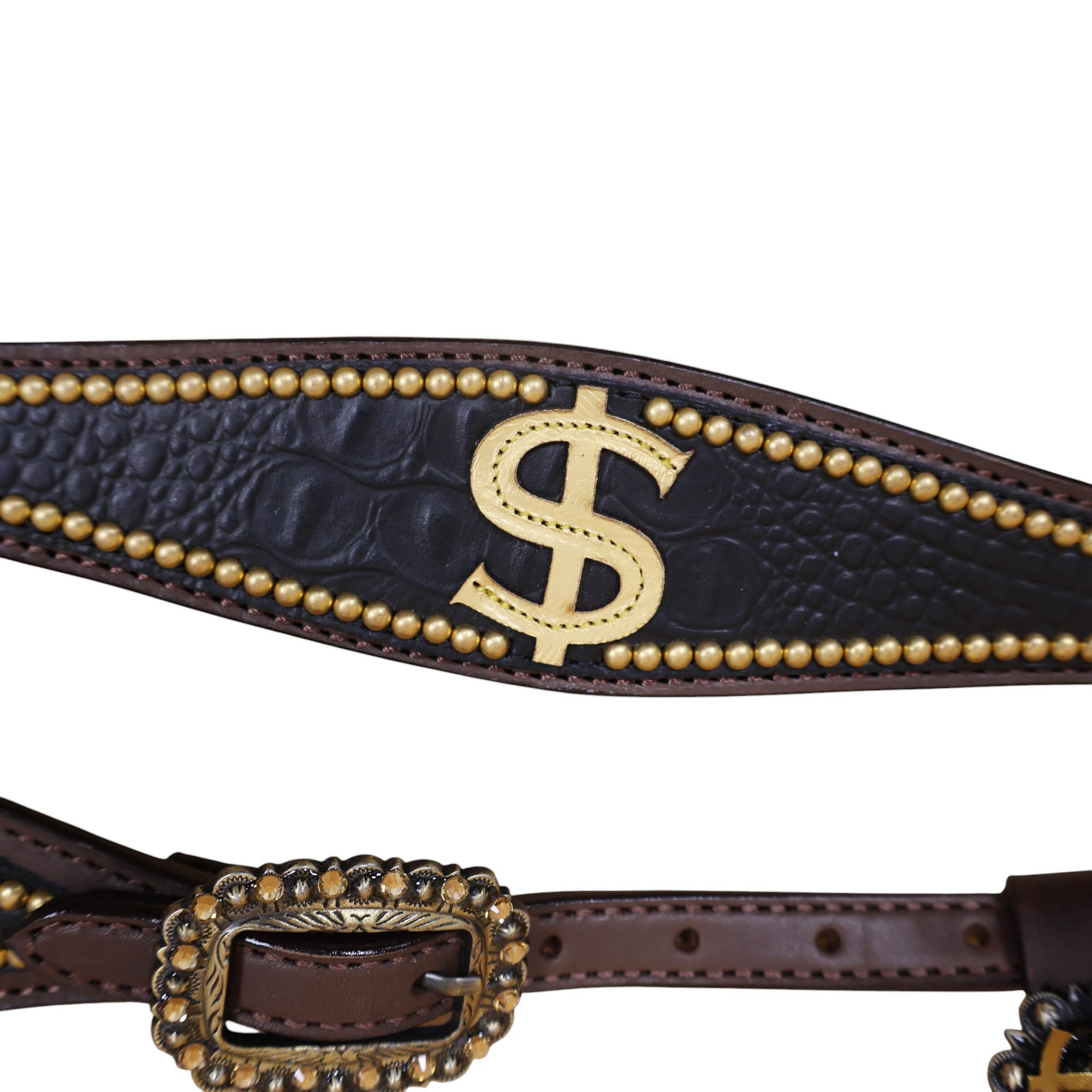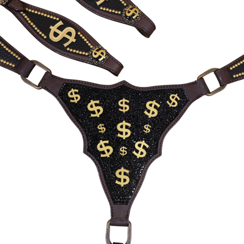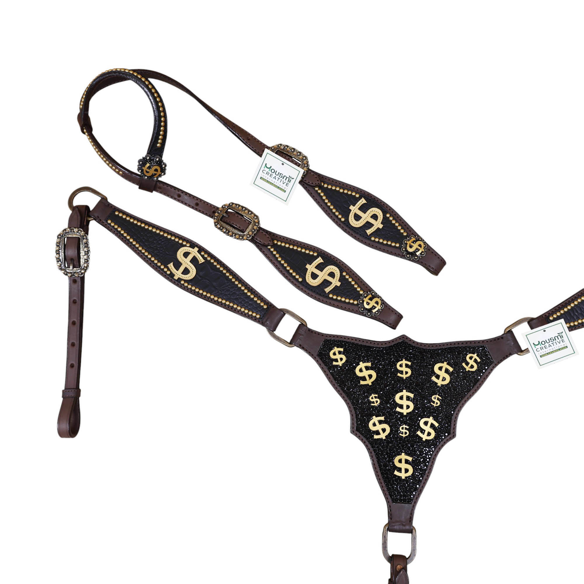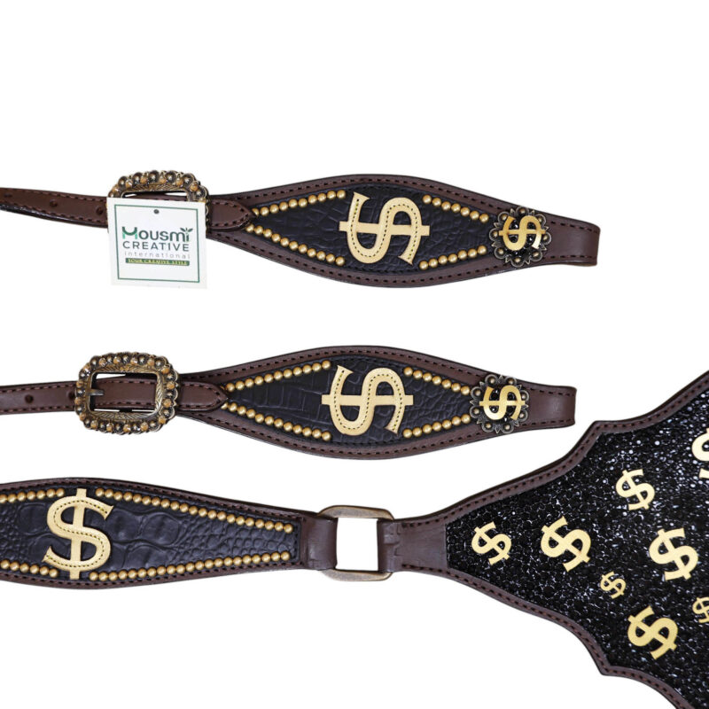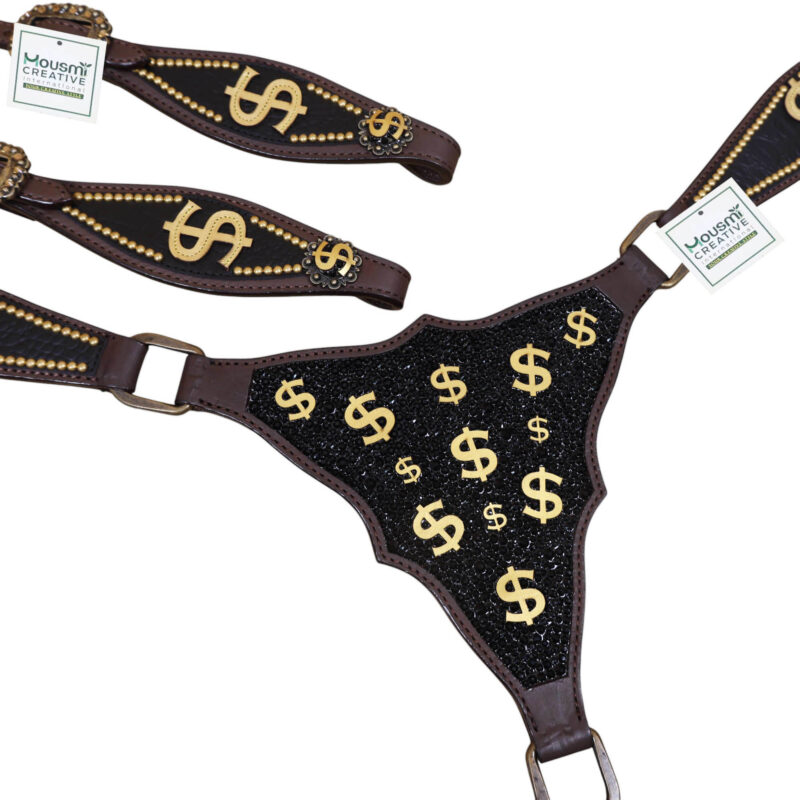 Headstall Type: Premium Western Show Headstall & Breast Collar Set – Dazzle Handcrafted Leather Horse Tack – Rodeo Show Bridle decorated tack set with 3D golden dollar $ Sign with golden studs and dazzle work on gladiator style breast collar
