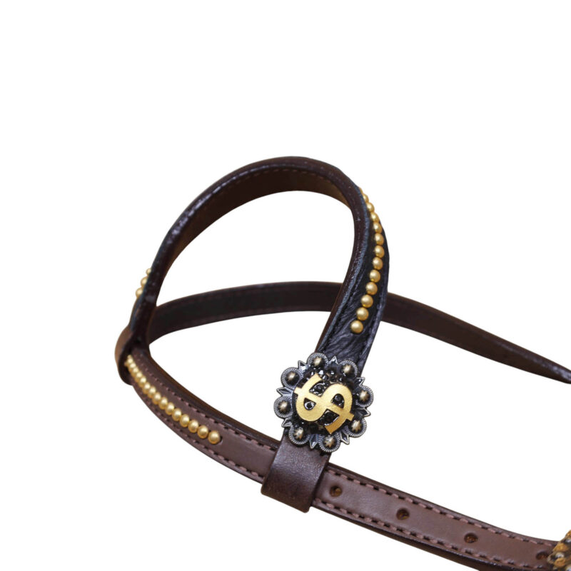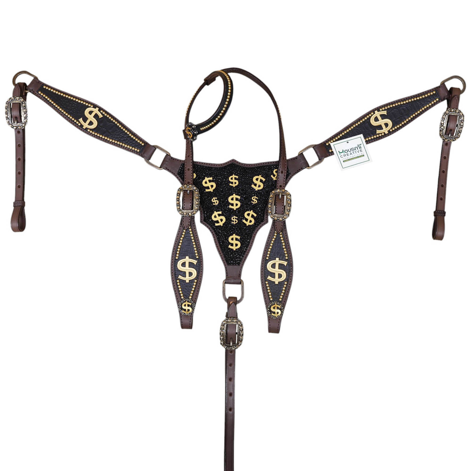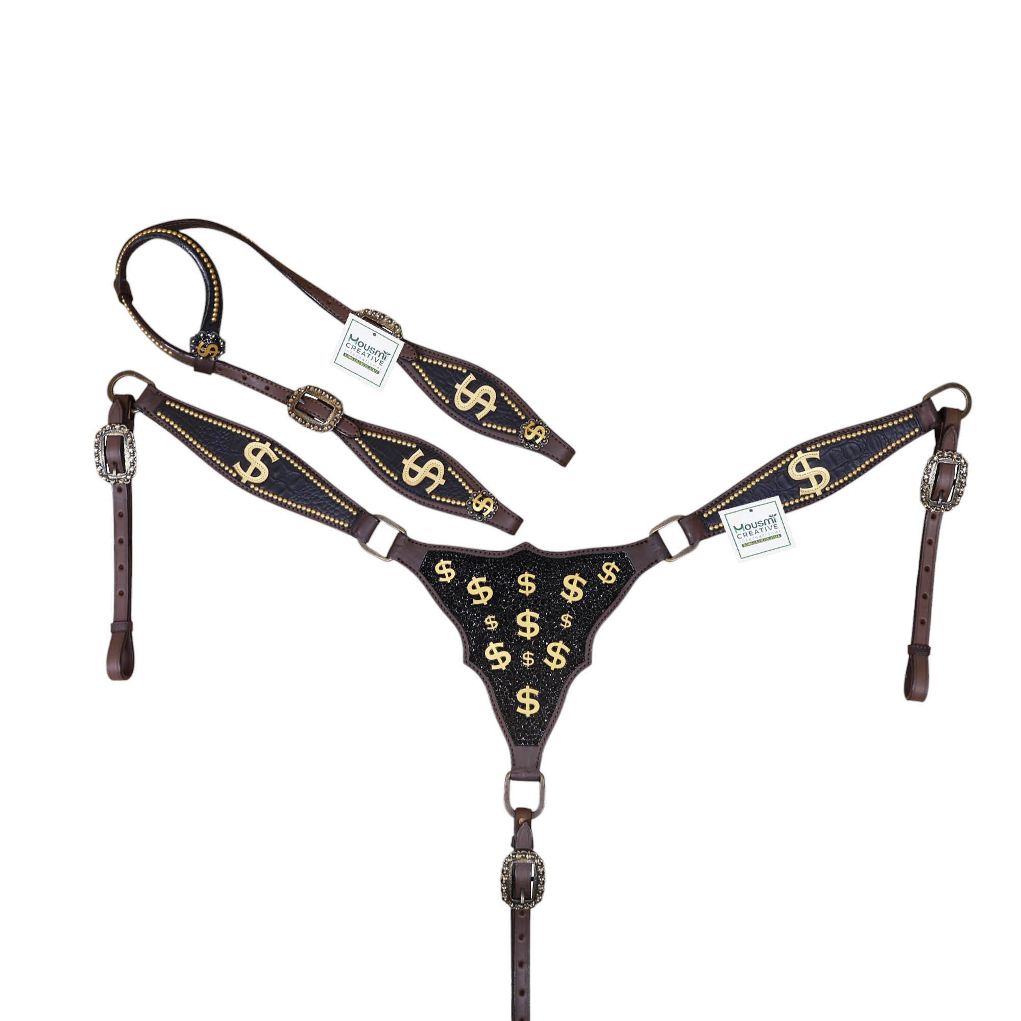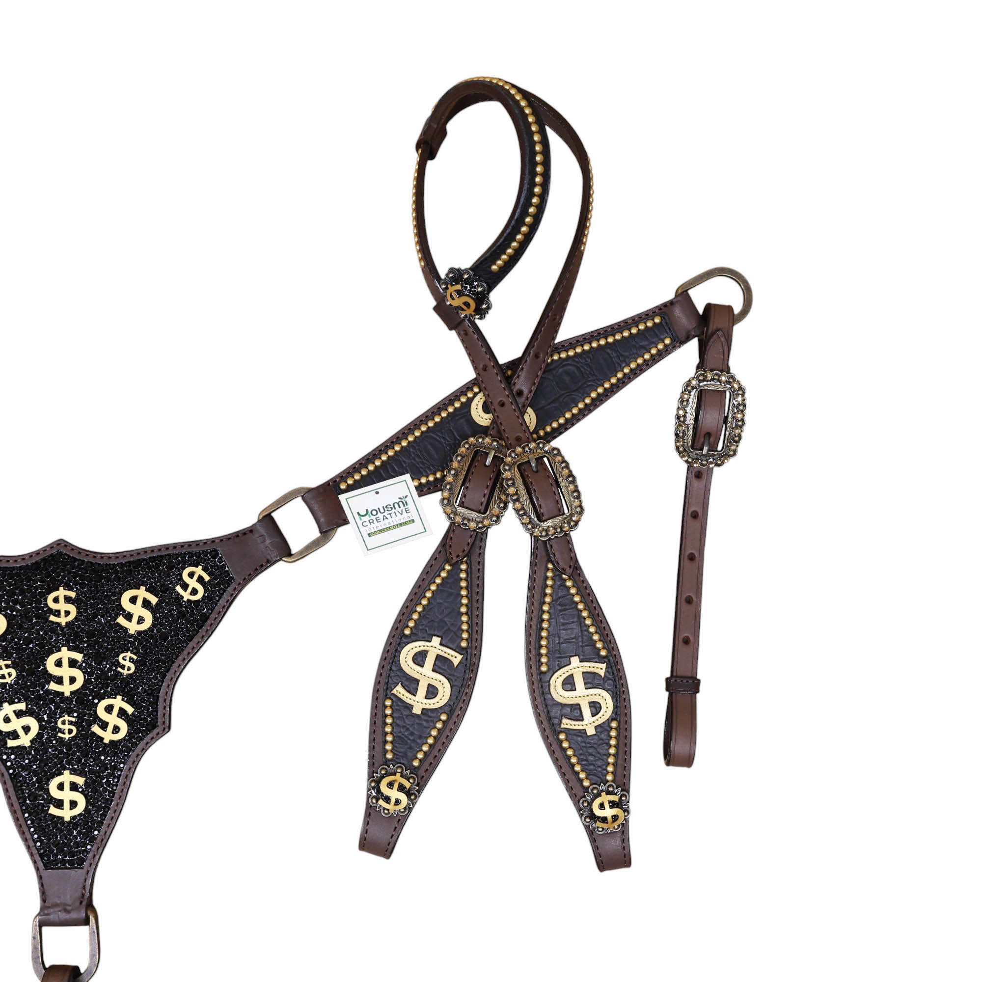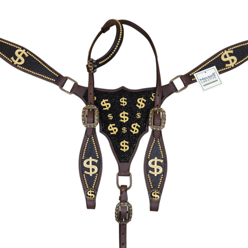 Headstall Type: Premium Western Show Headstall & Breast Collar Set – Dazzle Handcrafted Leather Horse Tack – Rodeo Show Bridle decorated tack set with 3D golden dollar $ Sign with golden studs and dazzle work on gladiator style breast collar