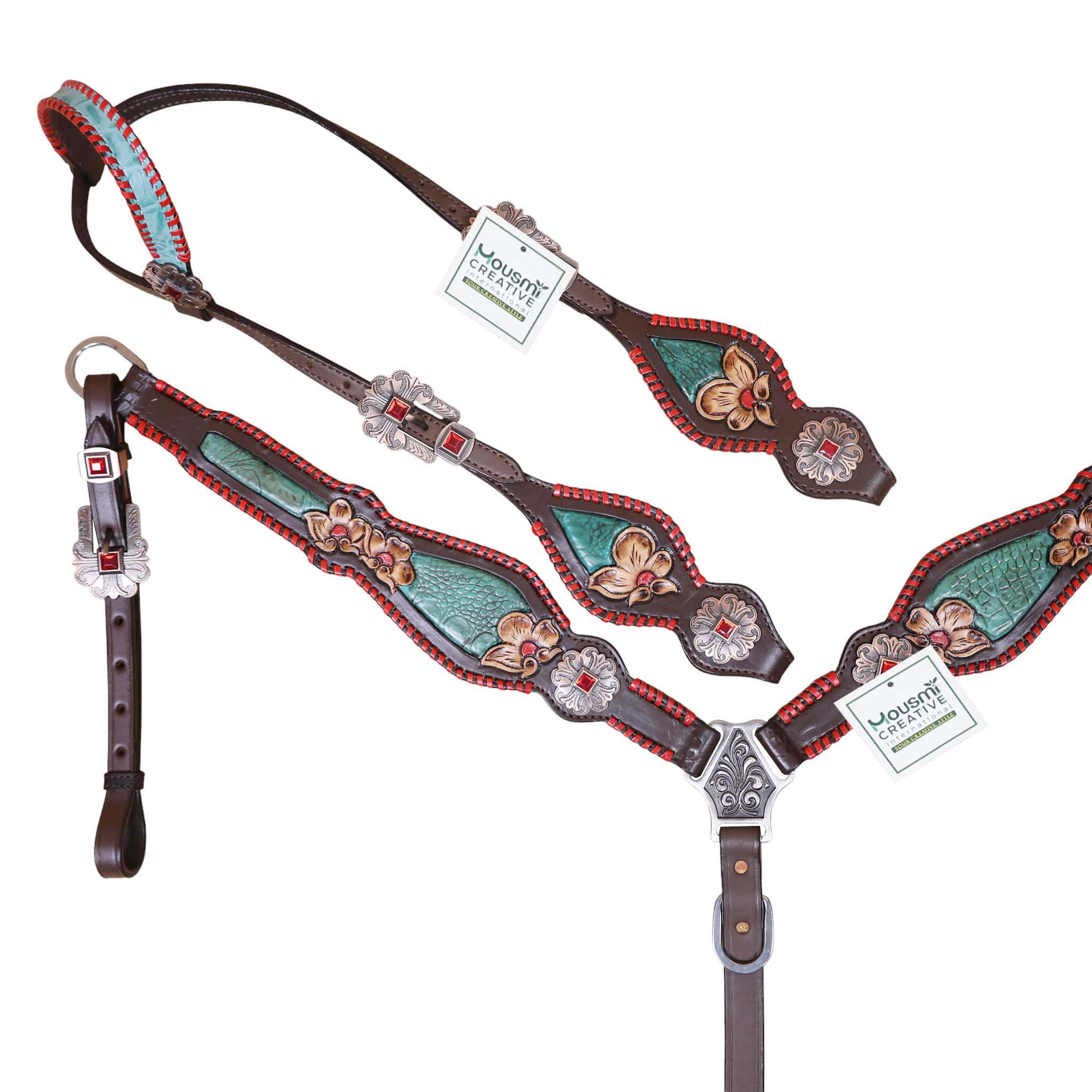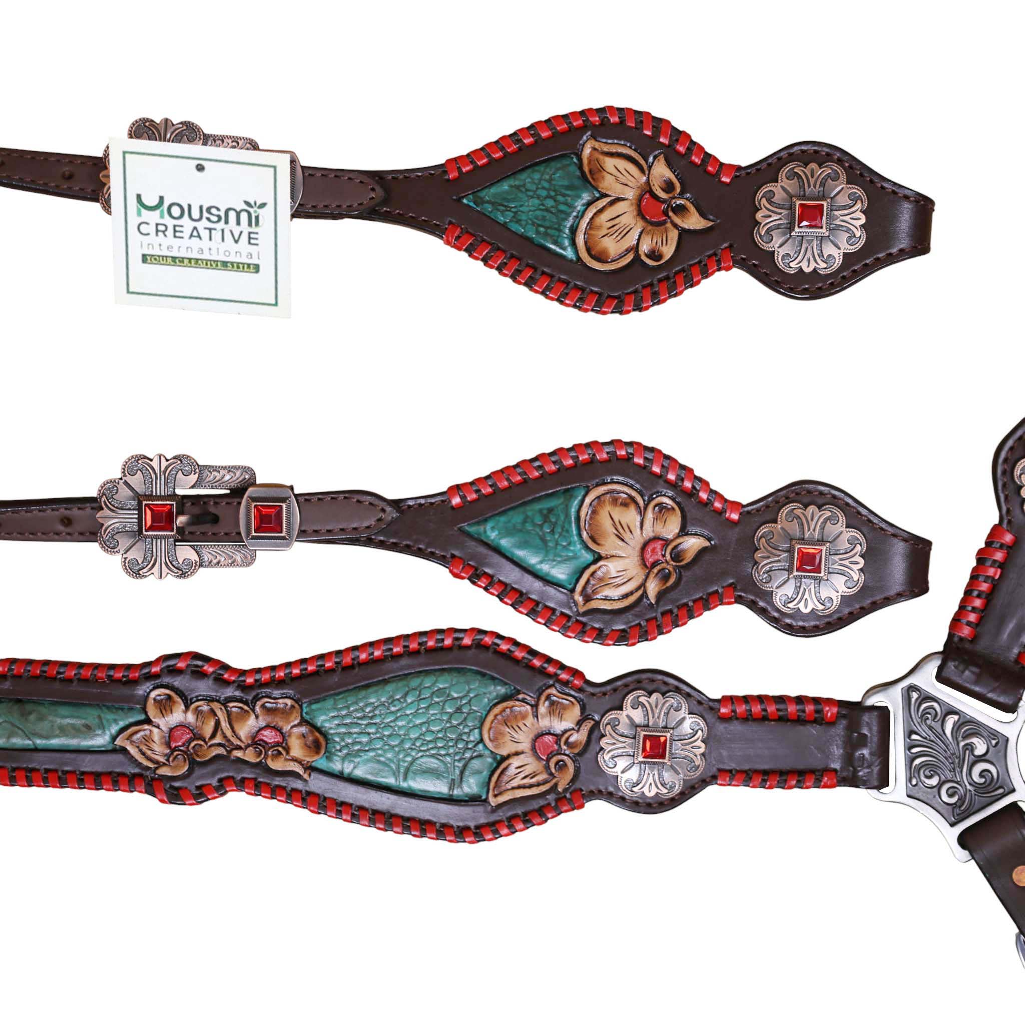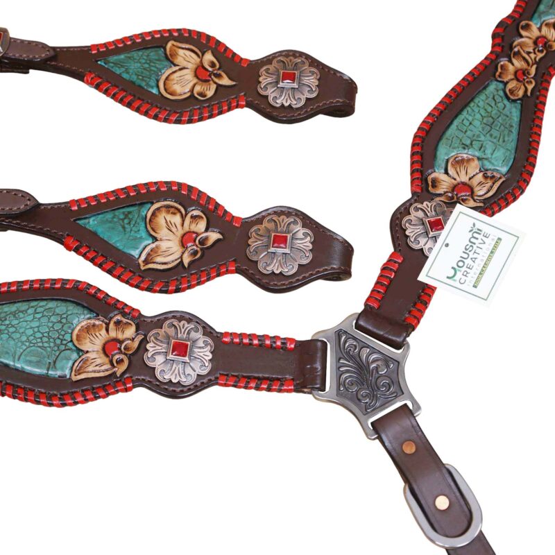 Headstall Type: Headstall and Breast Collar tack Set decorated with turquoise inlay red raw hide whip stitching flower carving red jewel conchos and buckles