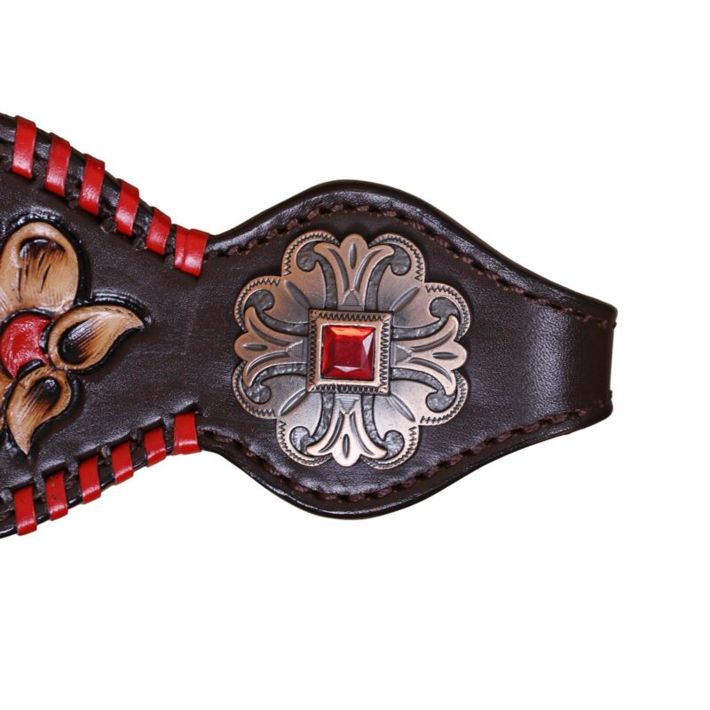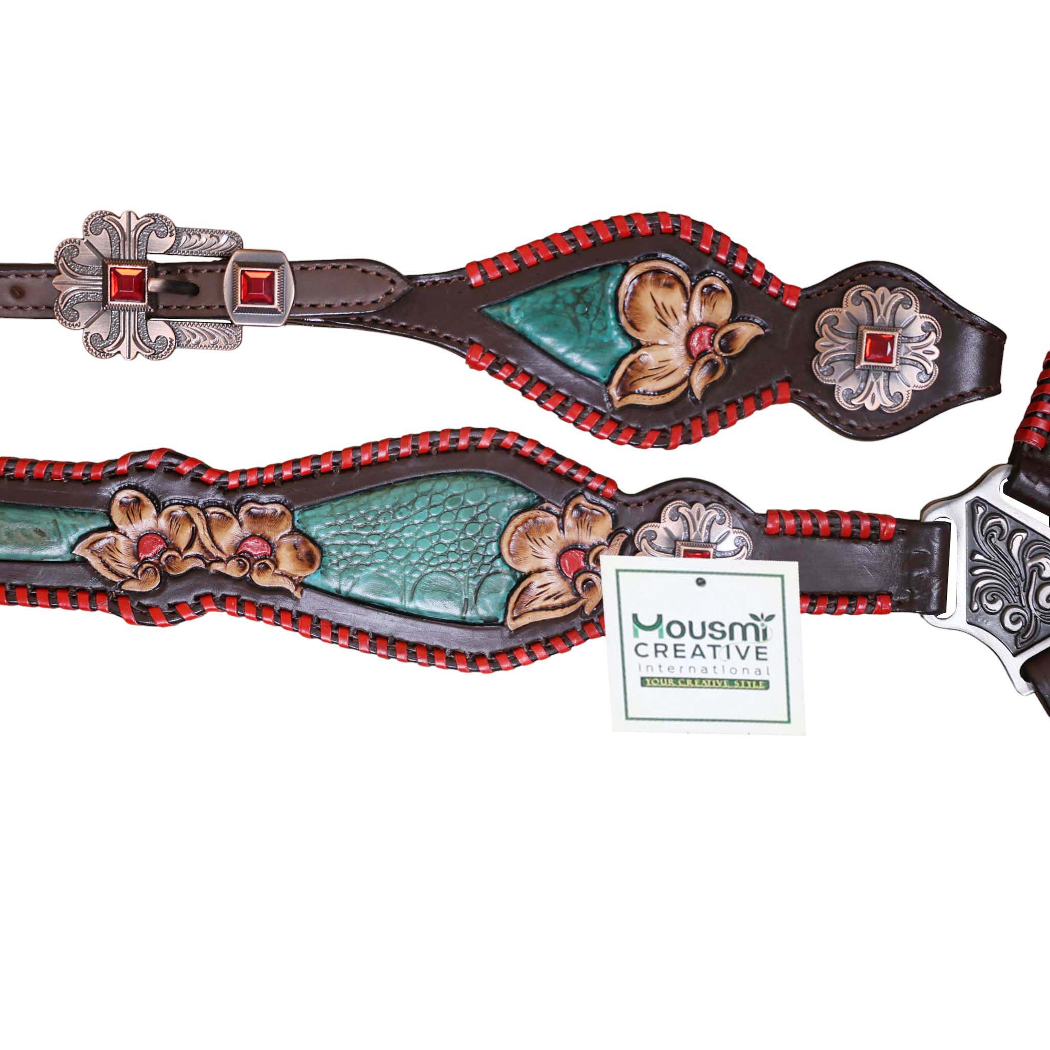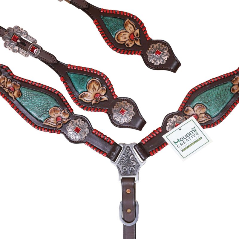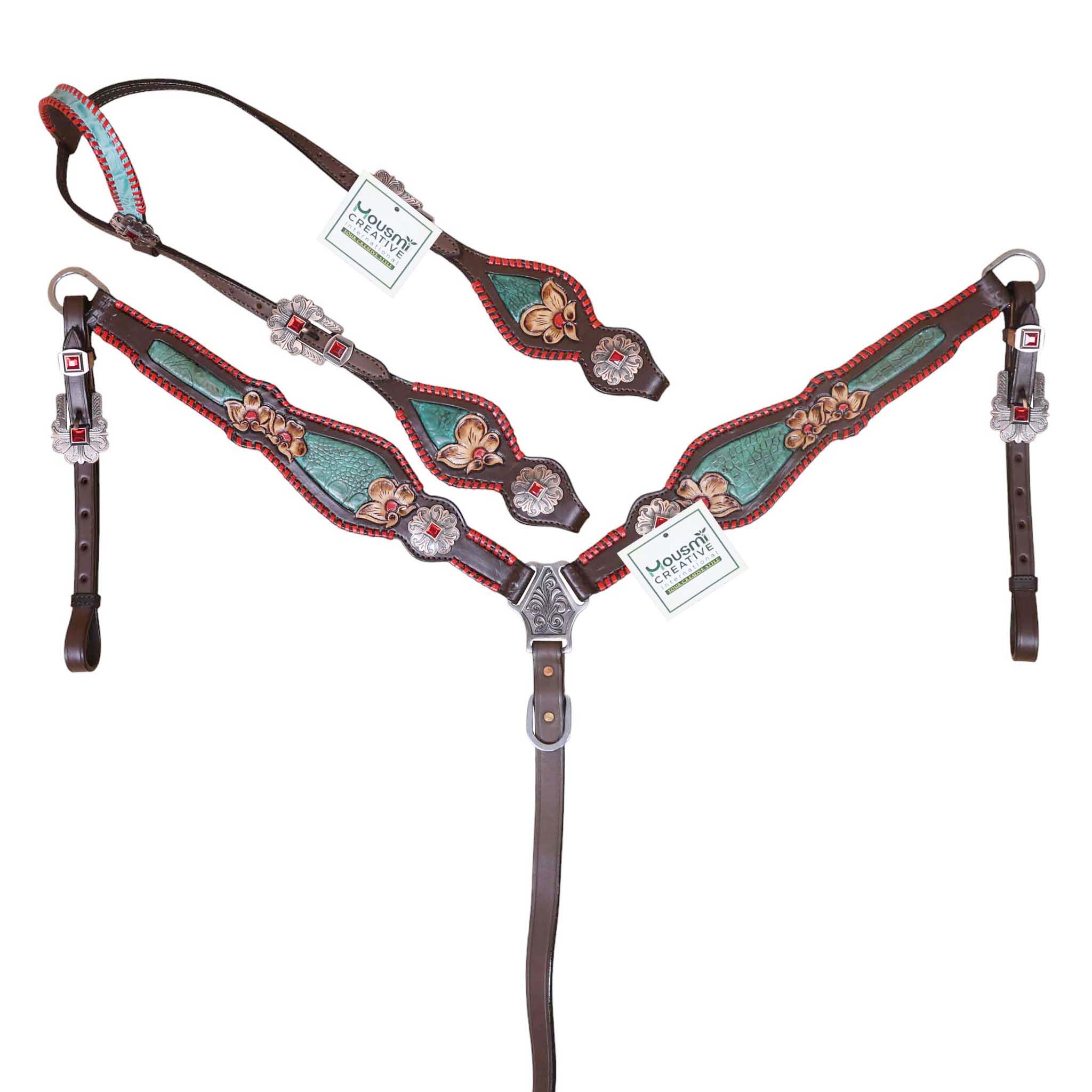 Headstall Type: Headstall and Breast Collar tack Set decorated with turquoise inlay red raw hide whip stitching flower carving red jewel conchos and buckles