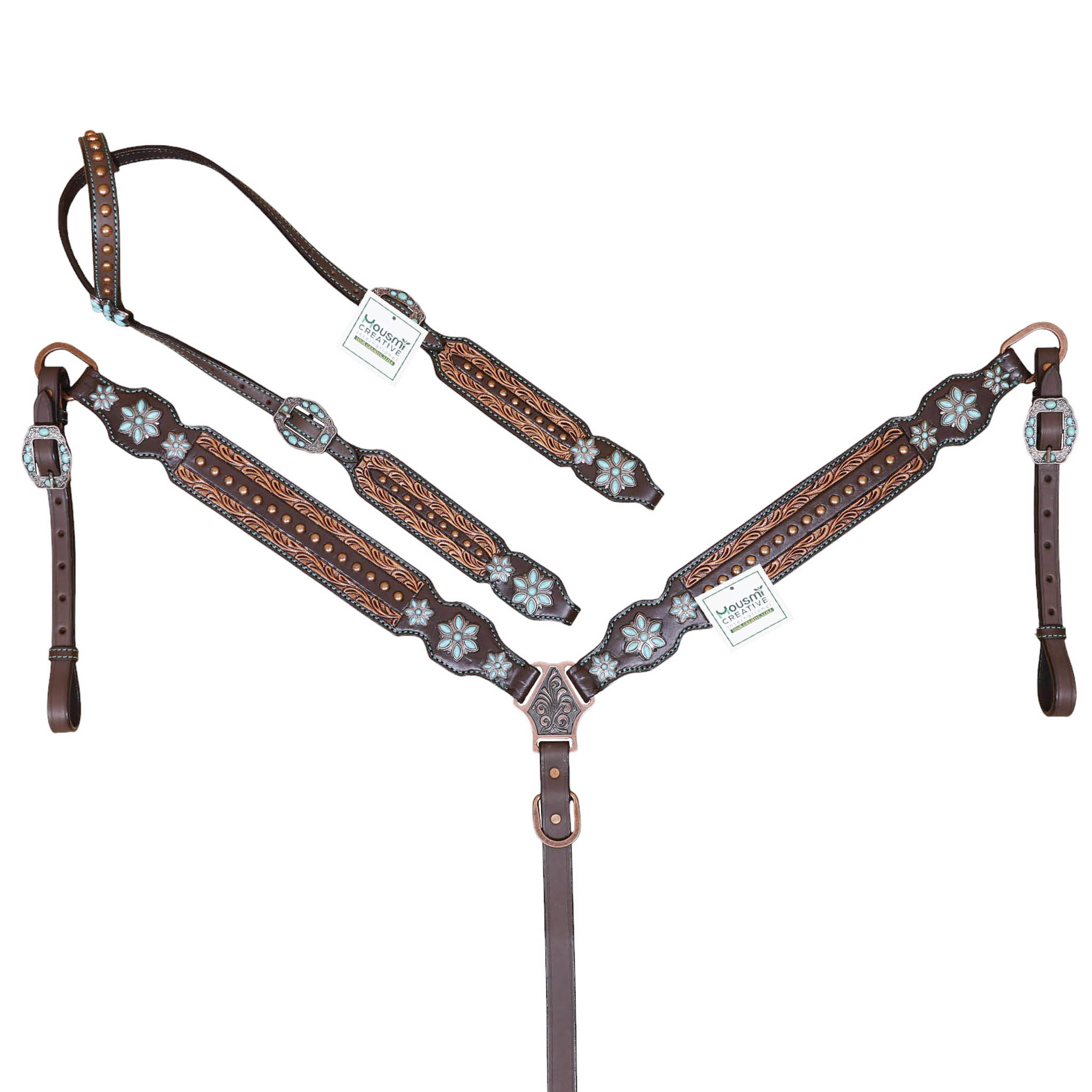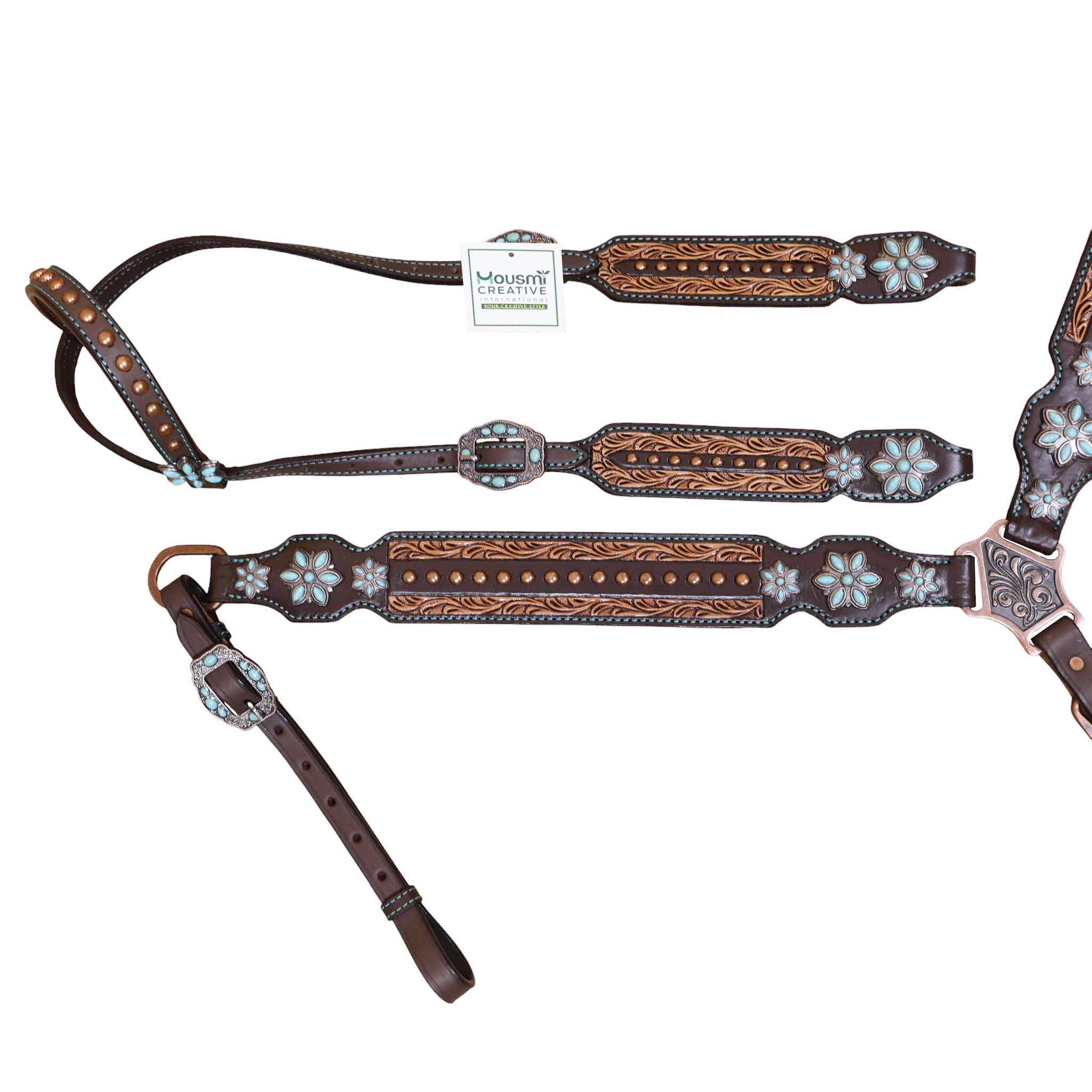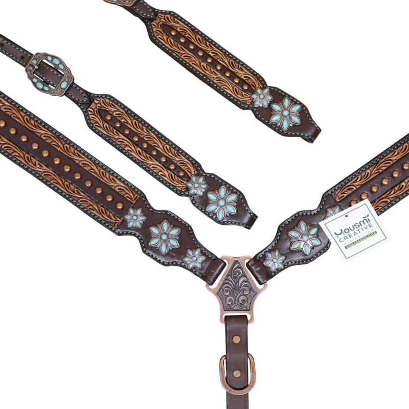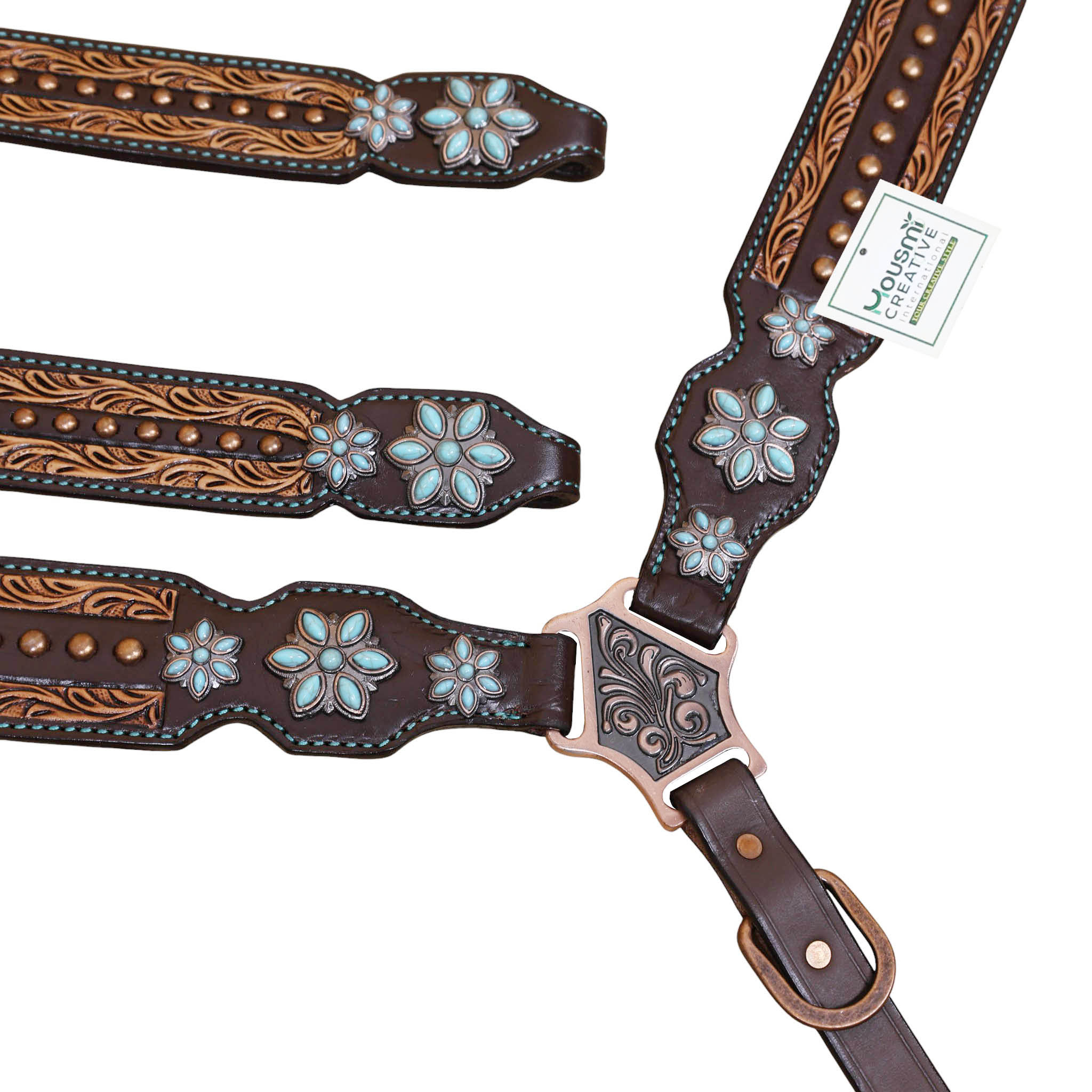 Headstall Type: Headstall and Breast Collar tack Set decorated with border carving antique finish with copper studs and turquoise stone flower hardware