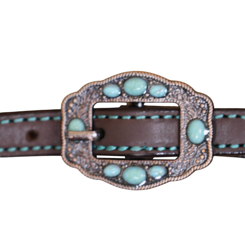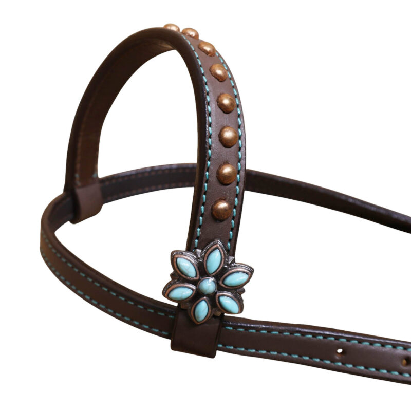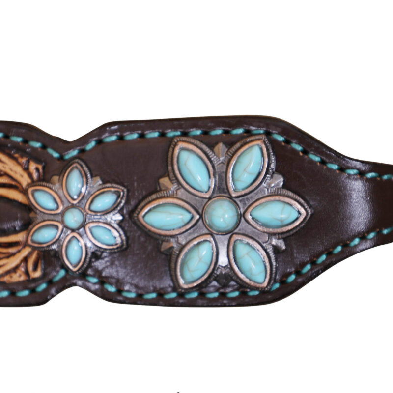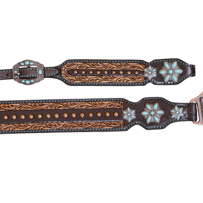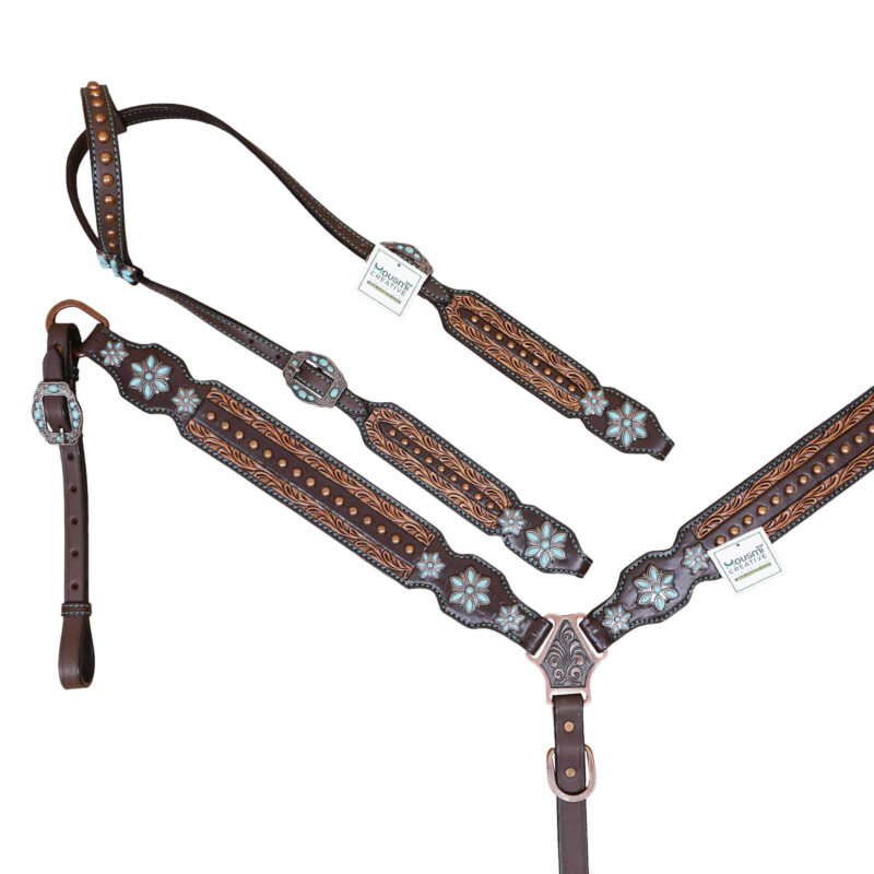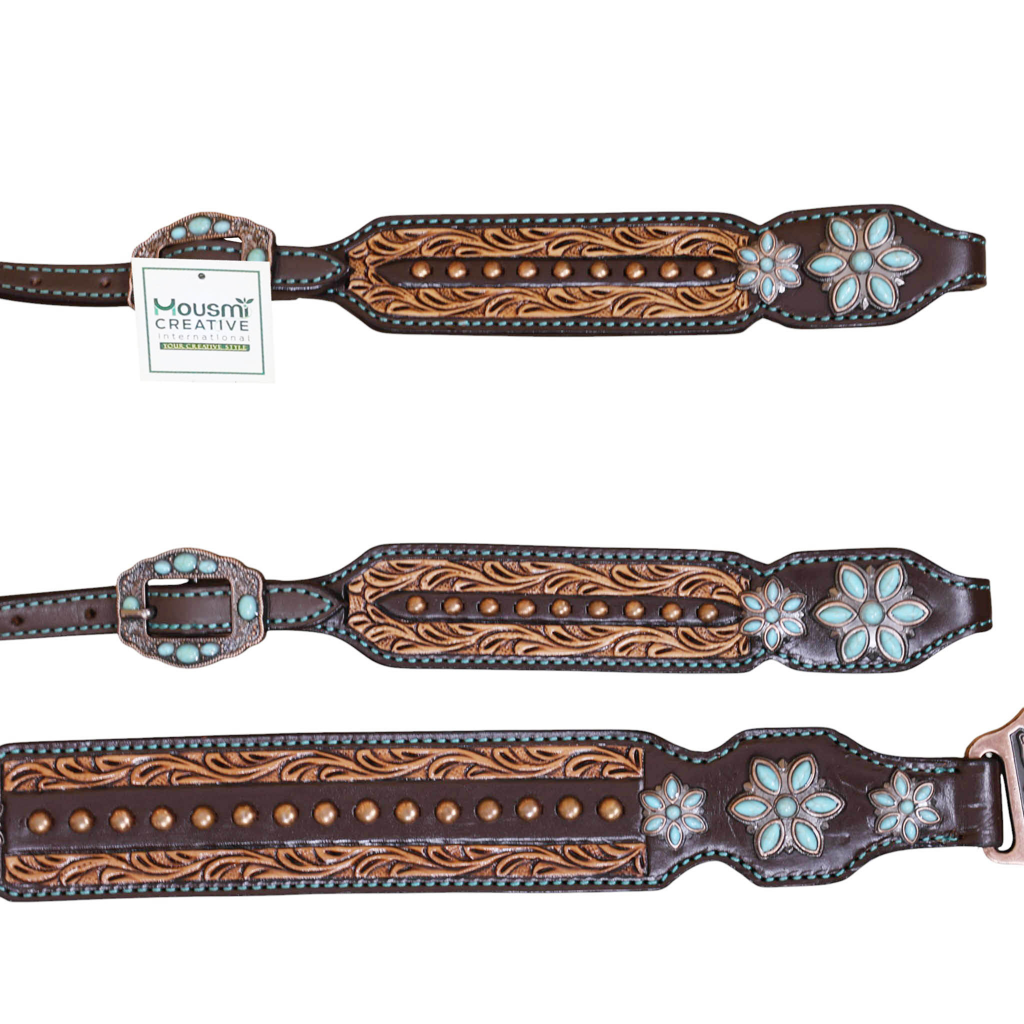 Headstall Type: Headstall and Breast Collar tack Set decorated with border carving antique finish with copper studs and turquoise stone flower hardware