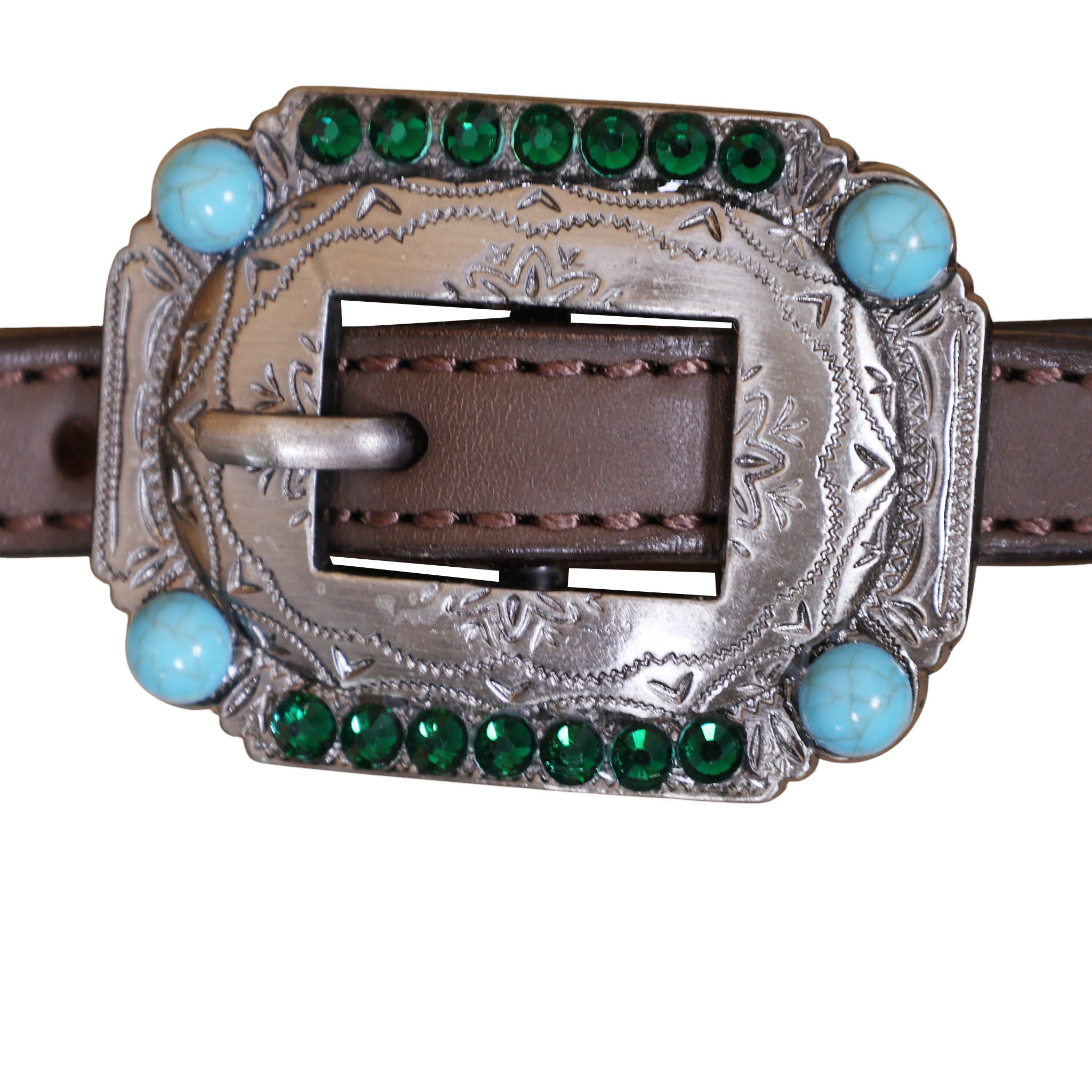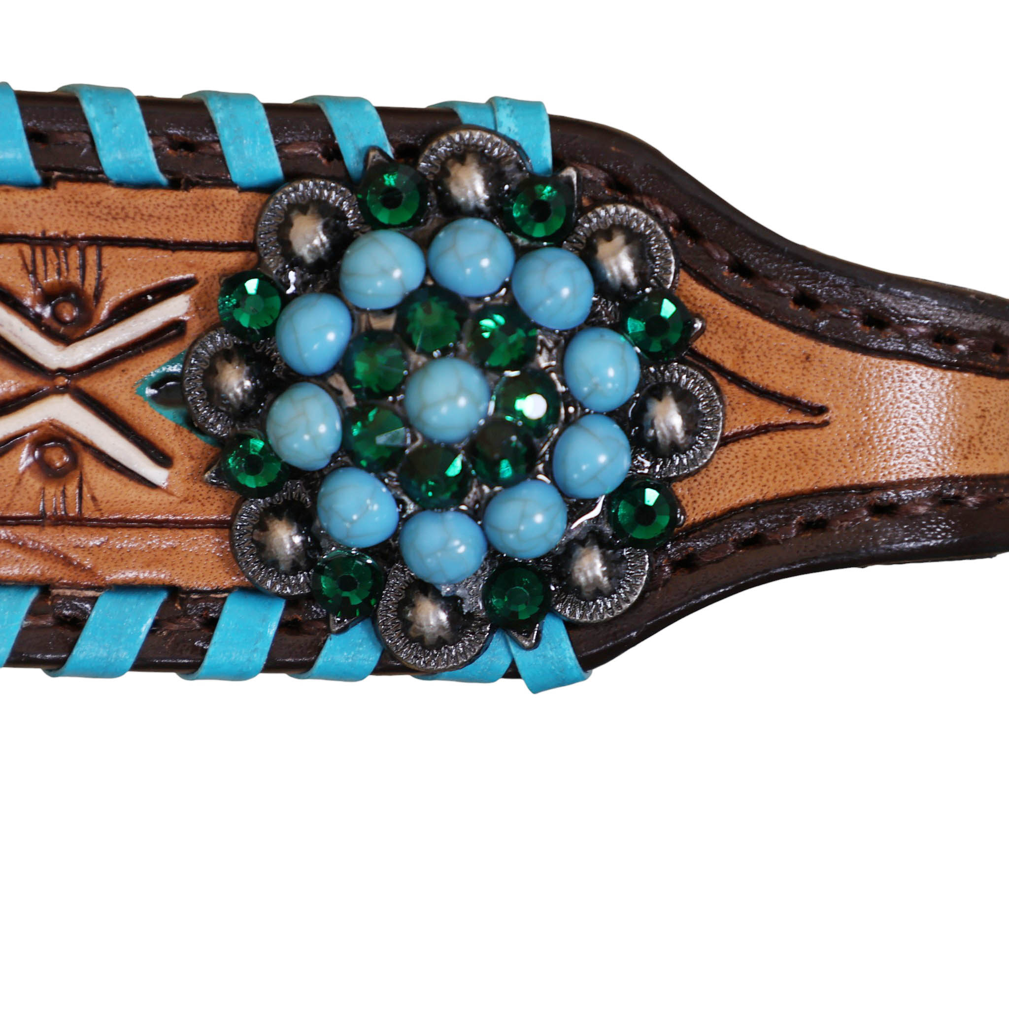 decorated with geometrical tooling with white and turquoise painting . Turquoise wipe stitching all over the edges with turquoise berry concho on gladiator style triangle