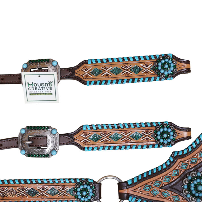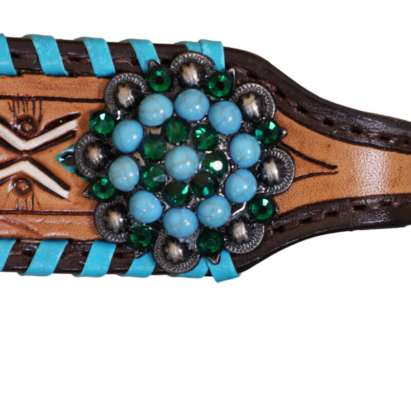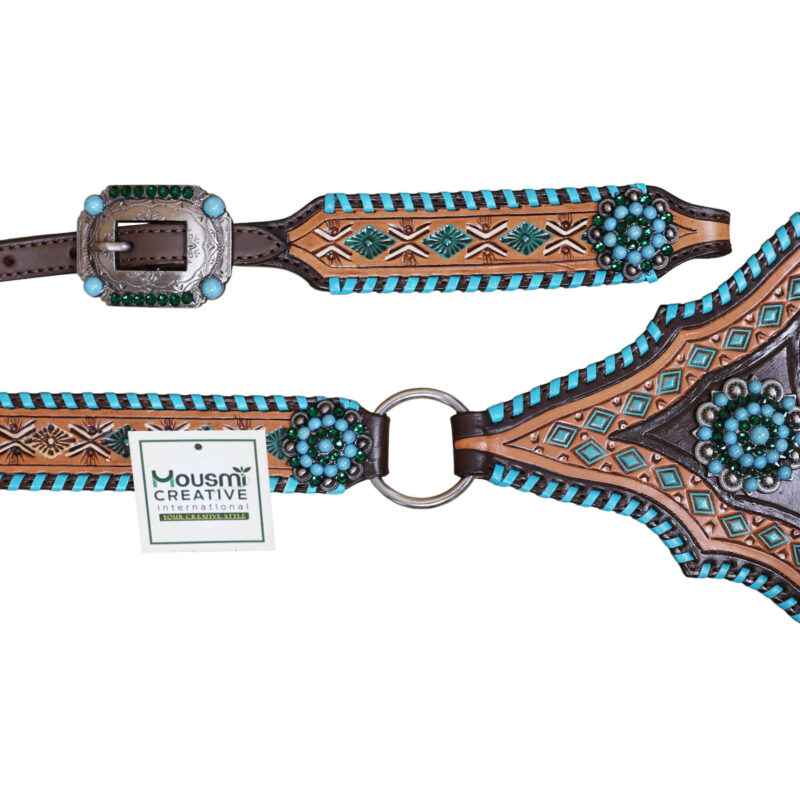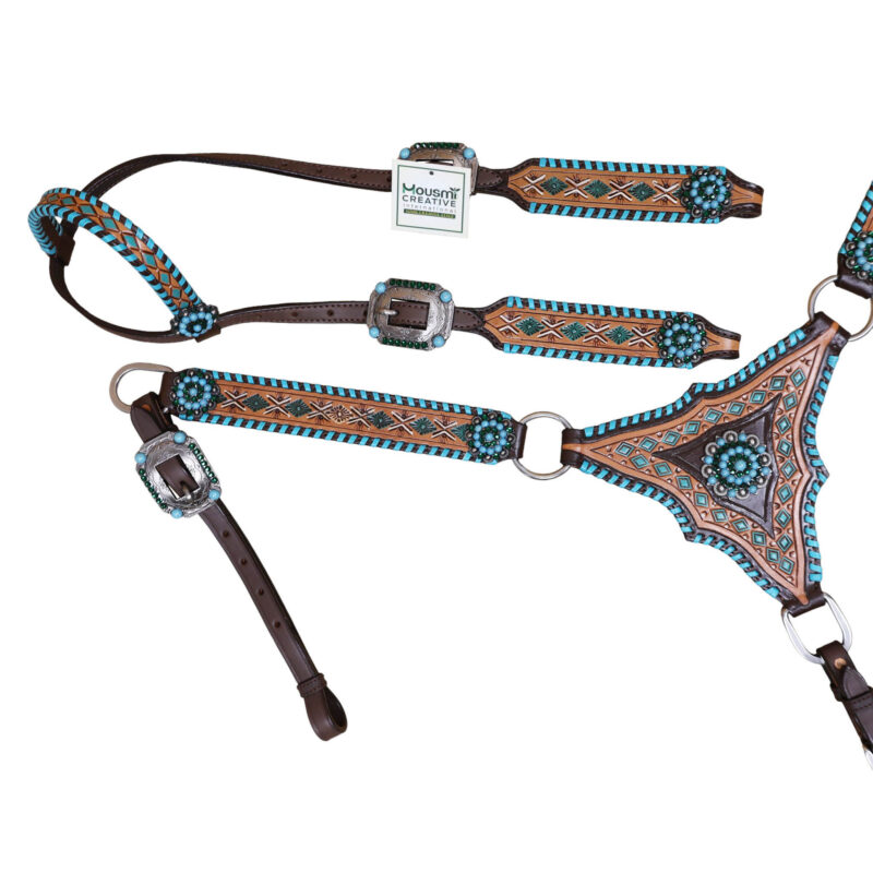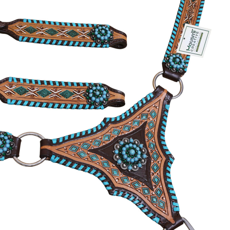 Headstall Type: Headstall and Breast Collar tack Set decorated with with geometrical tooling with white and turquoise painting . Turquoise wipe stitching all over the edges with turquoise berry concho on gladiator style triangle