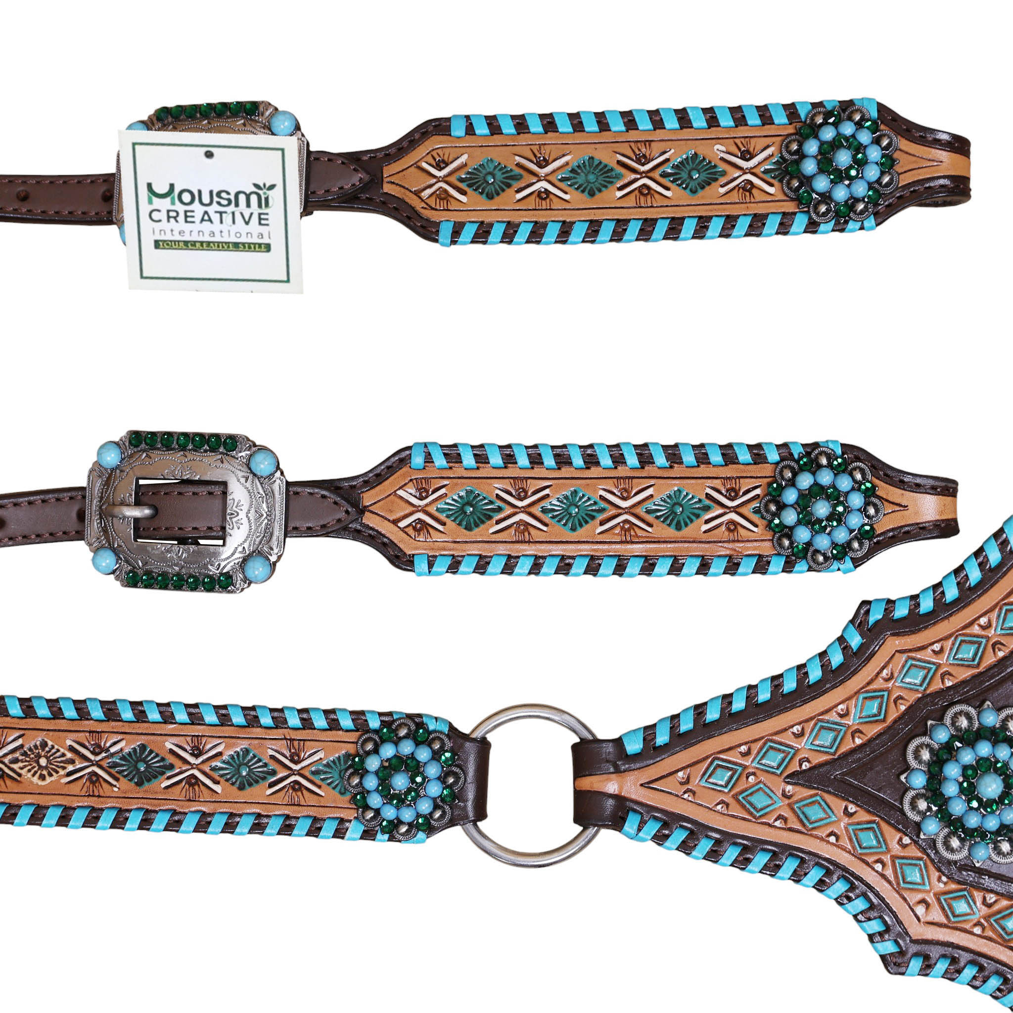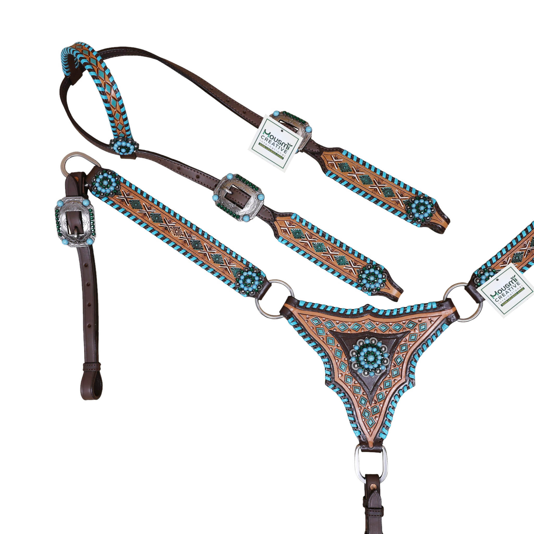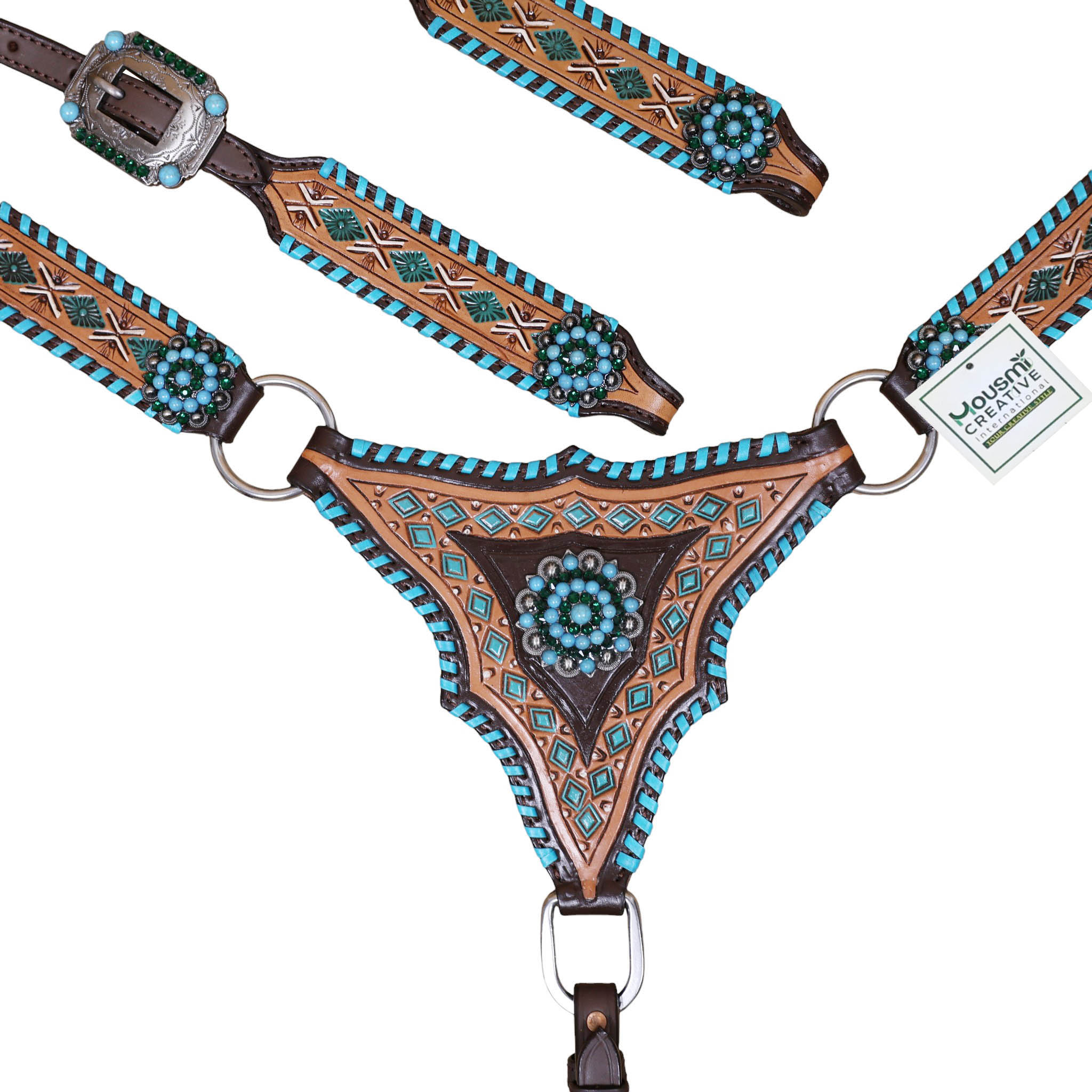 Headstall Type: Headstall and Breast Collar tack Set decorated with with geometrical tooling with white and turquoise painting . Turquoise wipe stitching all over the edges with turquoise berry concho on gladiator style triangle