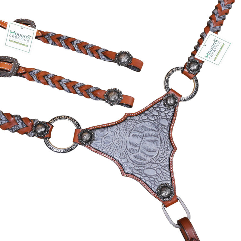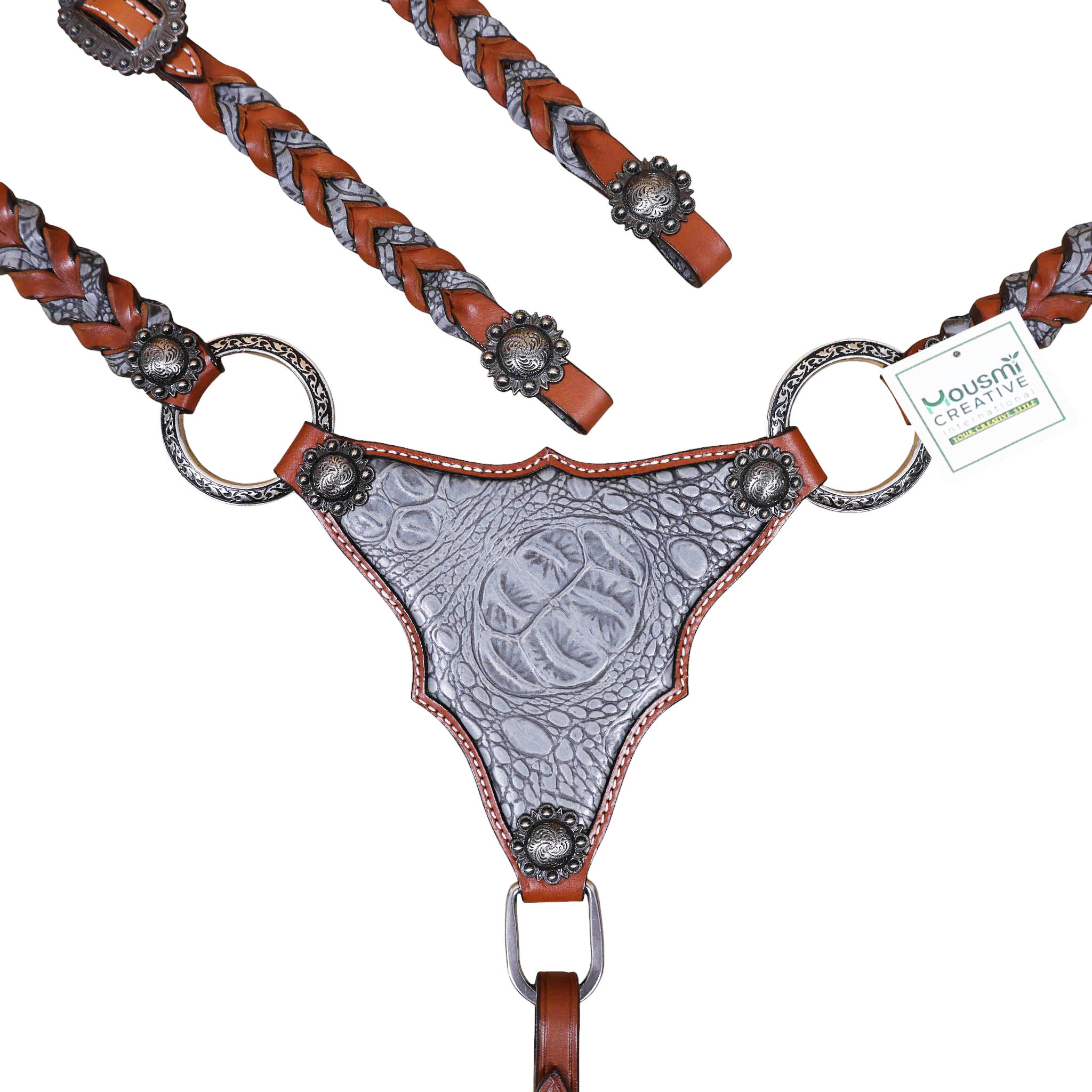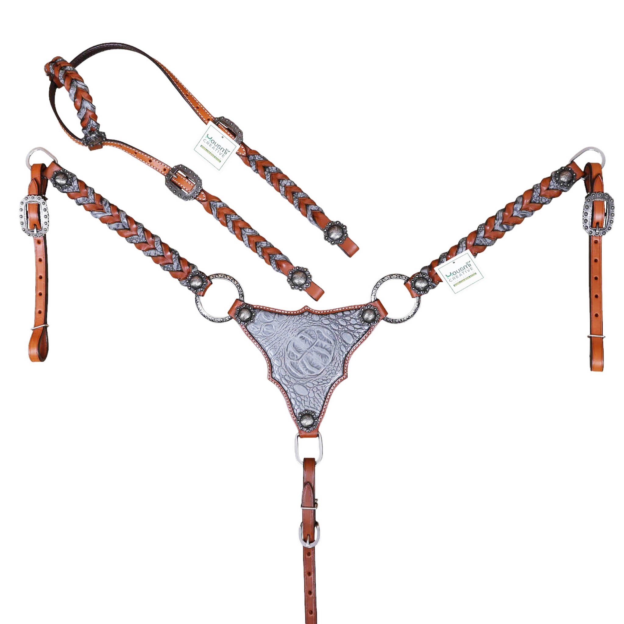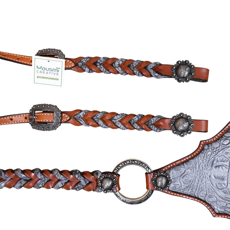 Headstall Type: Headstall and Breast Collar tack Set decorated with twisted leather braiding with grey alligator and big engraved ring on gladiator style breast collar with grey alligator inlay on chesnut leather