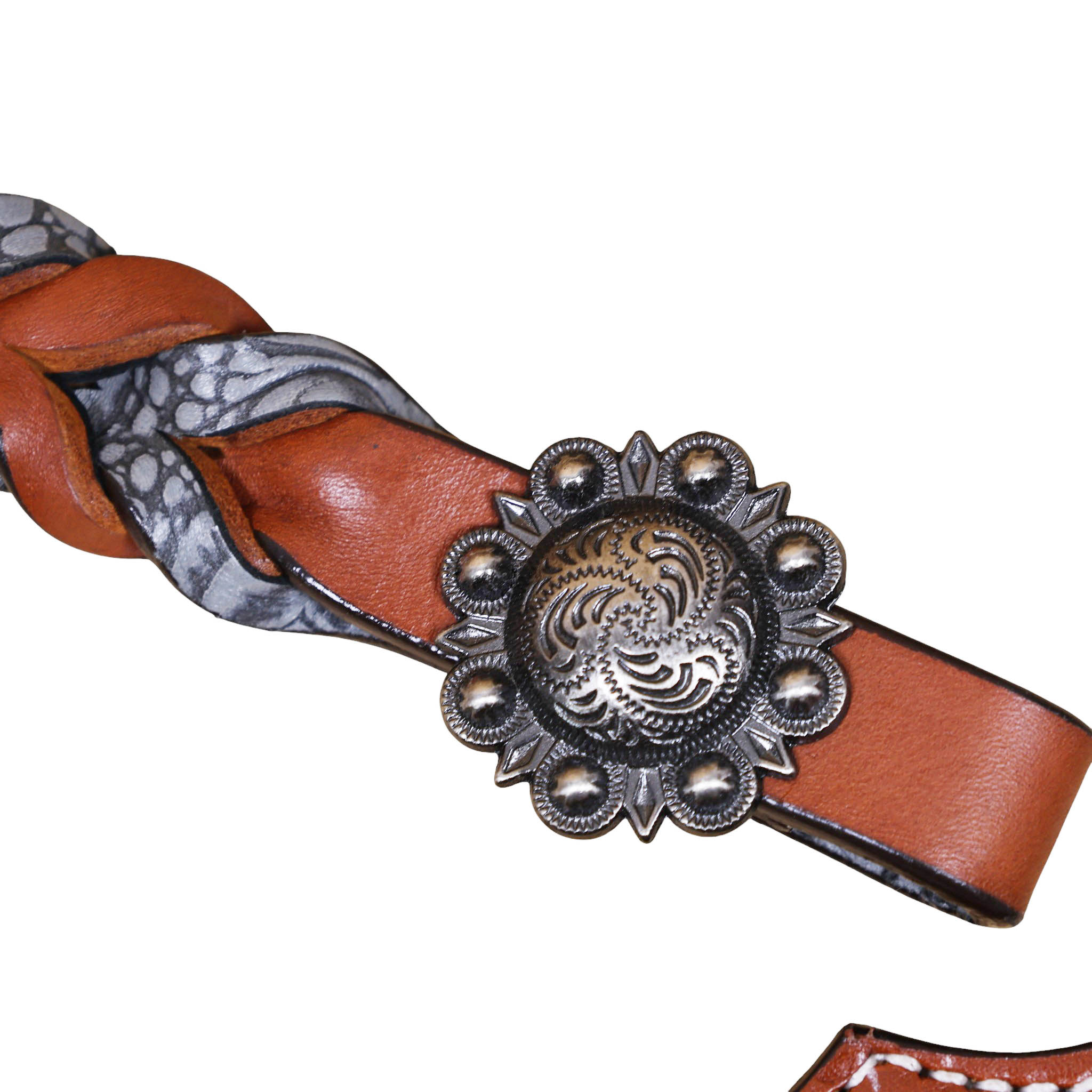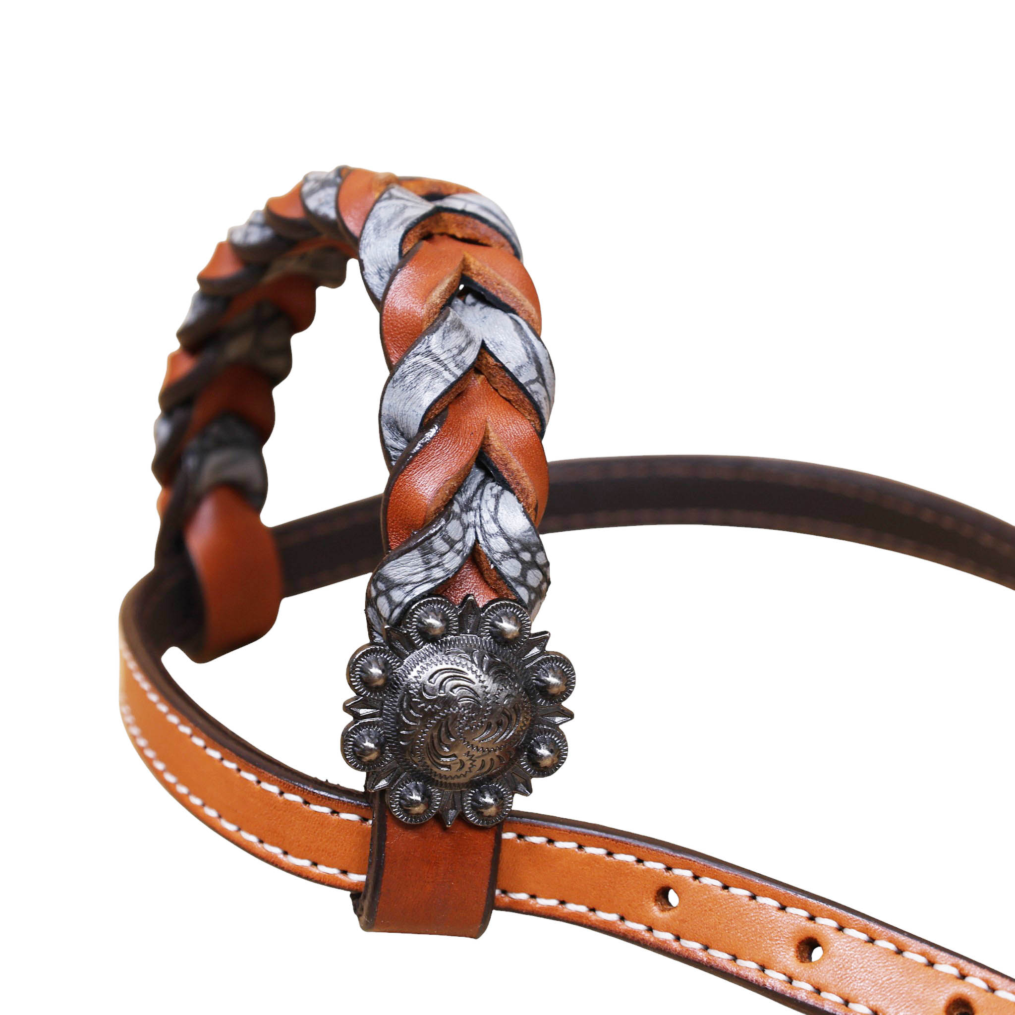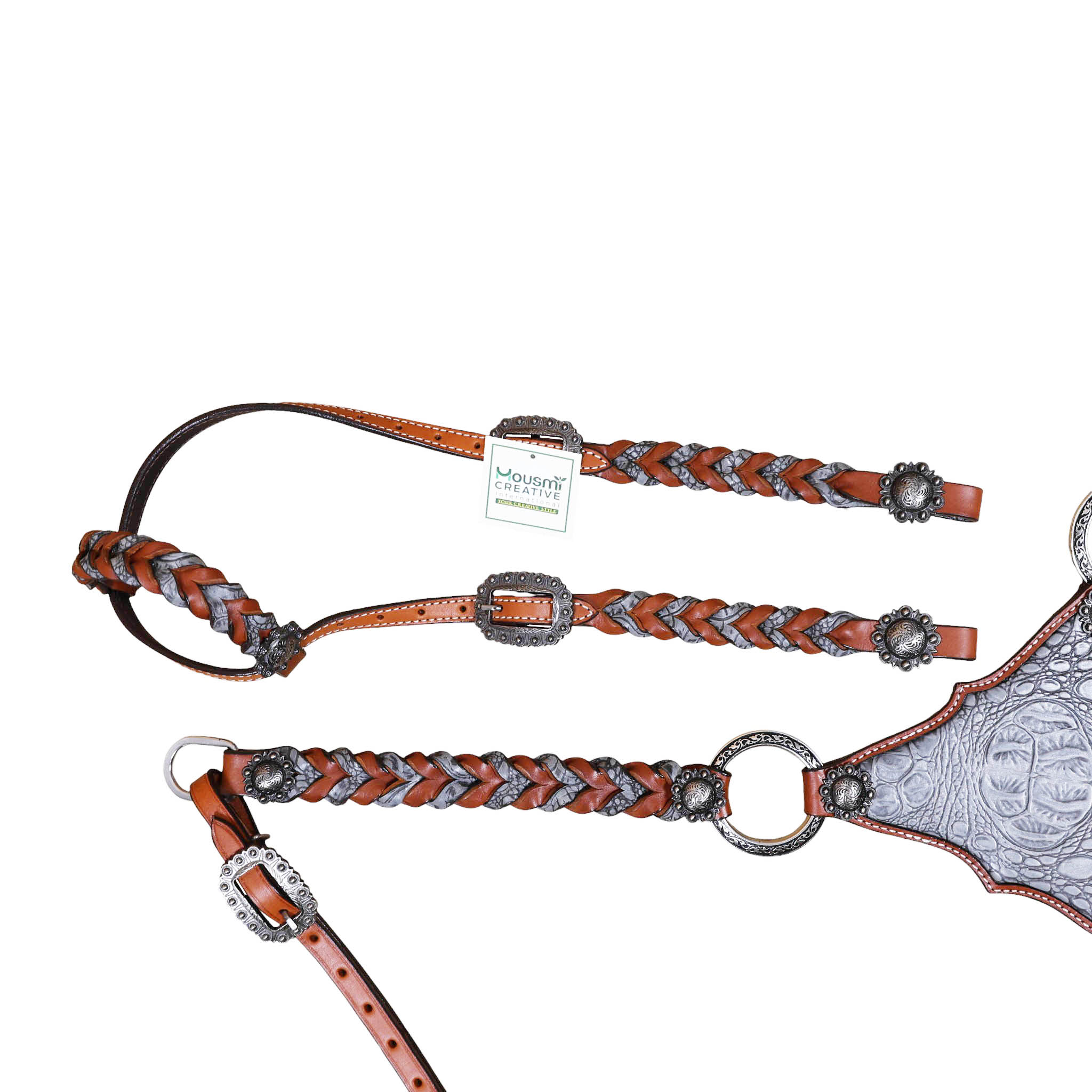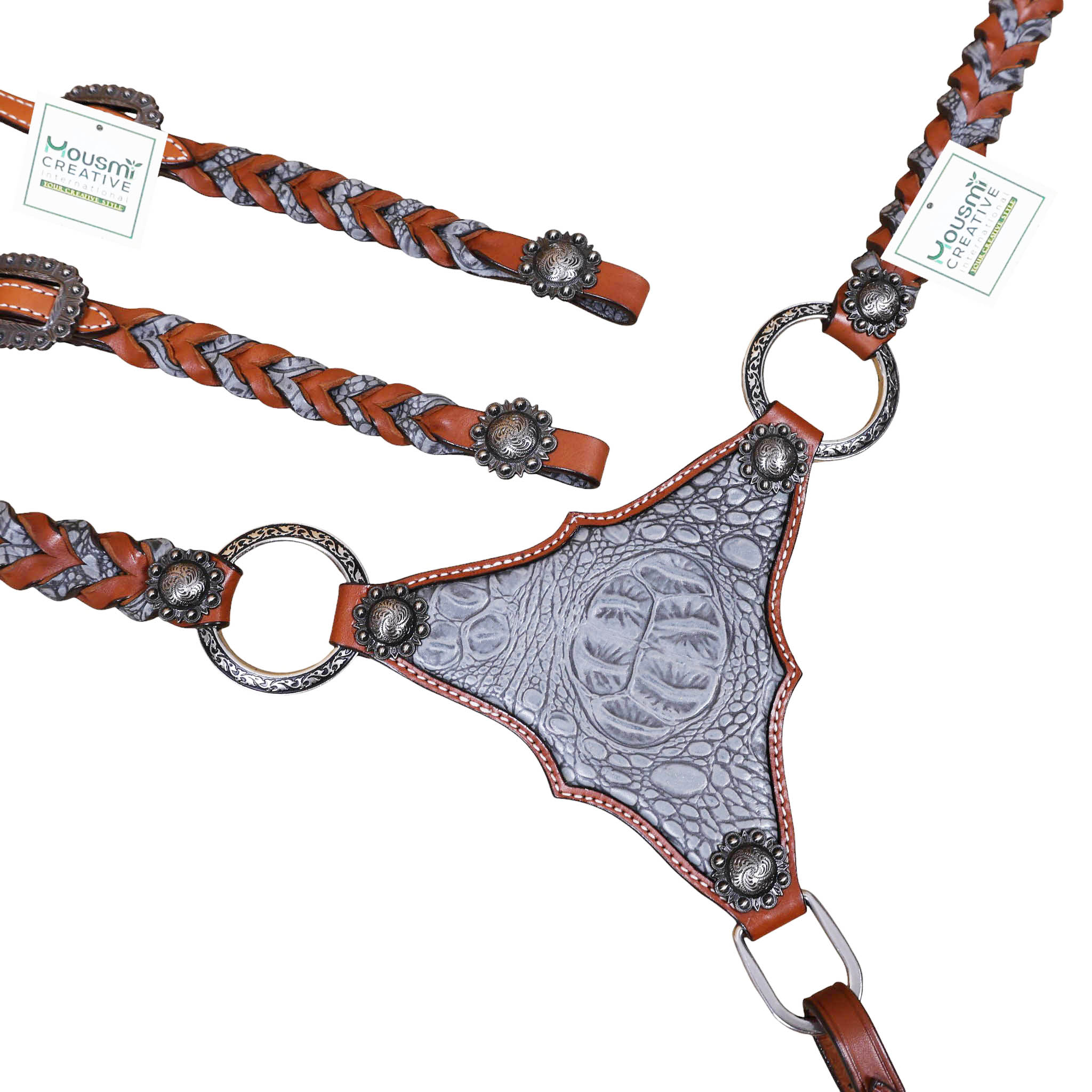 Headstall Type: Headstall and Breast Collar tack Set decorated with twisted leather braiding with grey alligator and big engraved ring on gladiator style breast collar with grey alligator inlay on chesnut leather