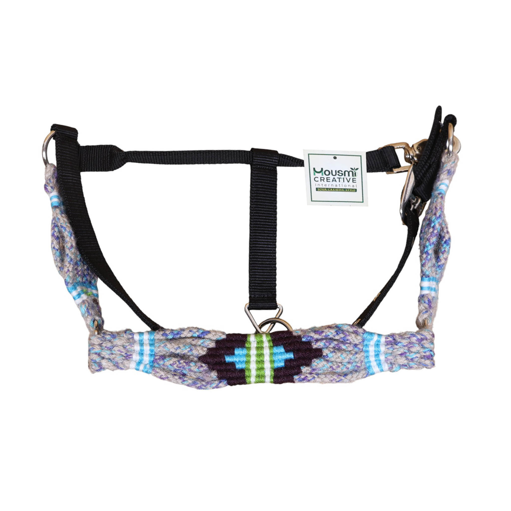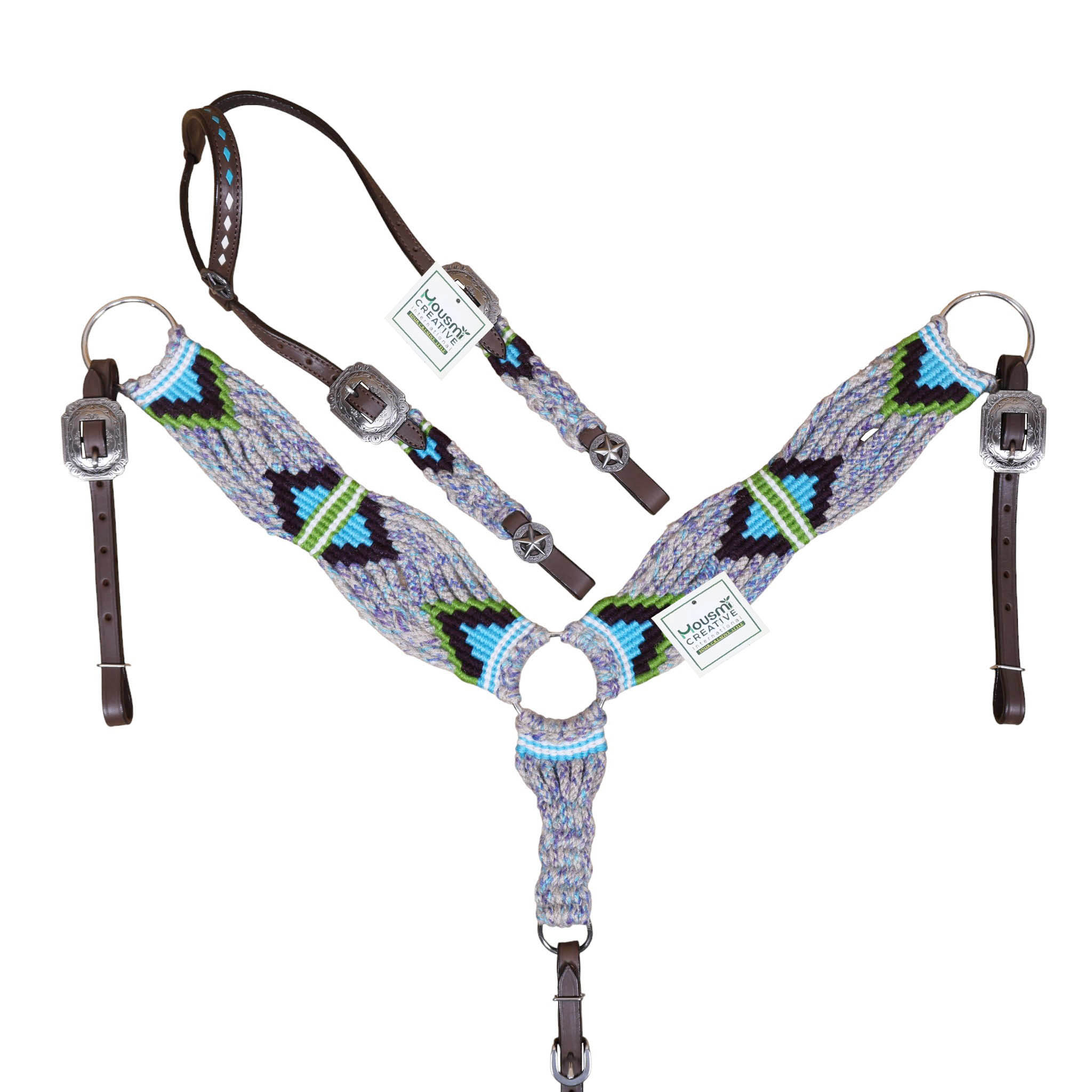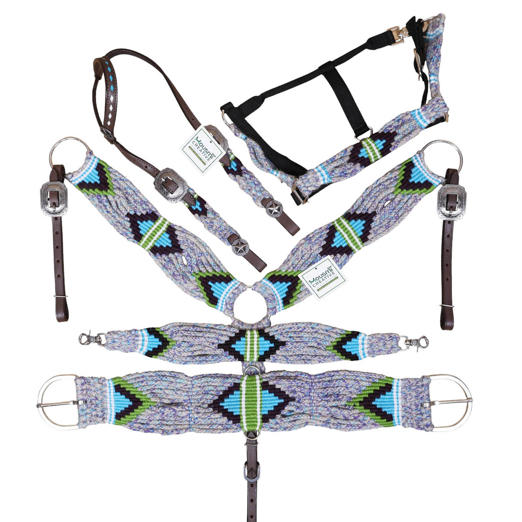 Grey, Green , Purple and Sky Blue Mohair Headstall tack set decorated with matching front girth 32″ on argentina leather (HSBM 114496)