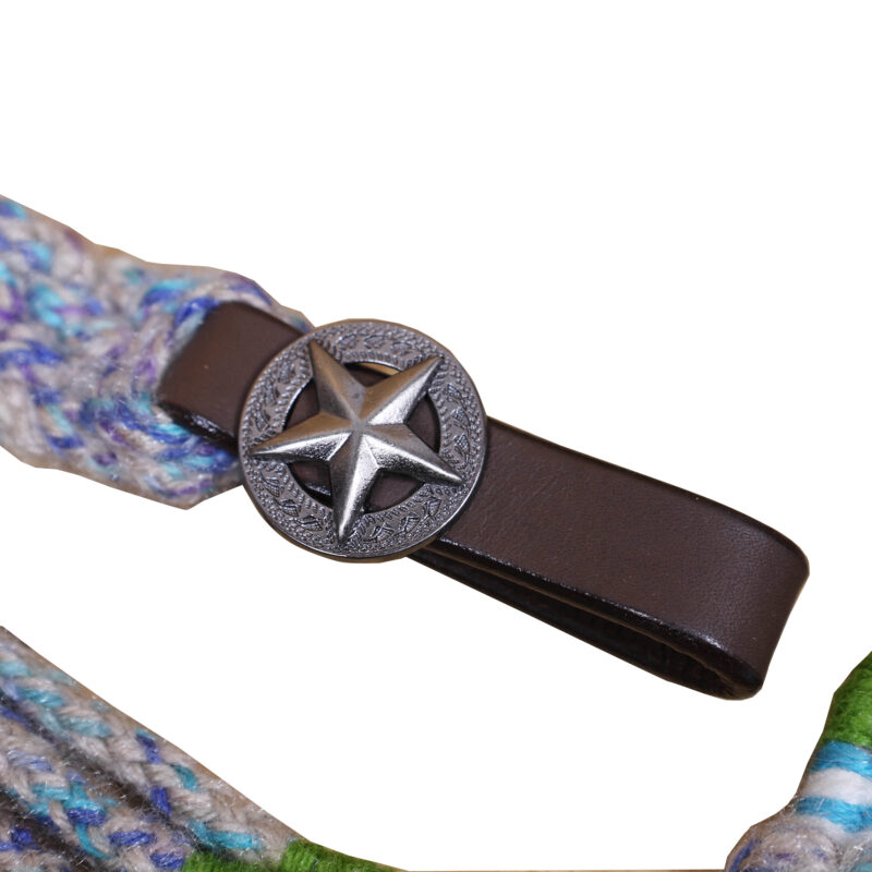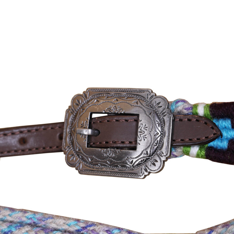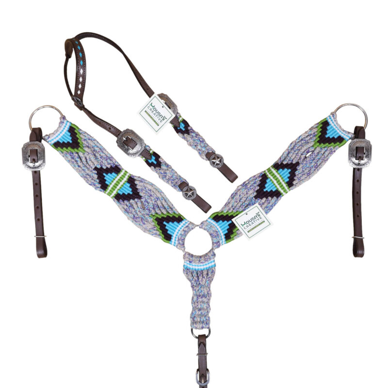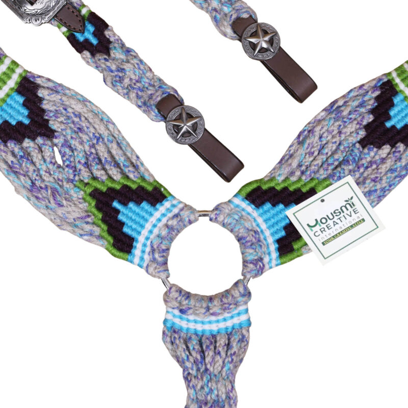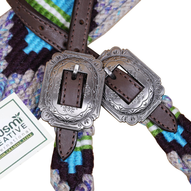 Headstall Type: Western Headstall and Breast Collar tack Set decorated with Grey, Green , Purple and Sky Blue Mohair Headstall tack set decorated with matching front girth 32″ on Argentina leather