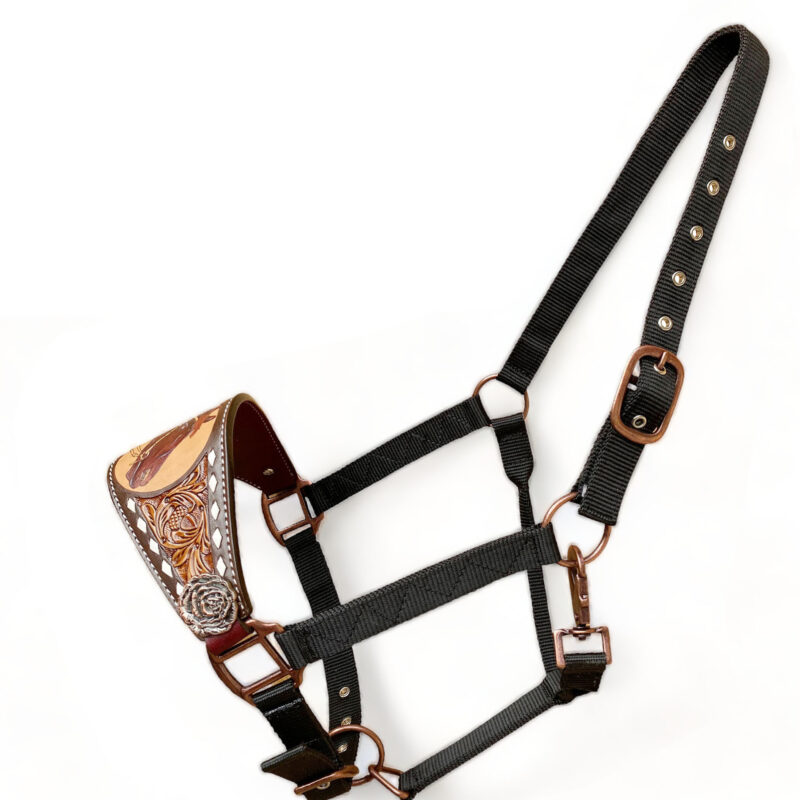 - Bronc Halter Decorated with oak fruit carving rose flower accent with horse head painting and rose concho.