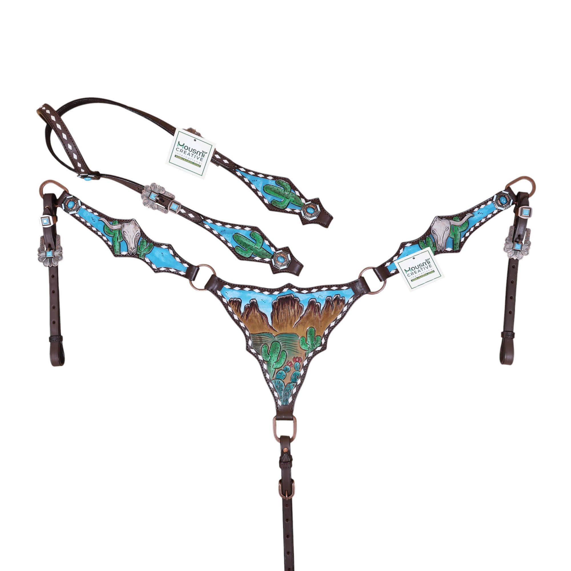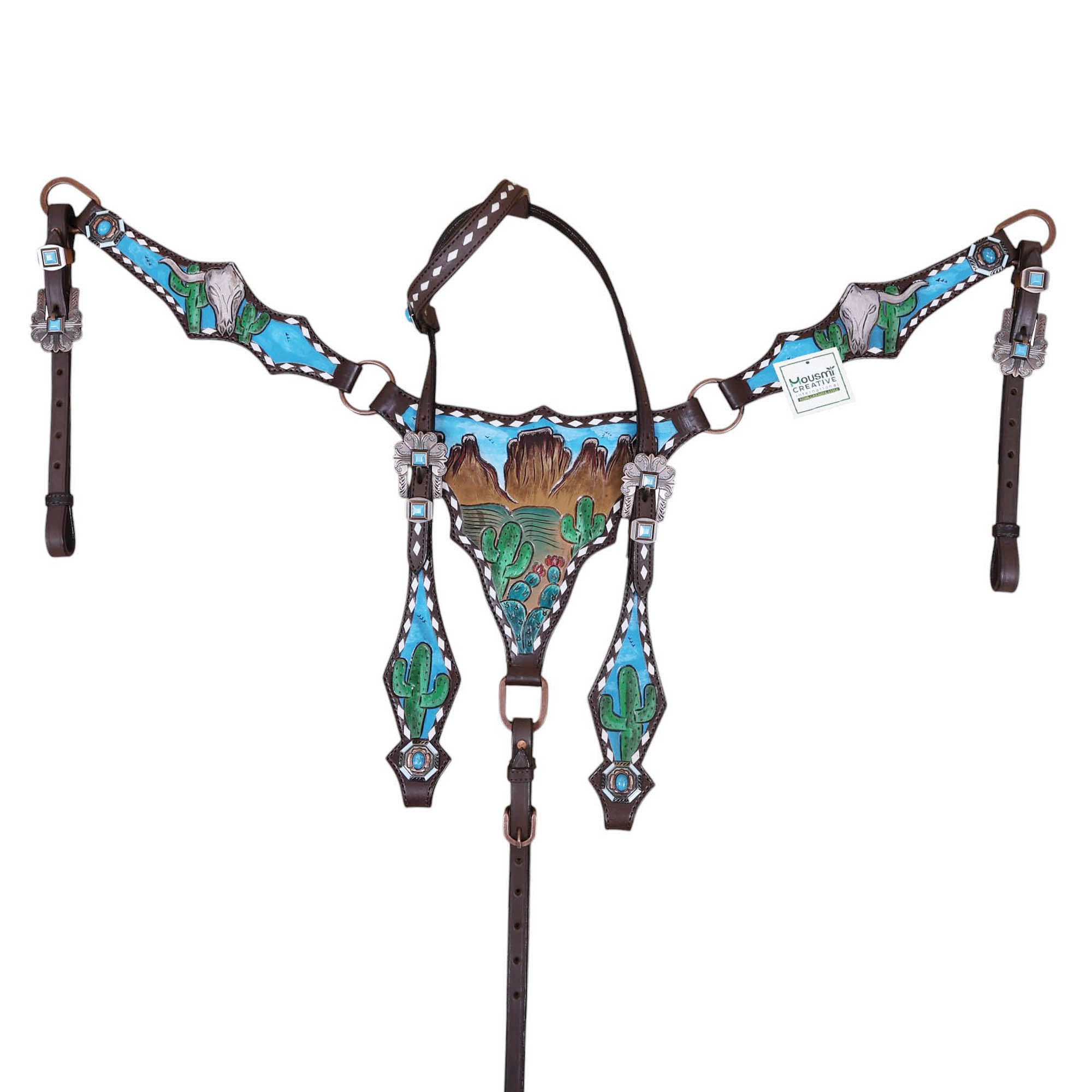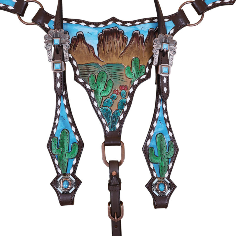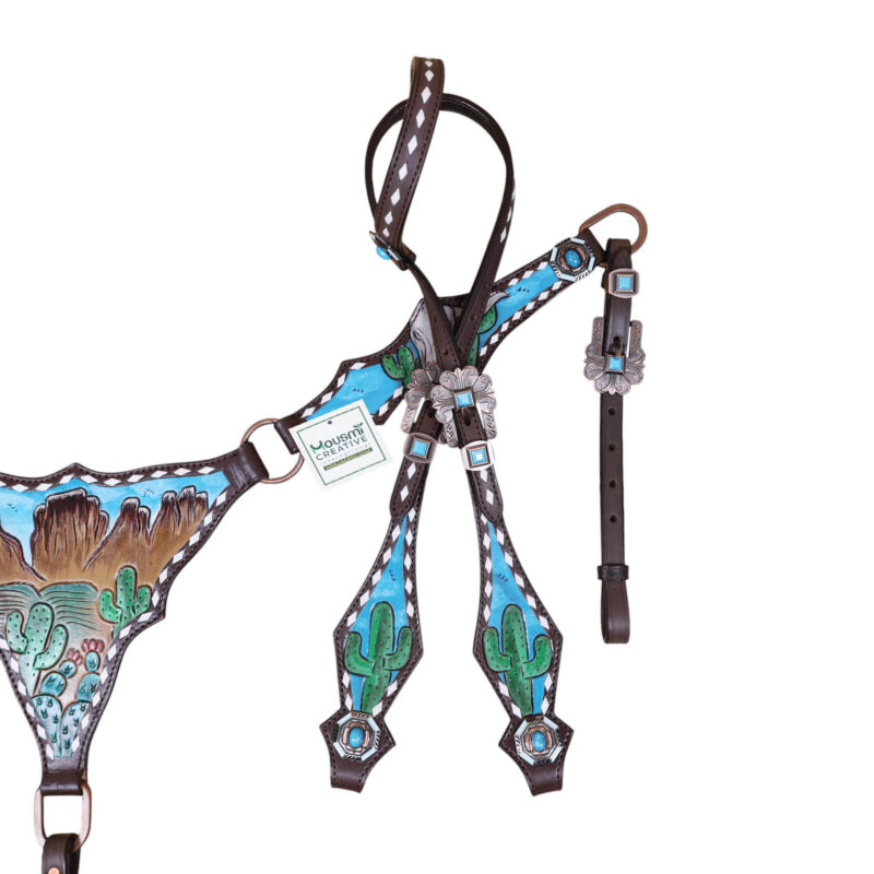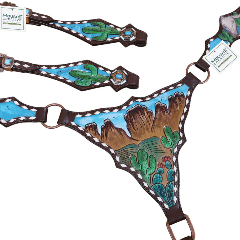 Headstall Type: Western Leather Headstall and Breast Collar tack Set decorated with Mountain and cactus with STEER HEAD carving and beautiful hand painted Scenery gladiator style breast collar with white raw hide braiding