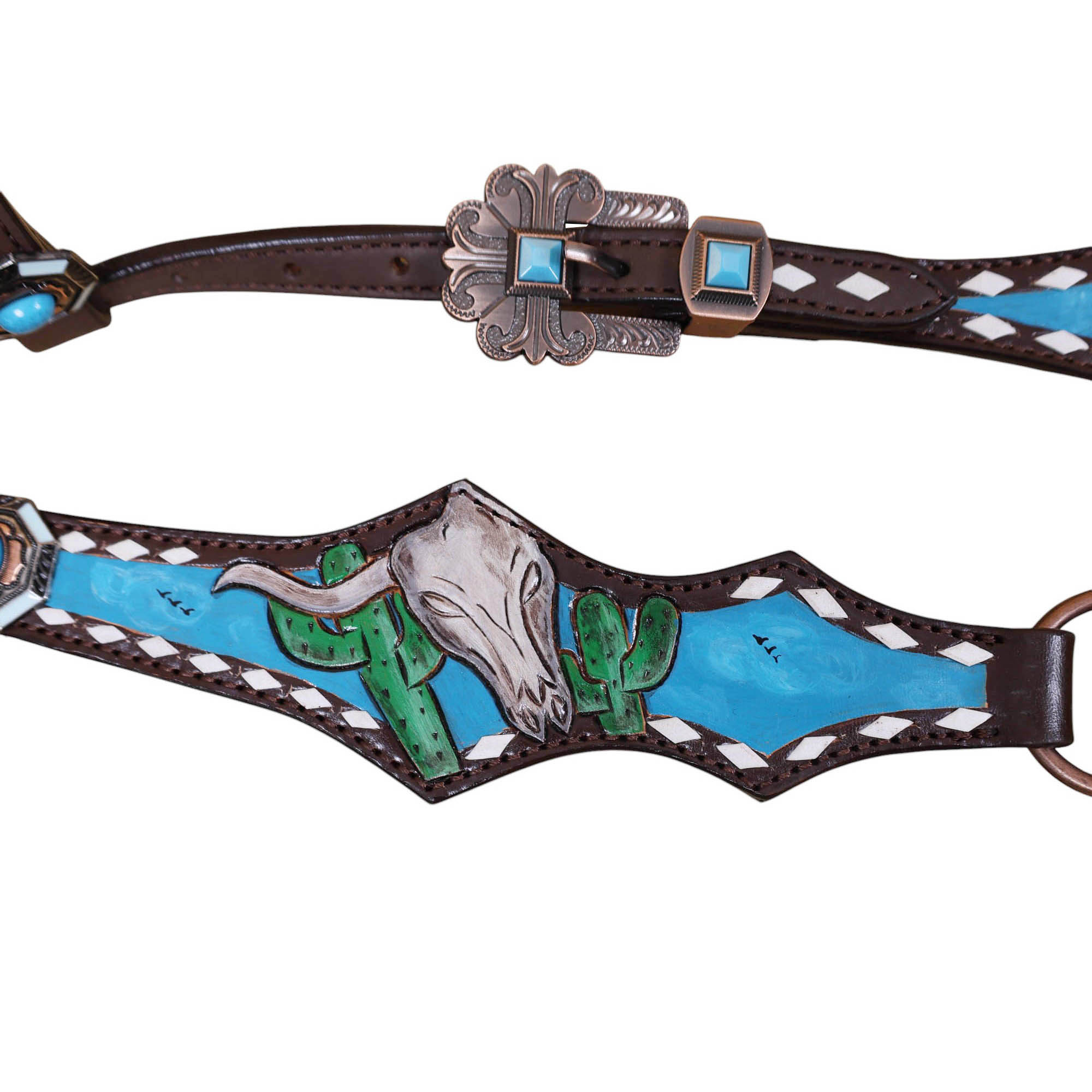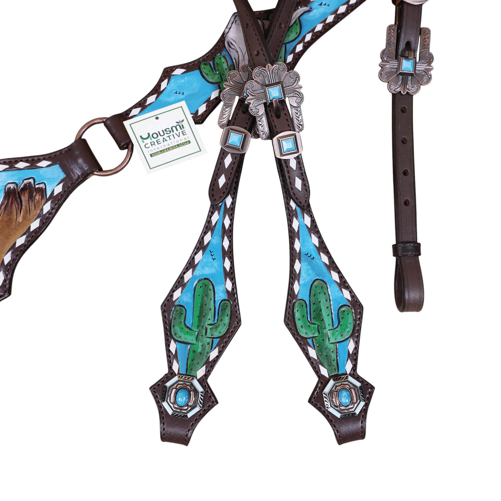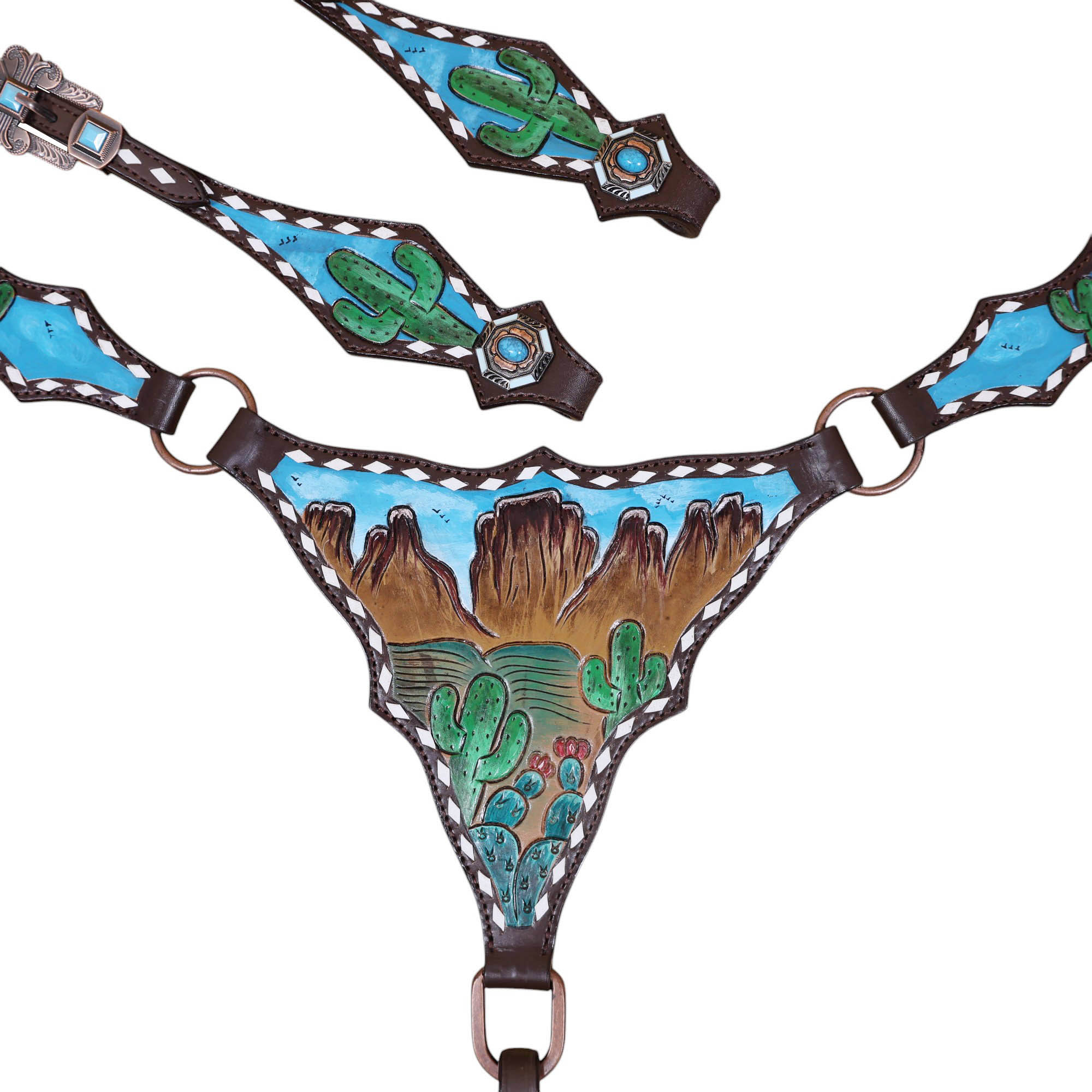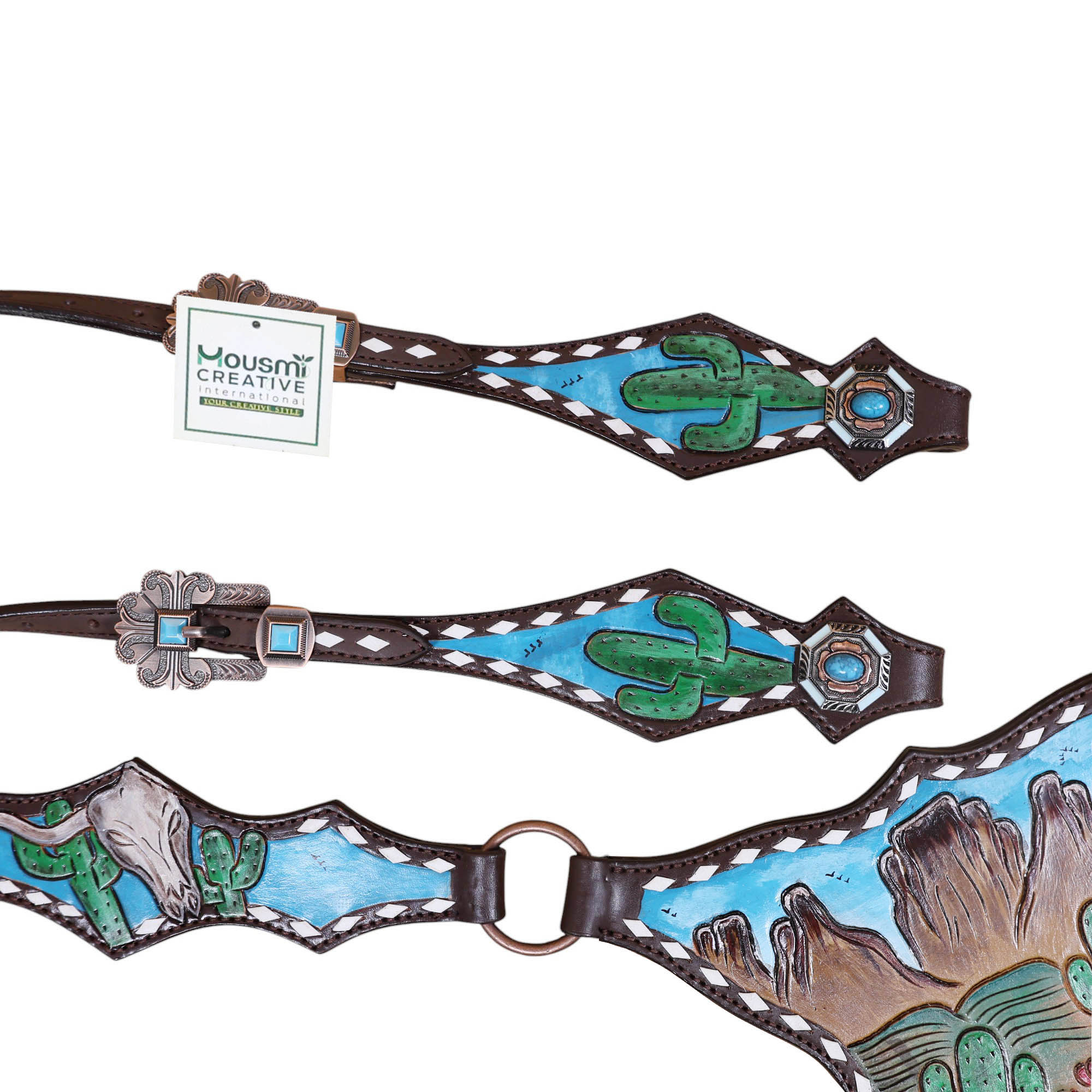 Headstall Type: Western Leather Headstall and Breast Collar tack Set decorated with Mountain and cactus with STEER HEAD carving and beautiful hand painted Scenery gladiator style breast collar with white raw hide braiding