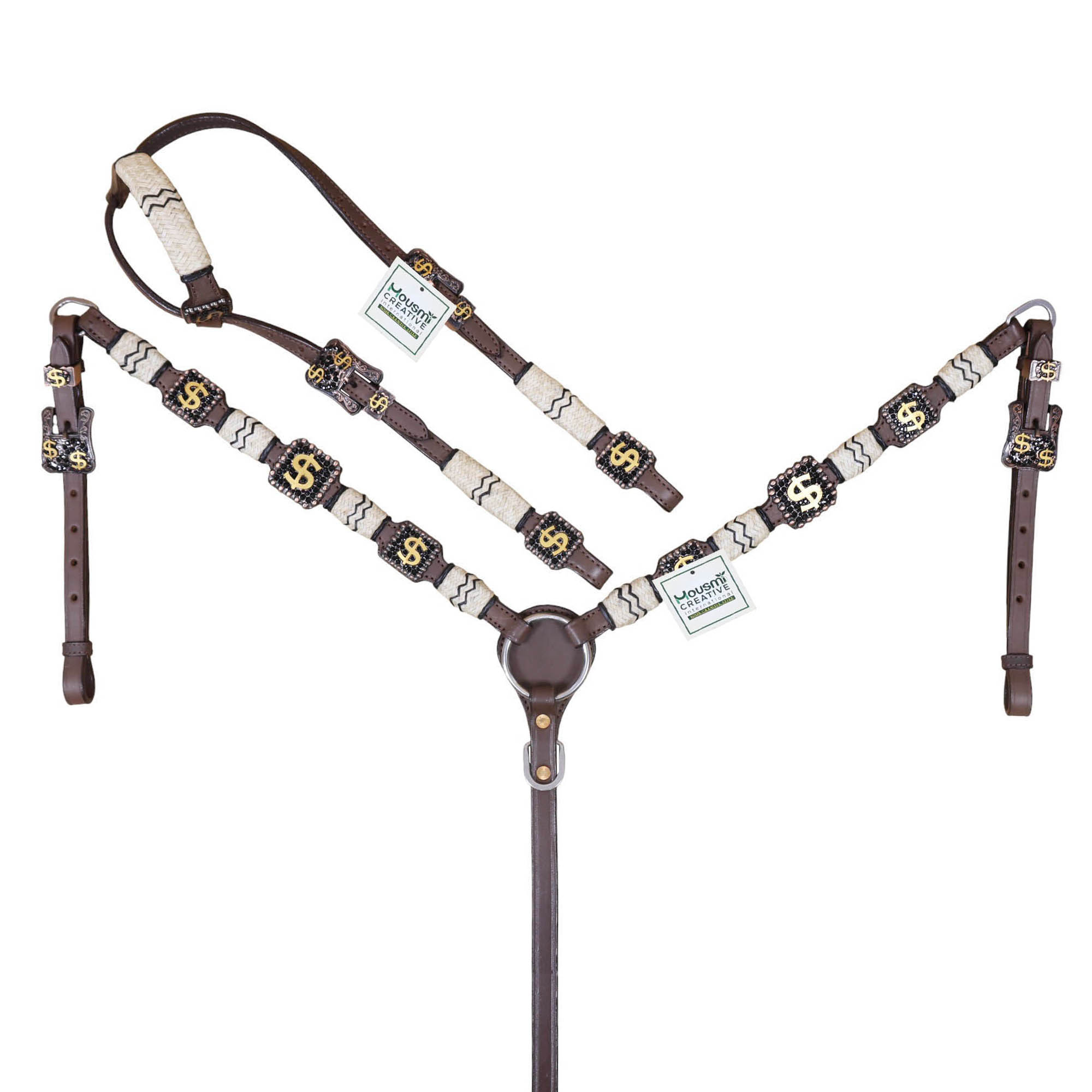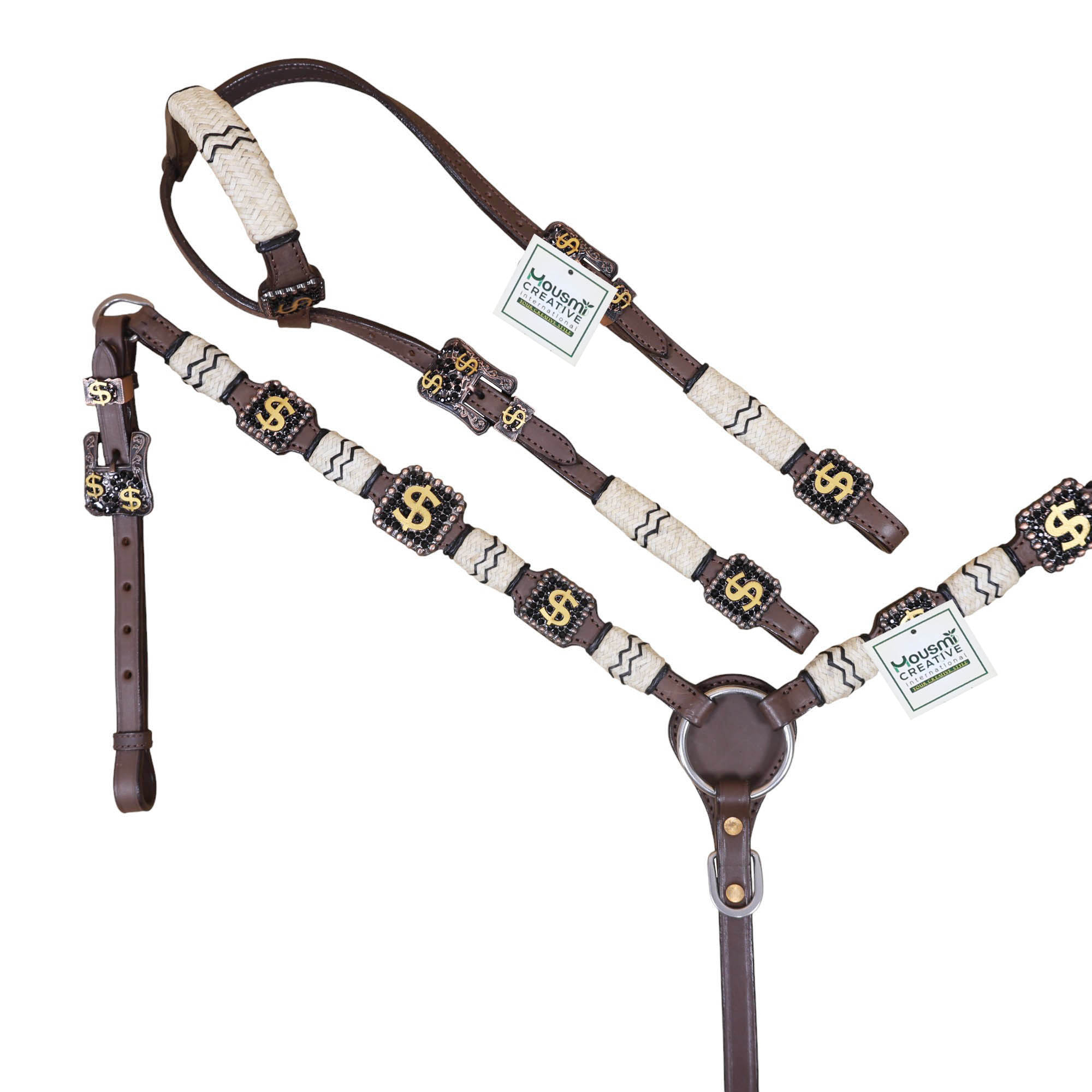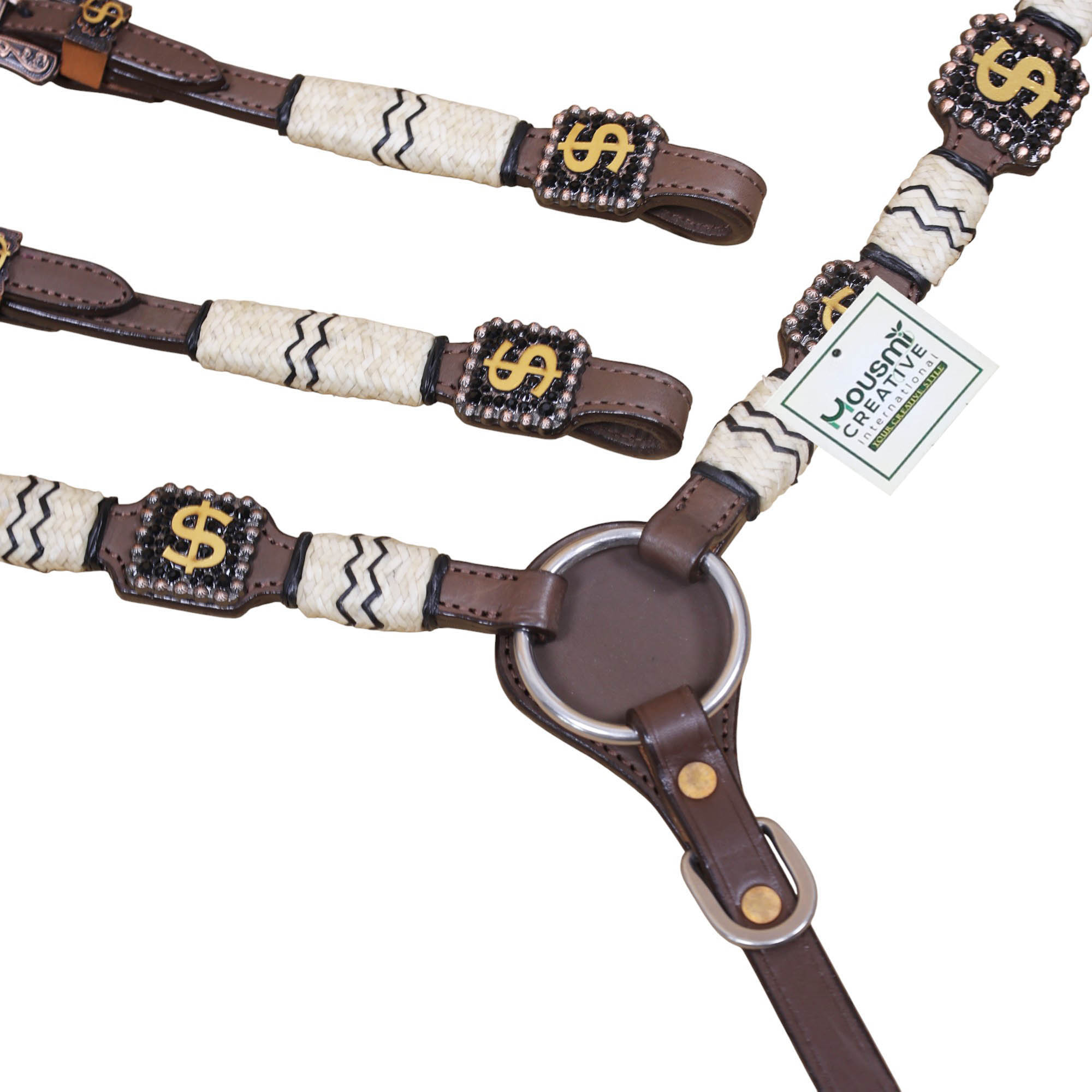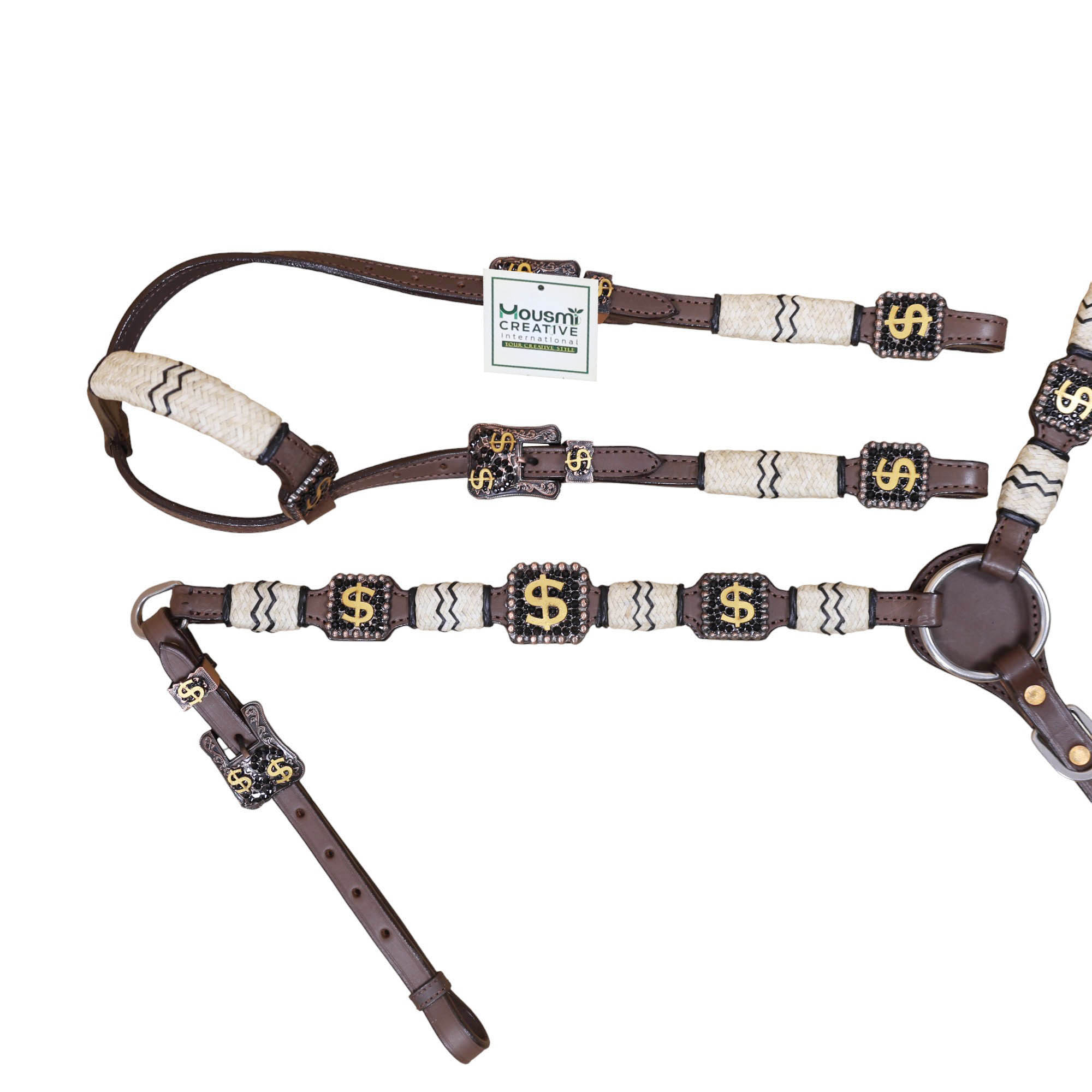 Headstall Type: Headstall and Breast Collar tack Set decorated with Rawhide knotting with 3D golden Dollar $ sign conchos and buckle with black stones.