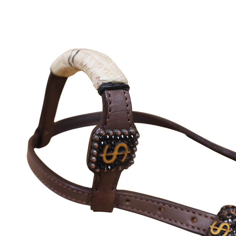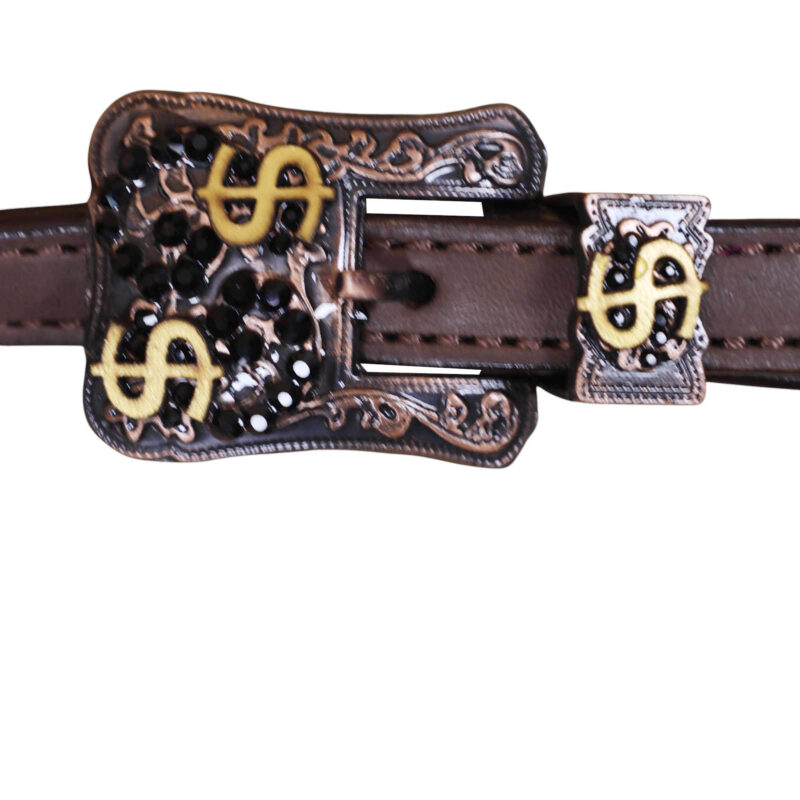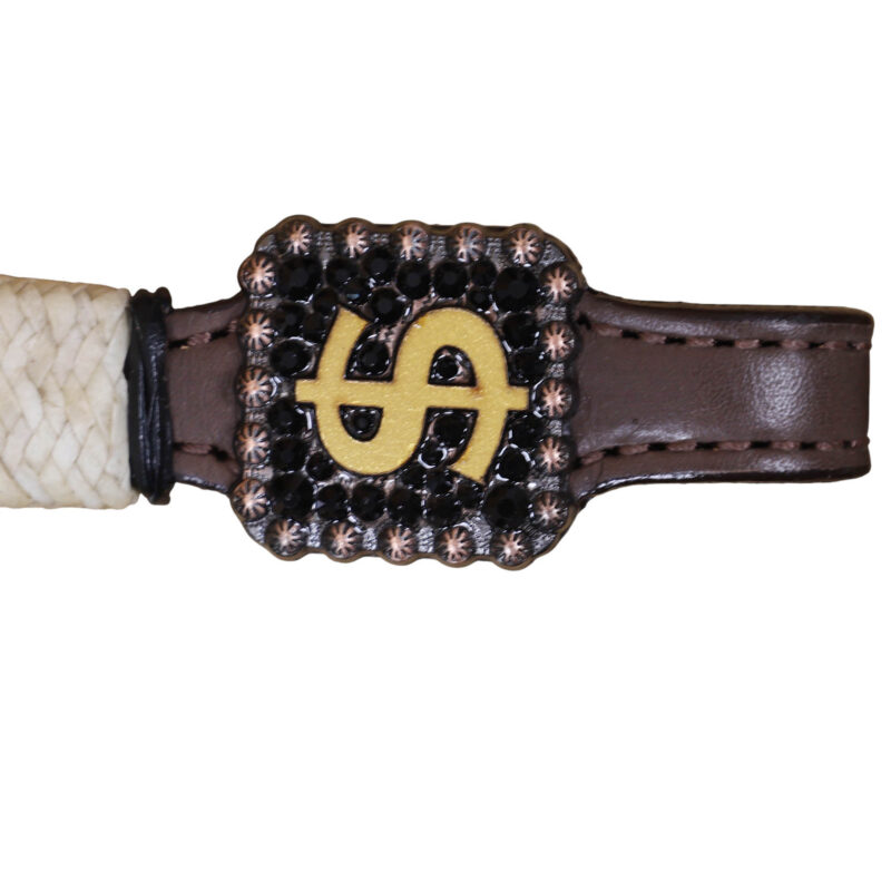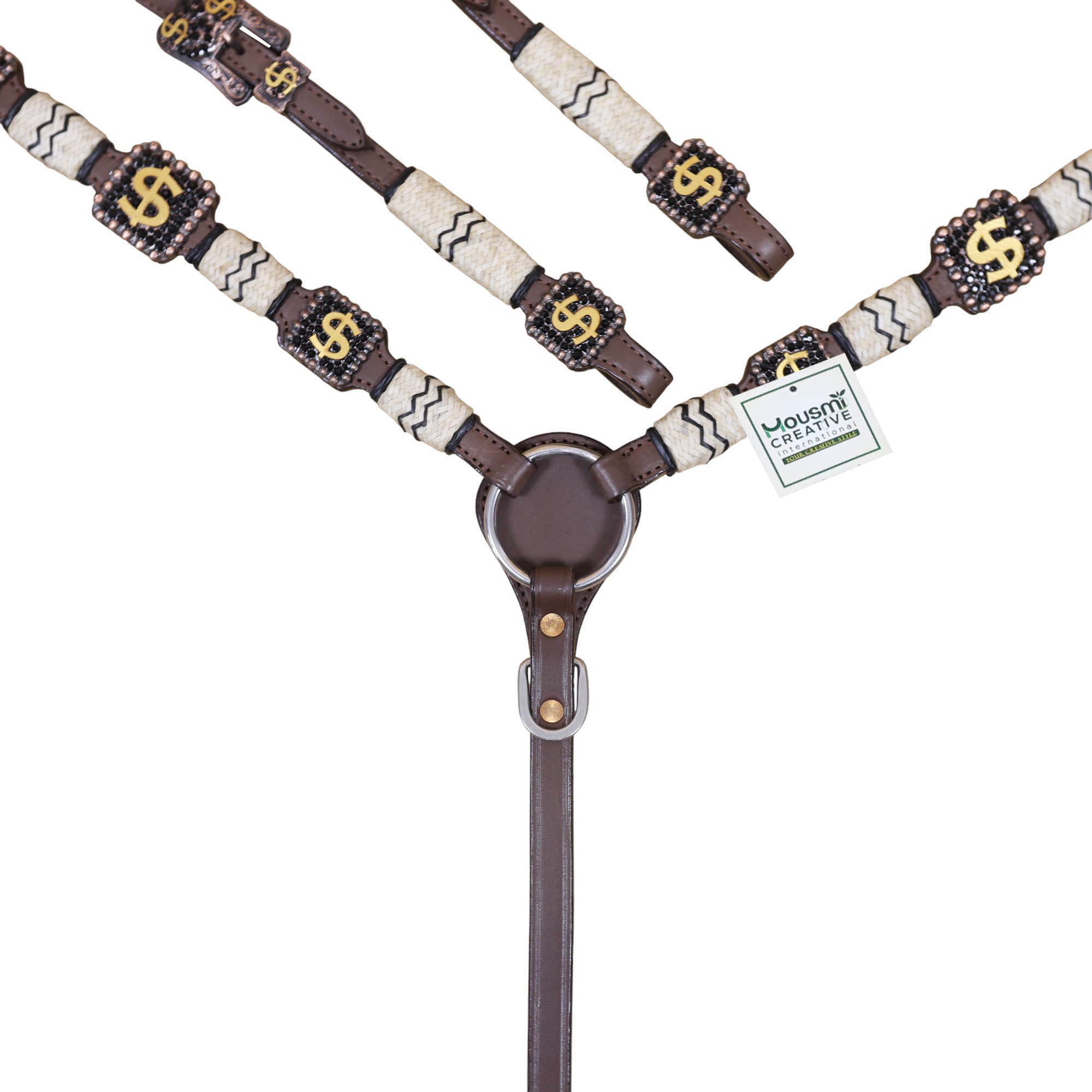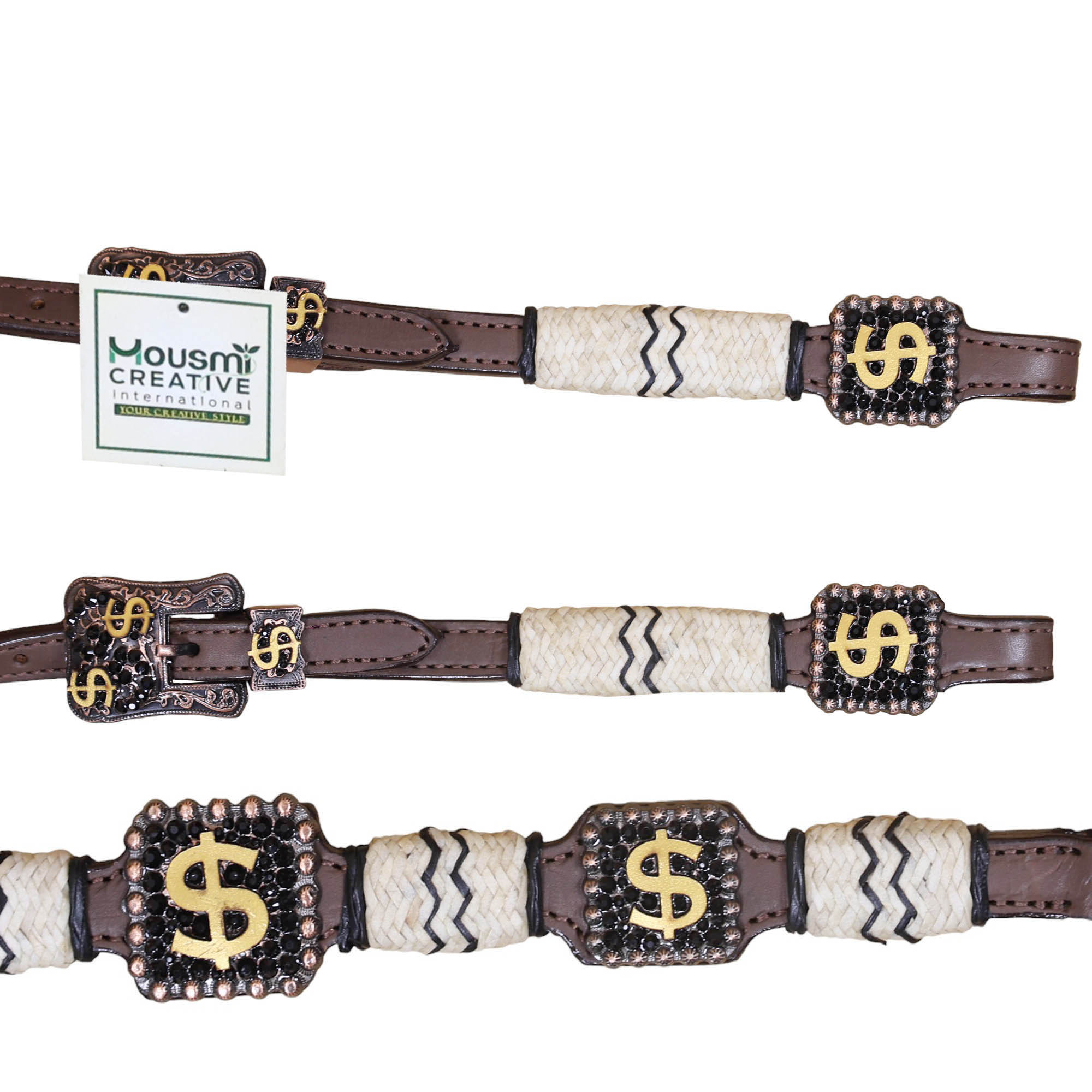 Headstall Type: Headstall and Breast Collar tack Set decorated with Rawhide knotting with 3D golden Dollar $ sign conchos and buckle with black stones.