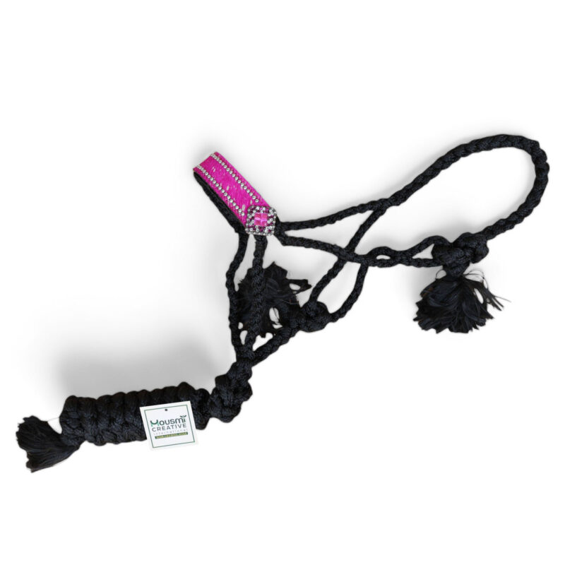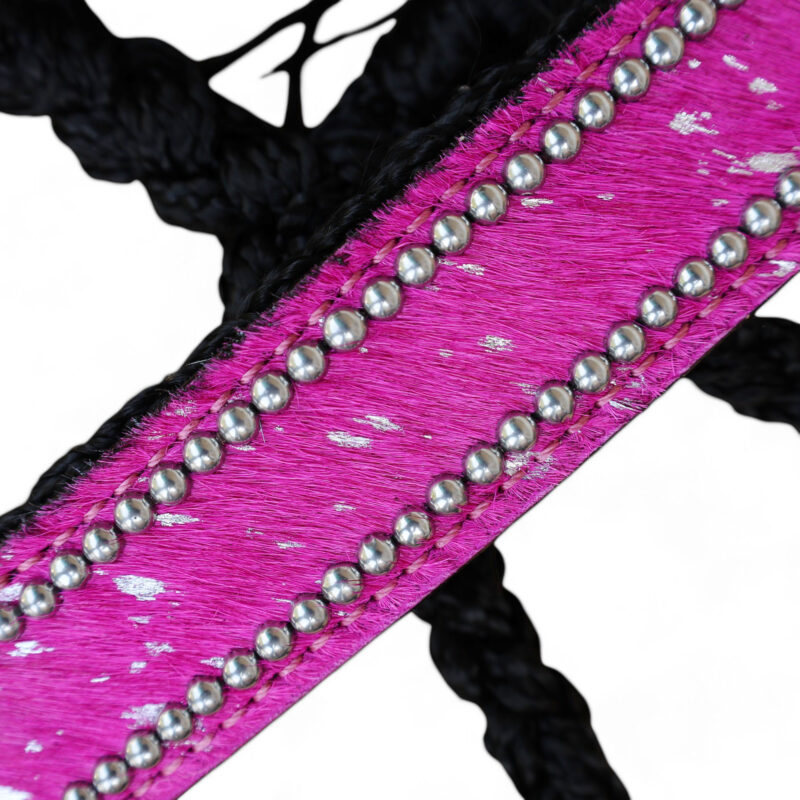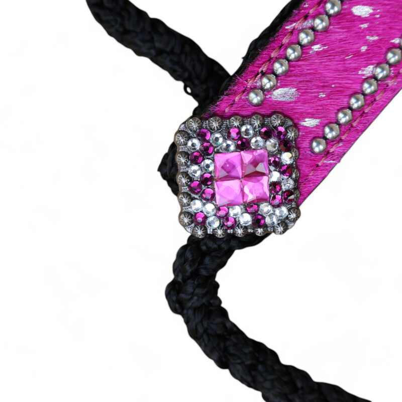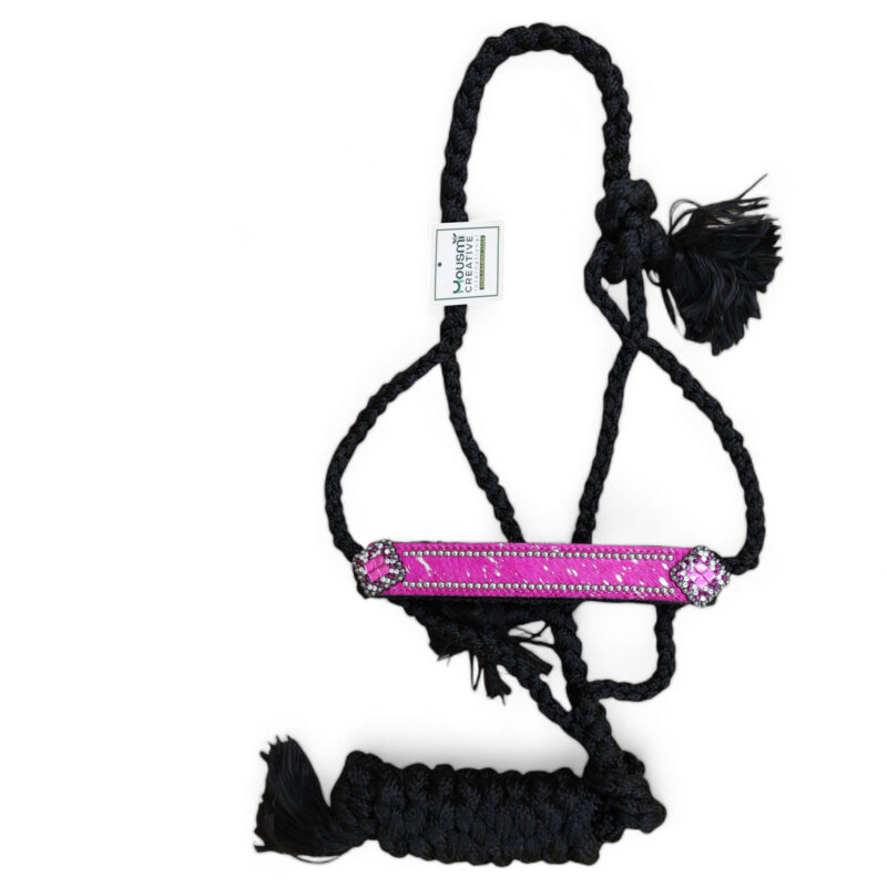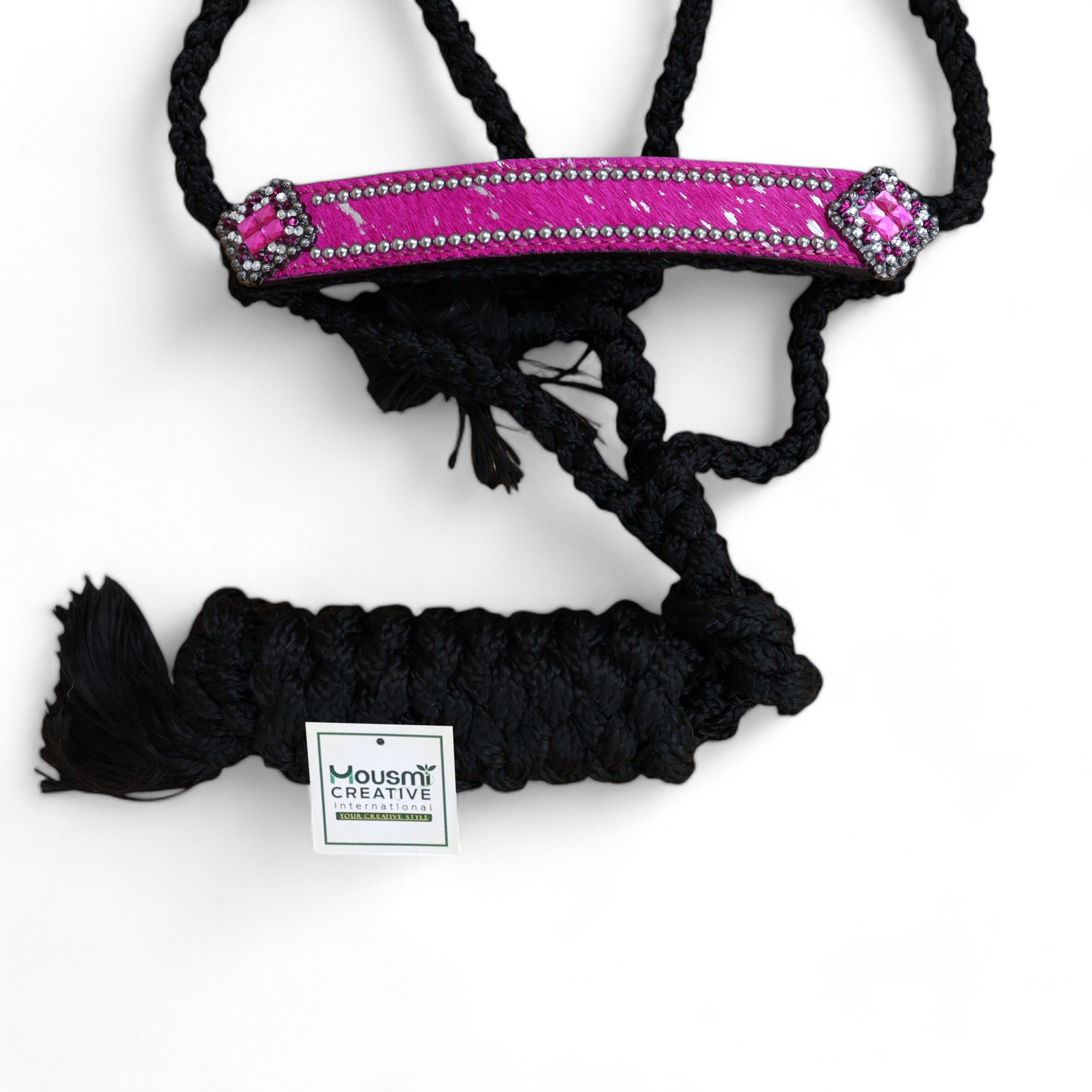 Genuine Cowhide Acid Wash Hair on Leather Noseband, Braided Mule Tape Lead Rope Halter Decorated With Matching Rhinestones Jeweled Fancy Conchos Both Side of Noseband. Our Skilled Artisans and Craftsman’s Team, Providing a Premium Appearance to You and Your Horse too While Riding or Working.