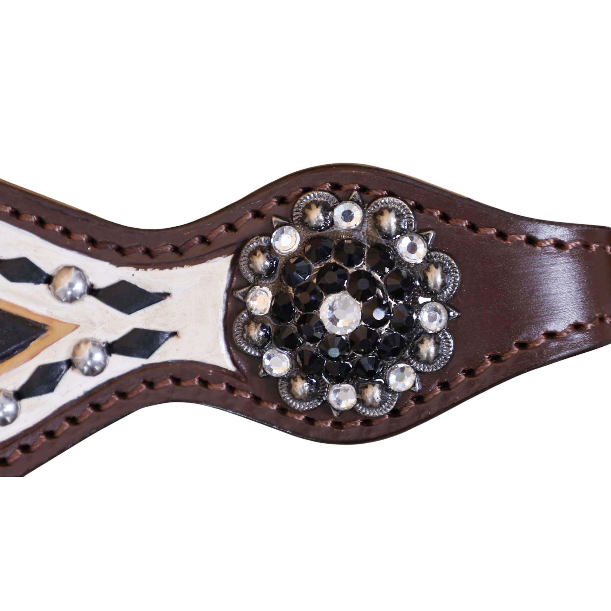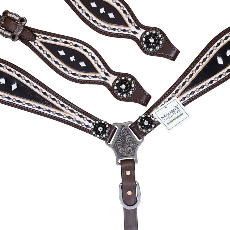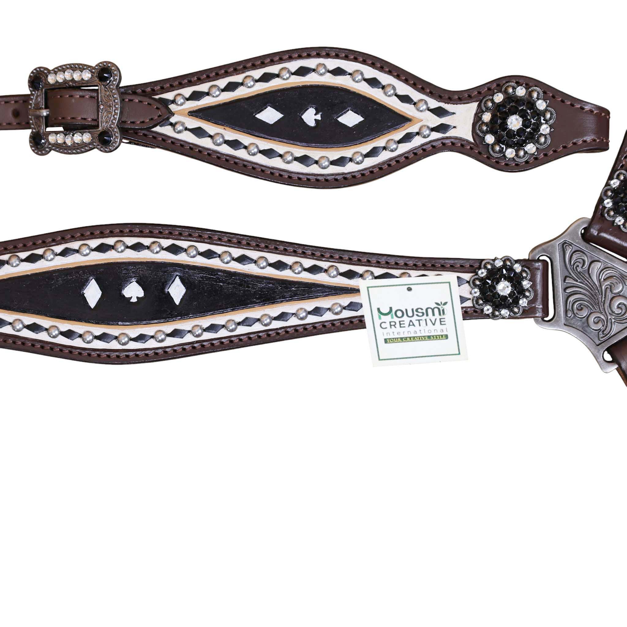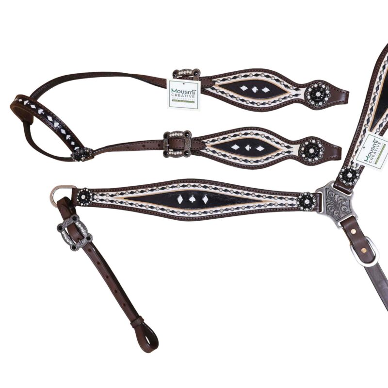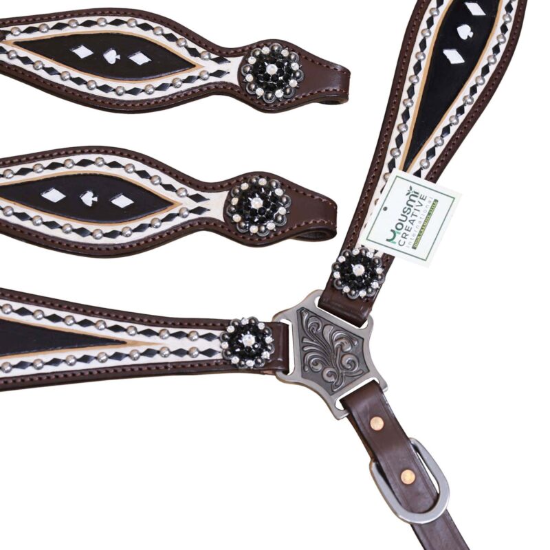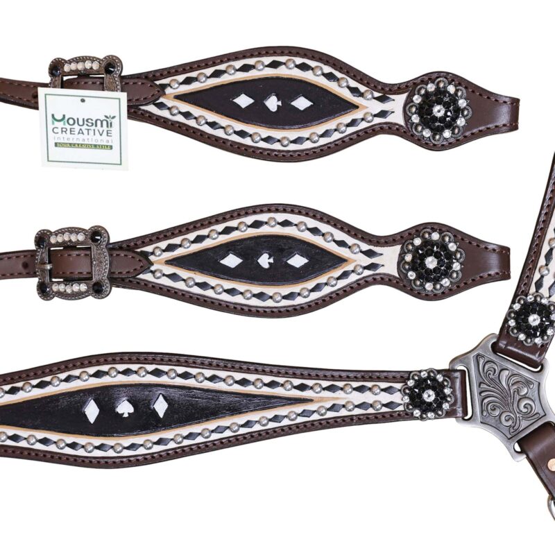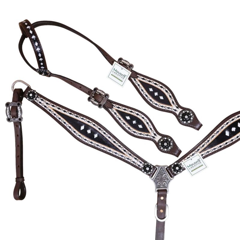 Headstall Type: Headstall and Breast Collar tack Set decorated with Black and White hand Painting with gamble symbol tooling with silver studs and black raw hide braiding includes black and white rhinestone berry concho