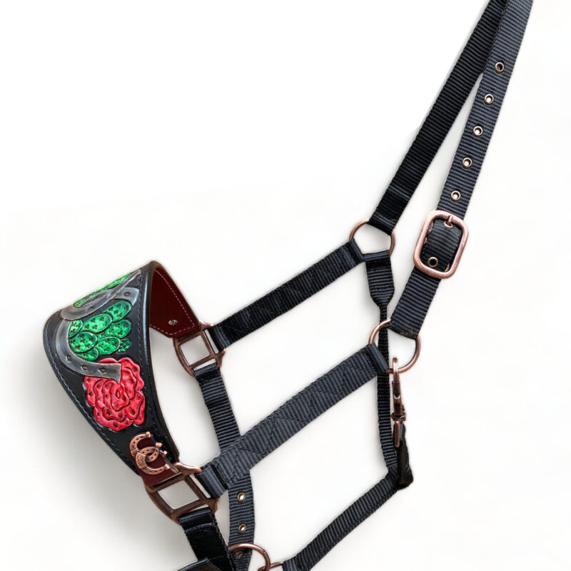 - Bronc Halter Decorated with horse shoe concho with horse shoe carving with rose and cactus around