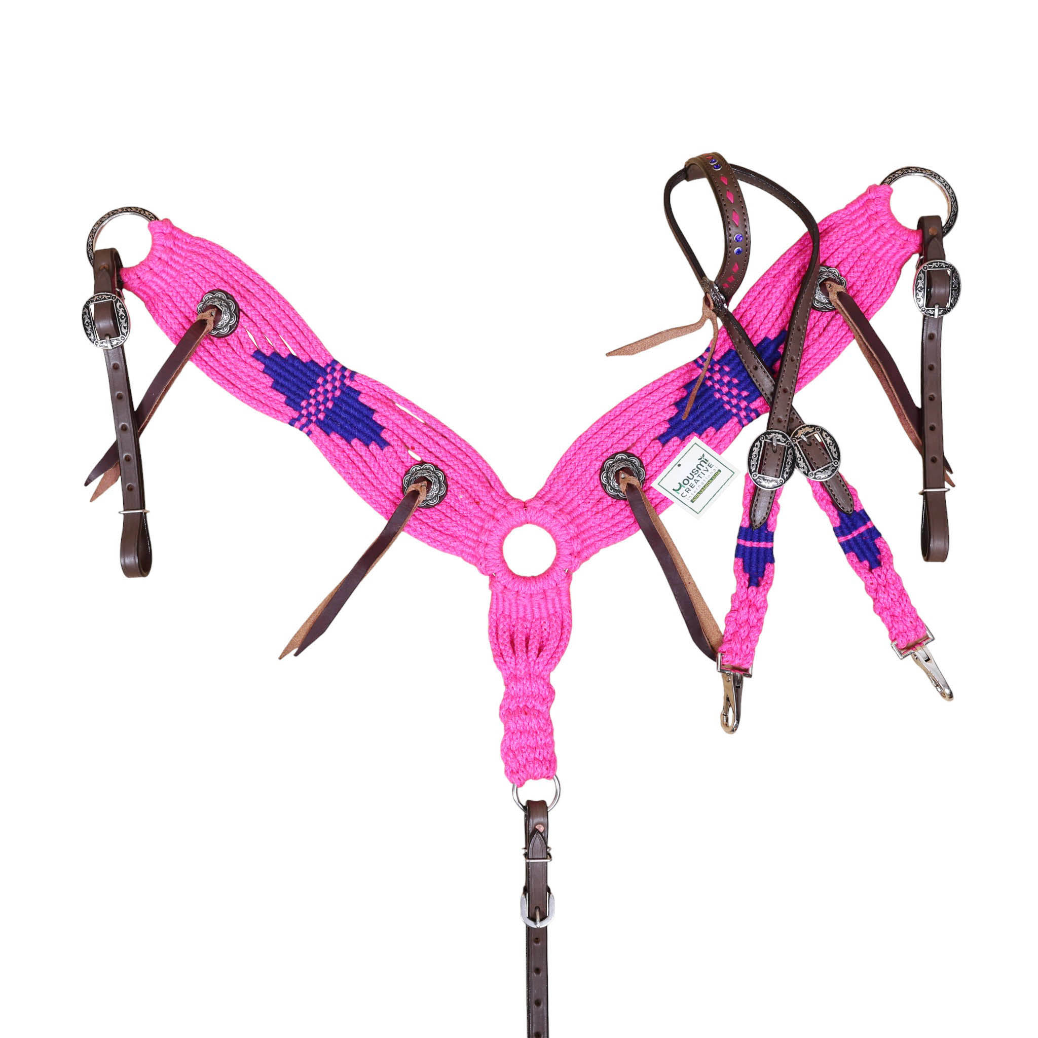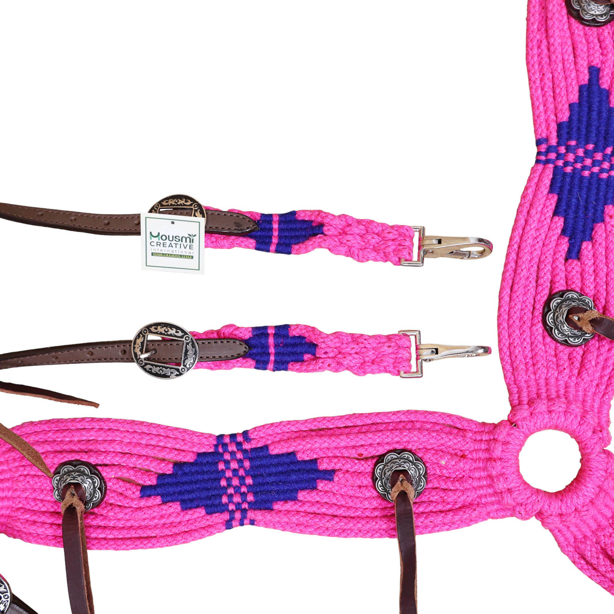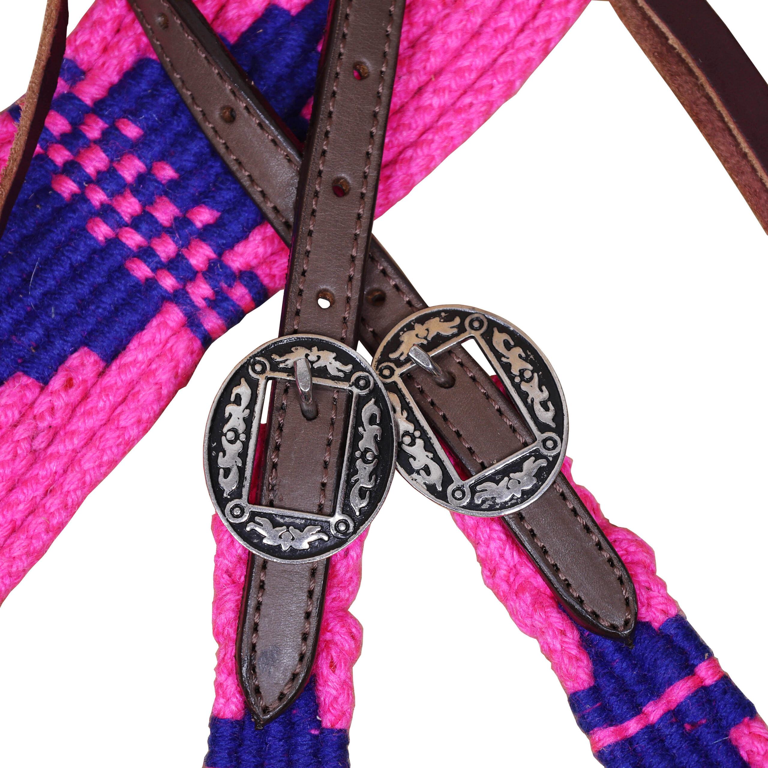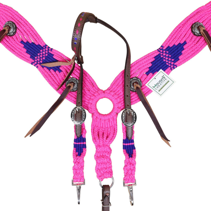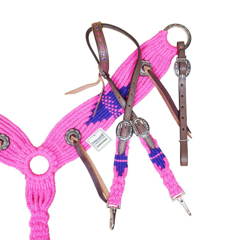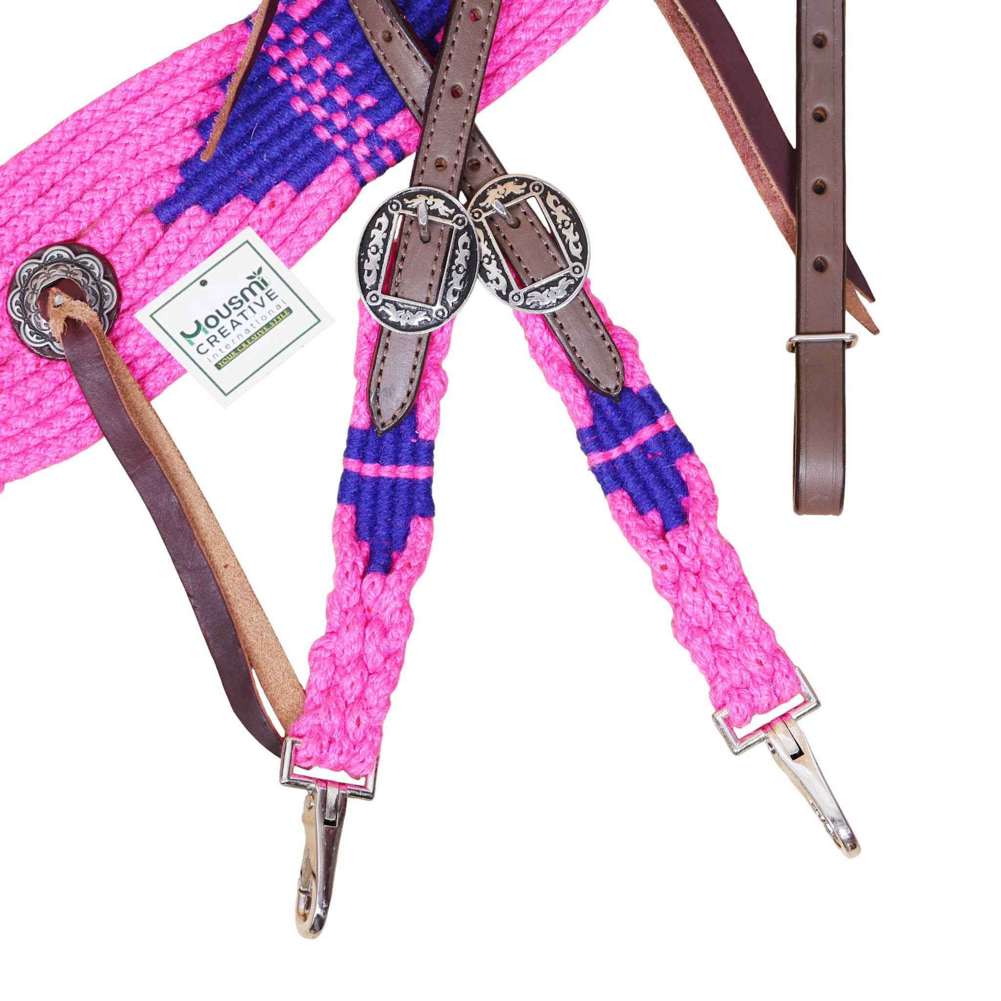 Headstall Type: Western Headstall and Breast Collar tack Set decorated with Pink and royal Mohair Headstall tack set decorated with matching front girth 32″ on Argentina leather