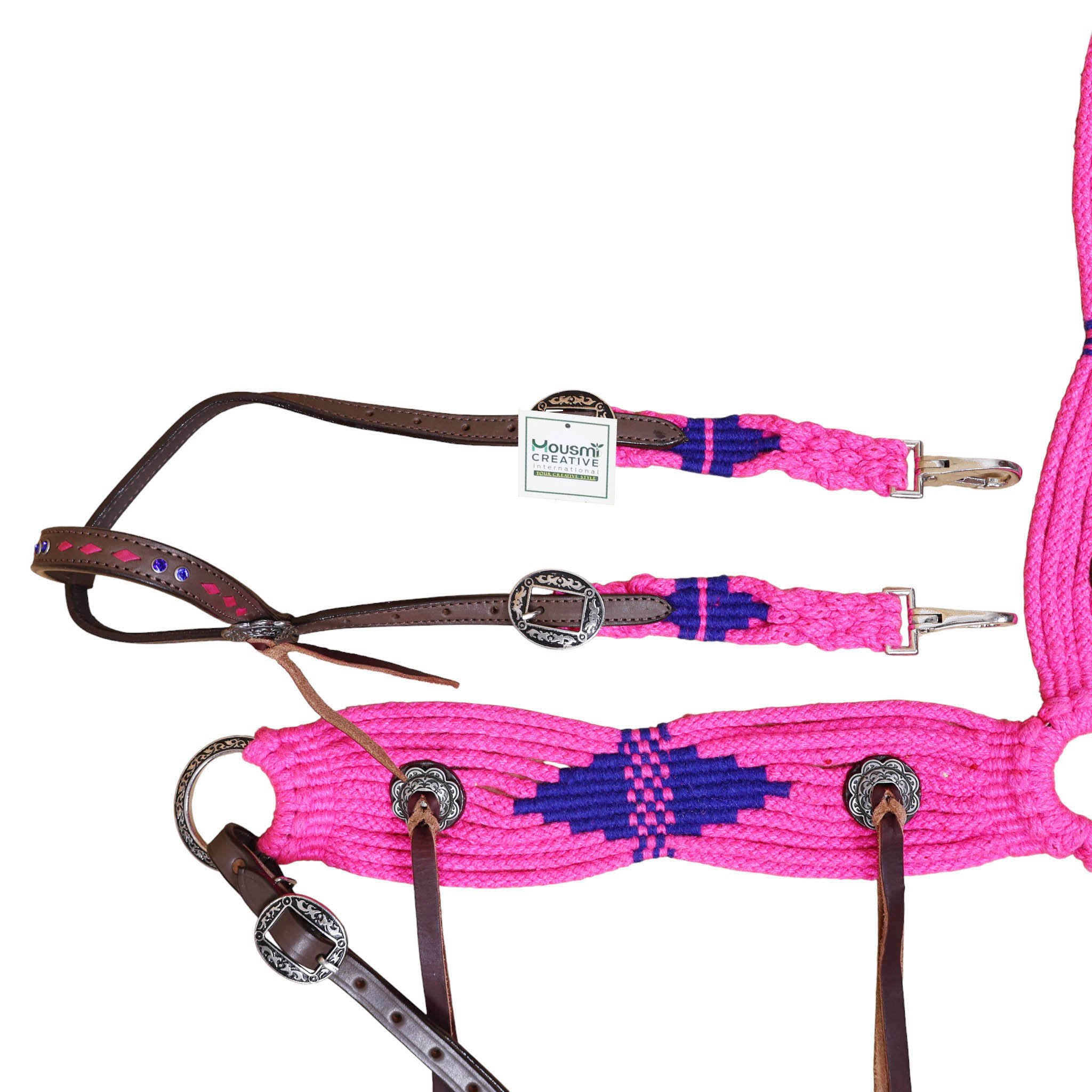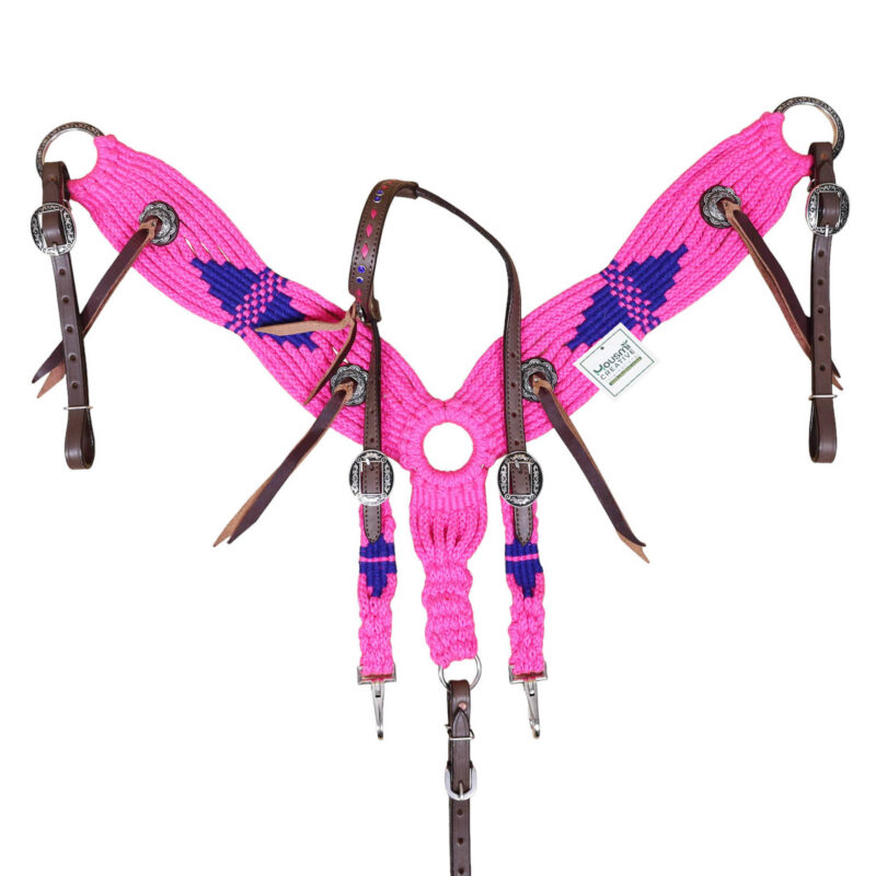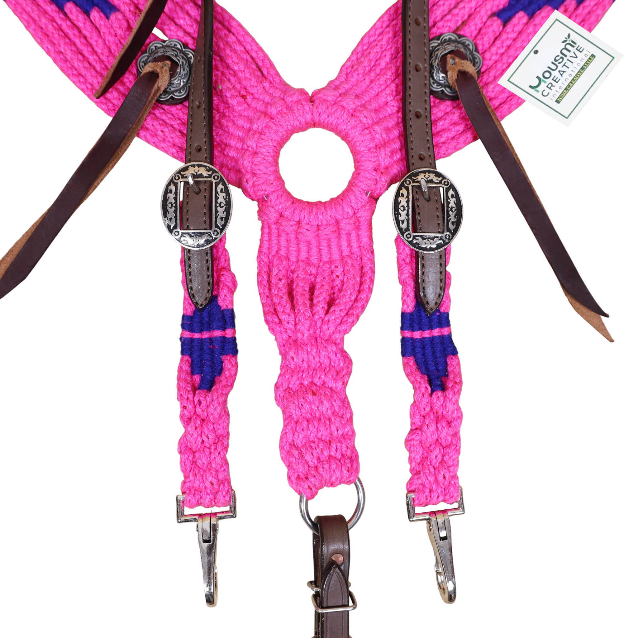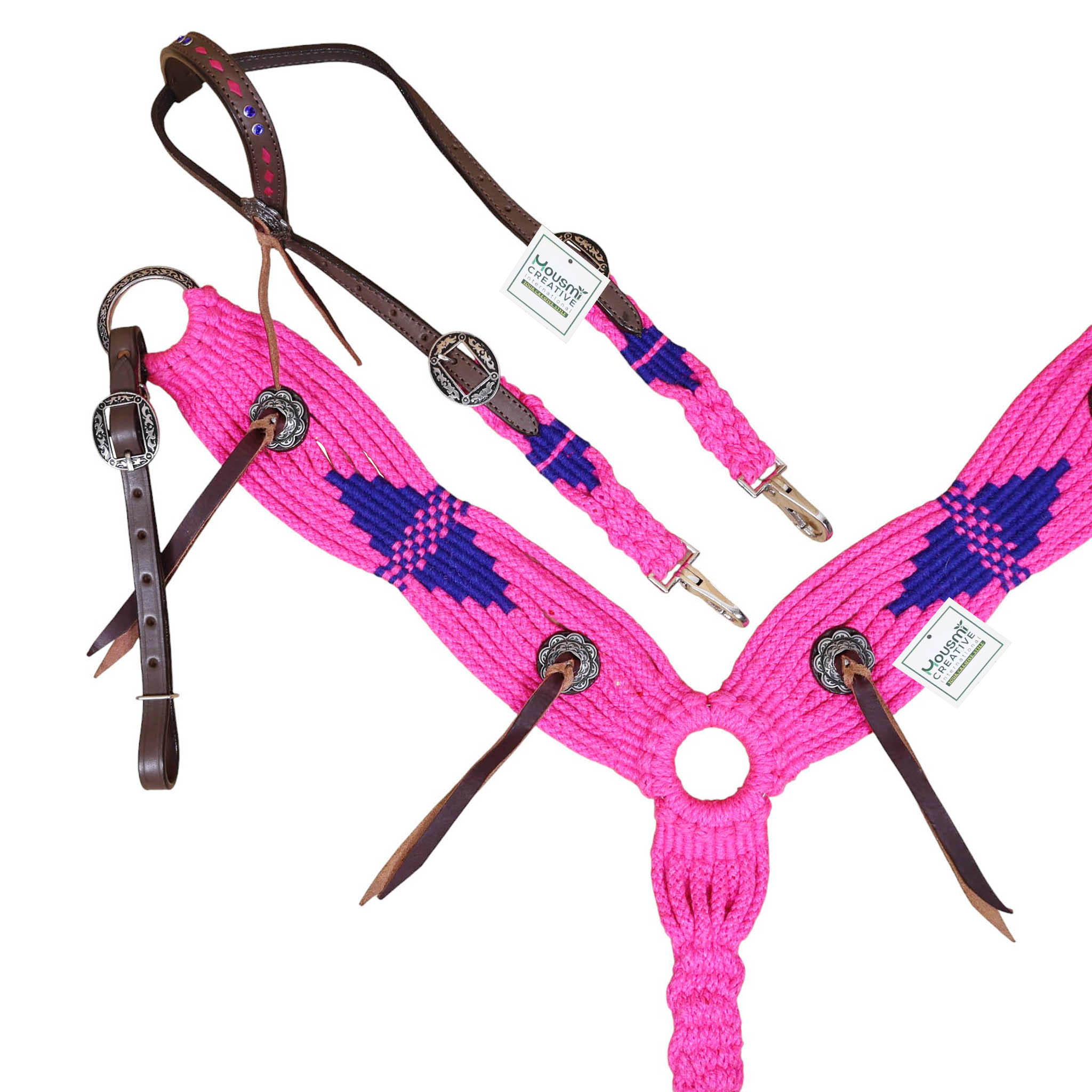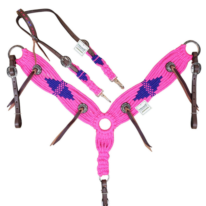 Headstall Type: Western Headstall and Breast Collar tack Set decorated with Pink and royal Mohair Headstall tack set decorated with matching front girth 32″ on Argentina leather