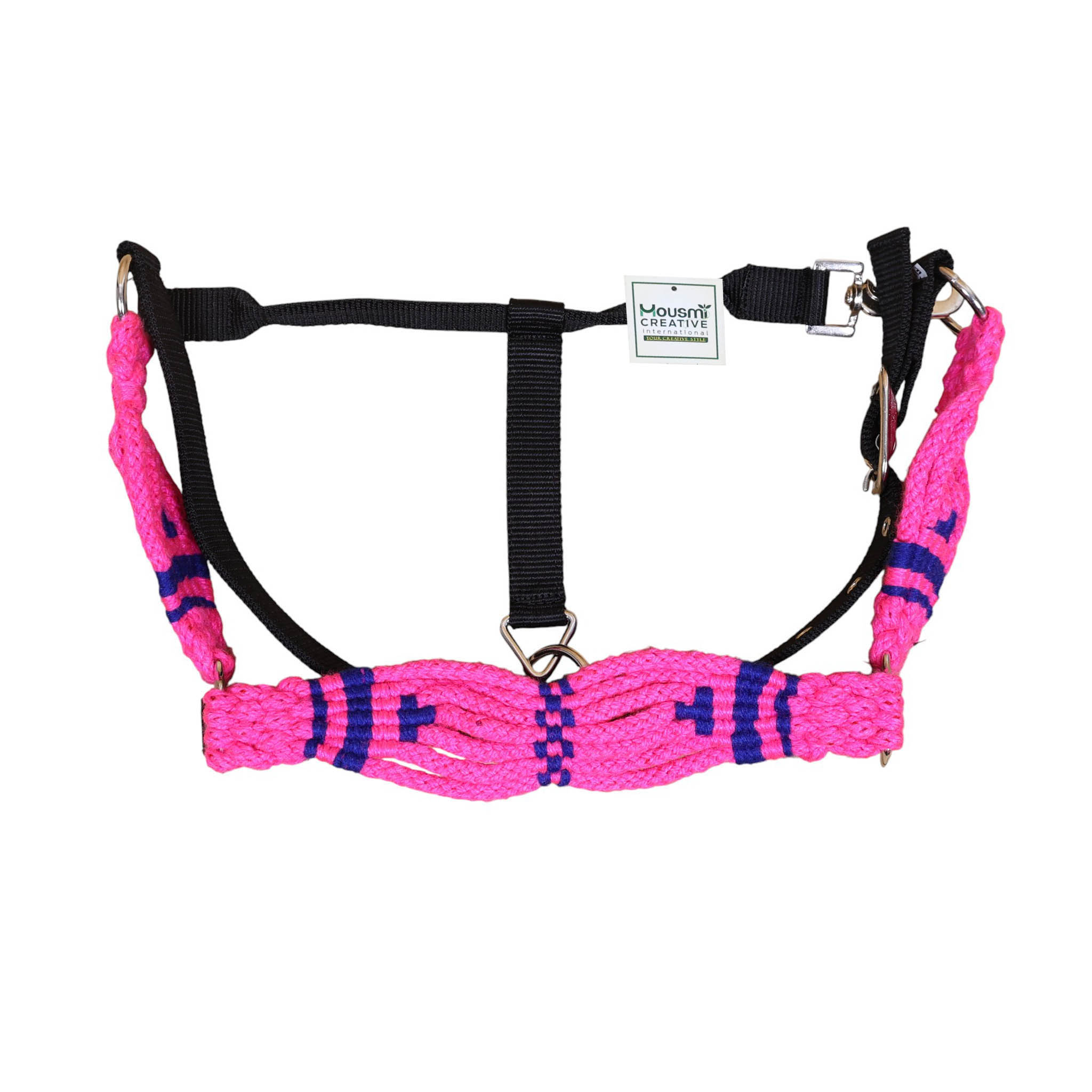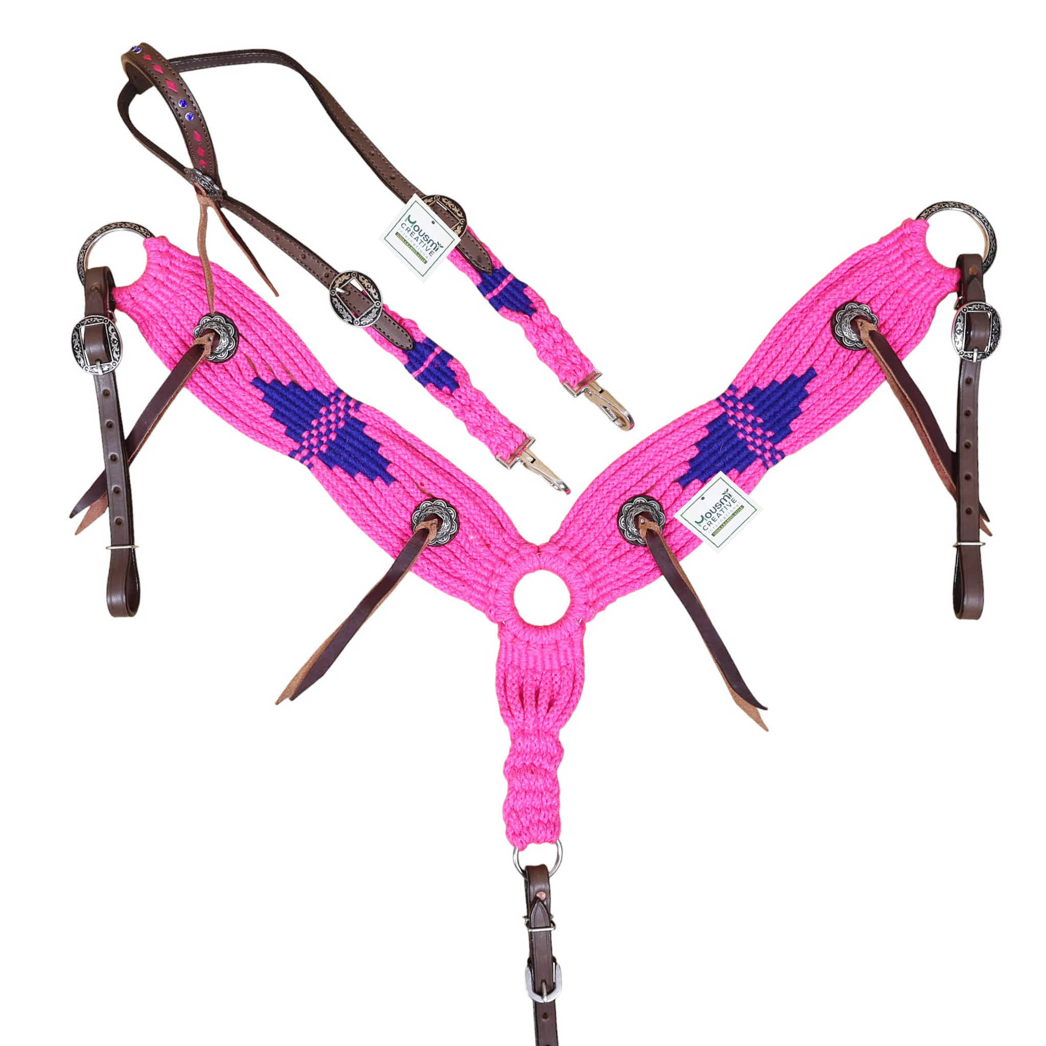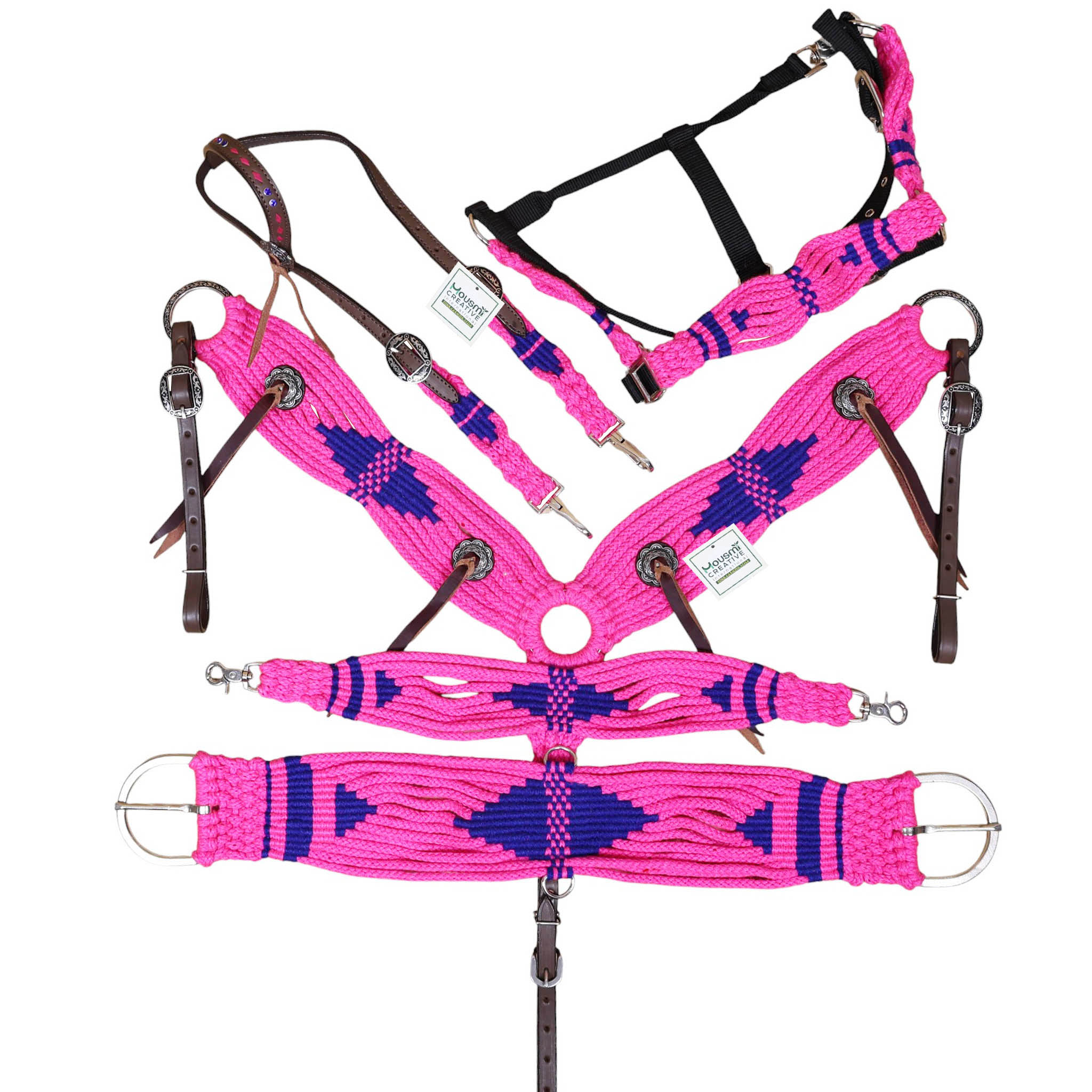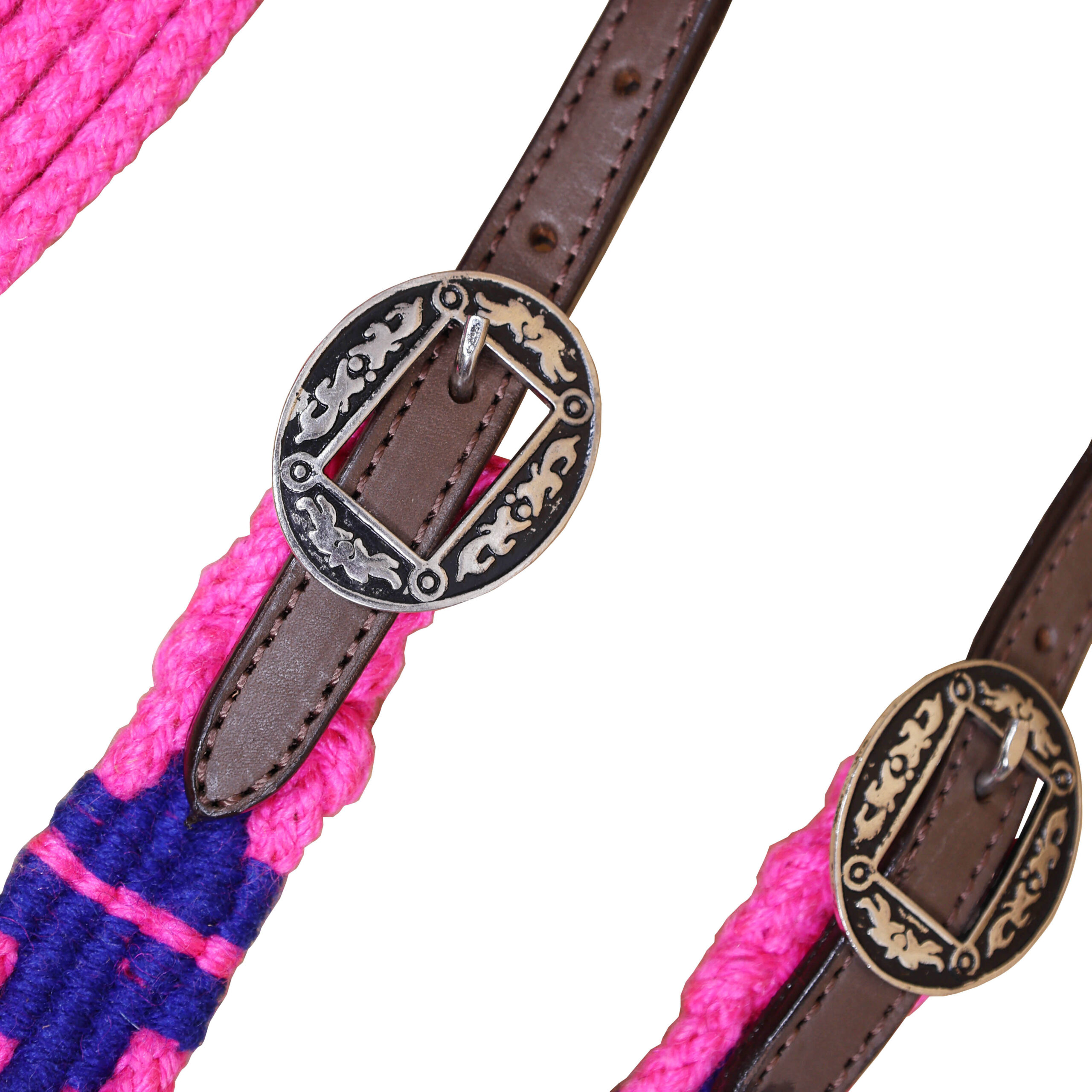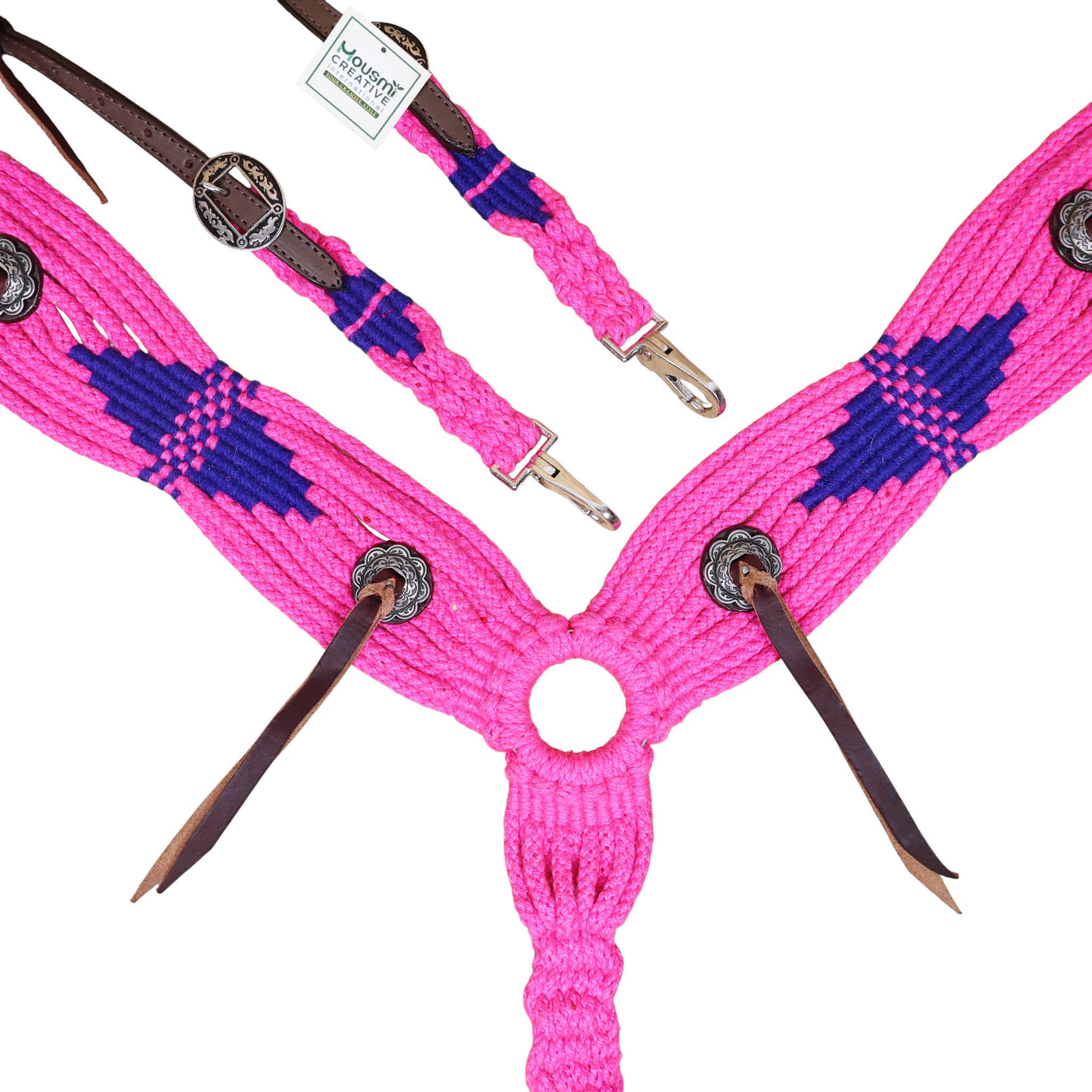 Headstall Type: Western Headstall and Breast Collar tack Set decorated with Pink and royal Mohair Headstall tack set decorated with matching front girth 32″ on Argentina leather