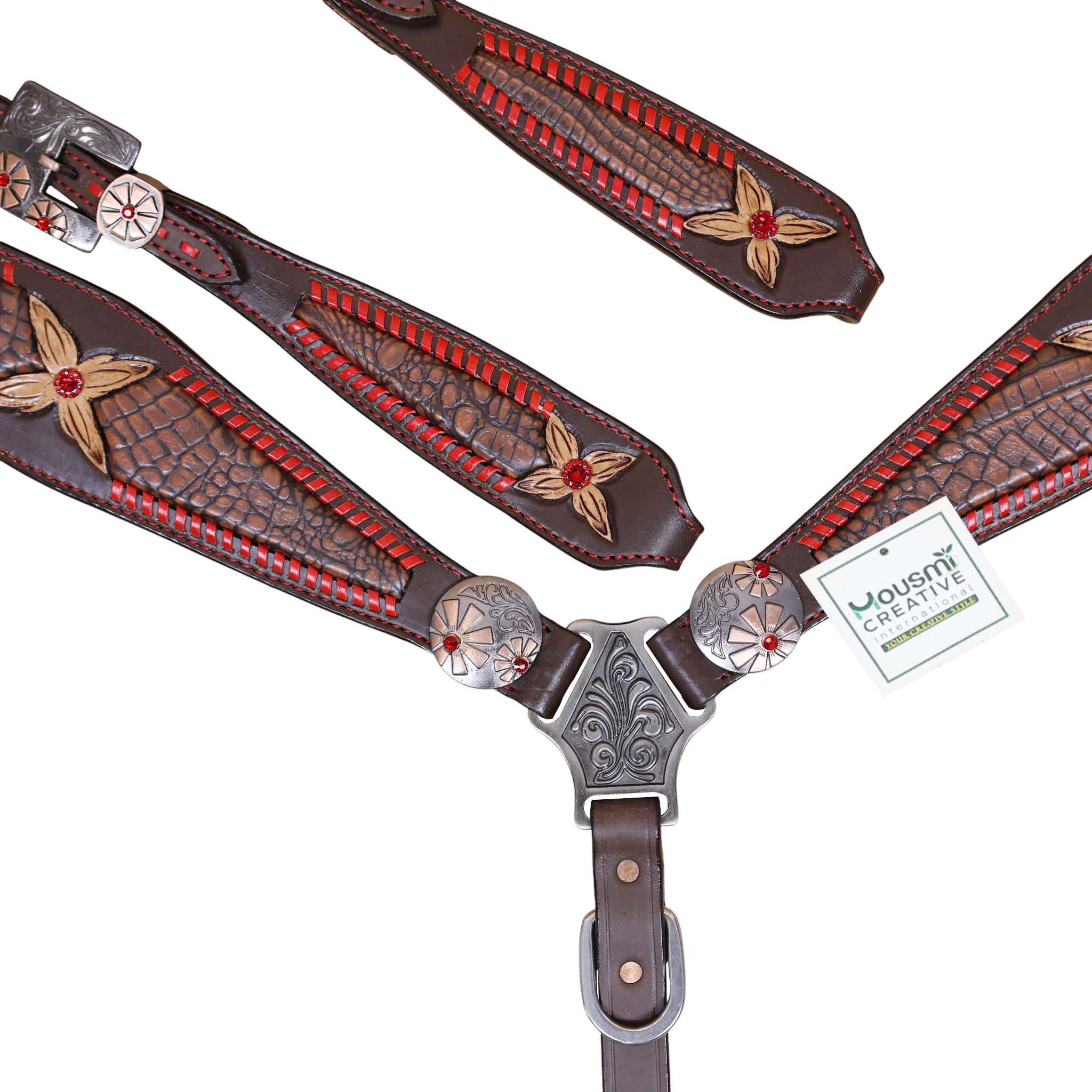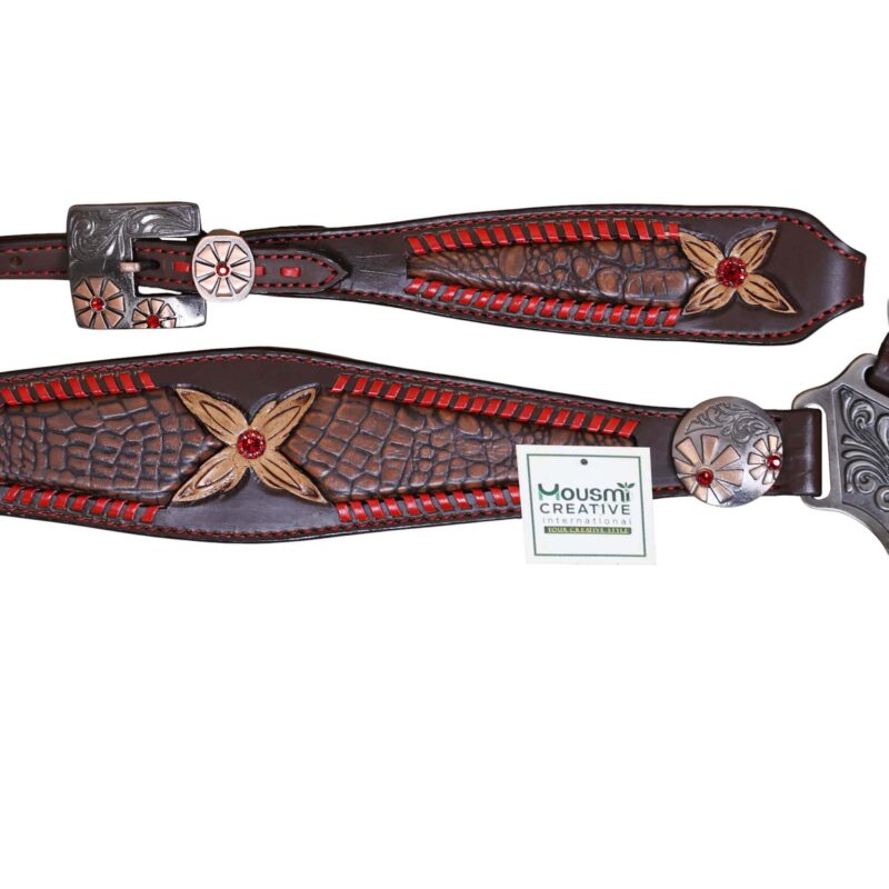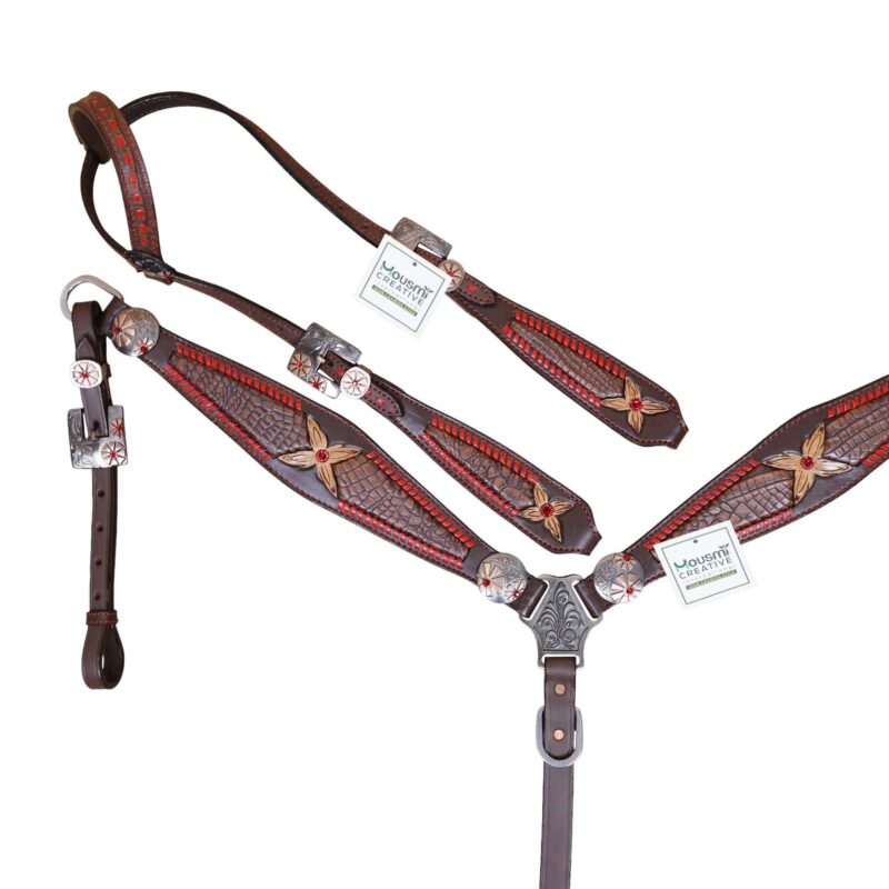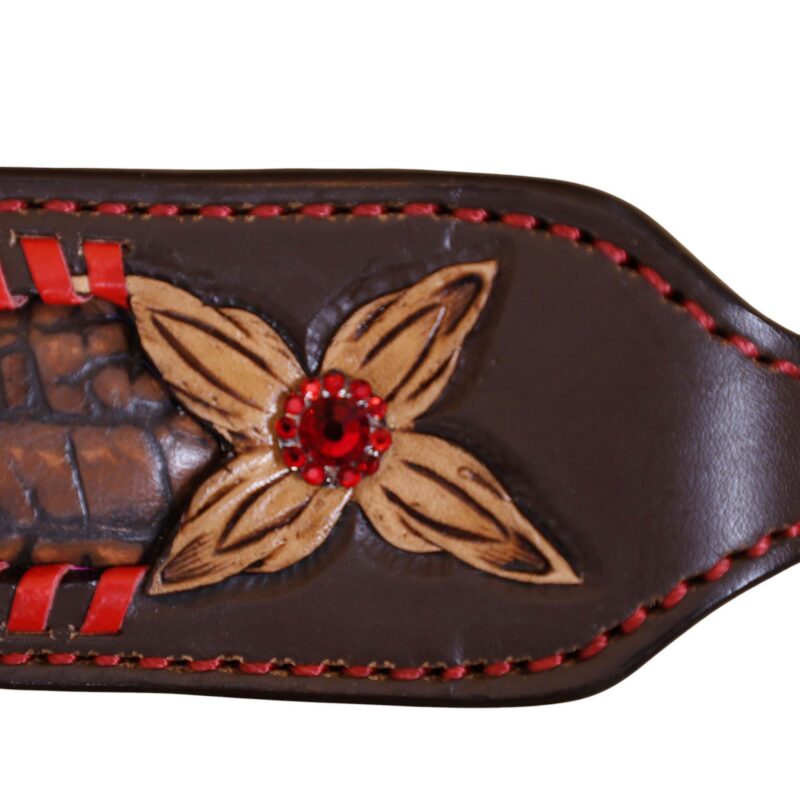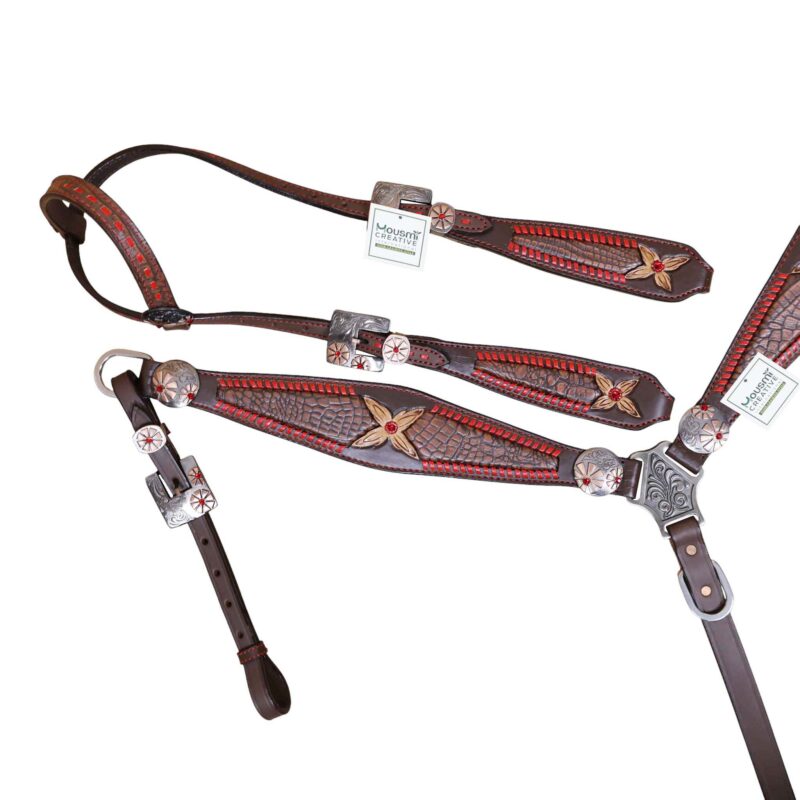 Headstall Type: Headstall and Breast Collar tack Set decorated with Red raw hide wipe stitching with tan colour alligator inlay and 2 tone hardware with red jewel flower carving