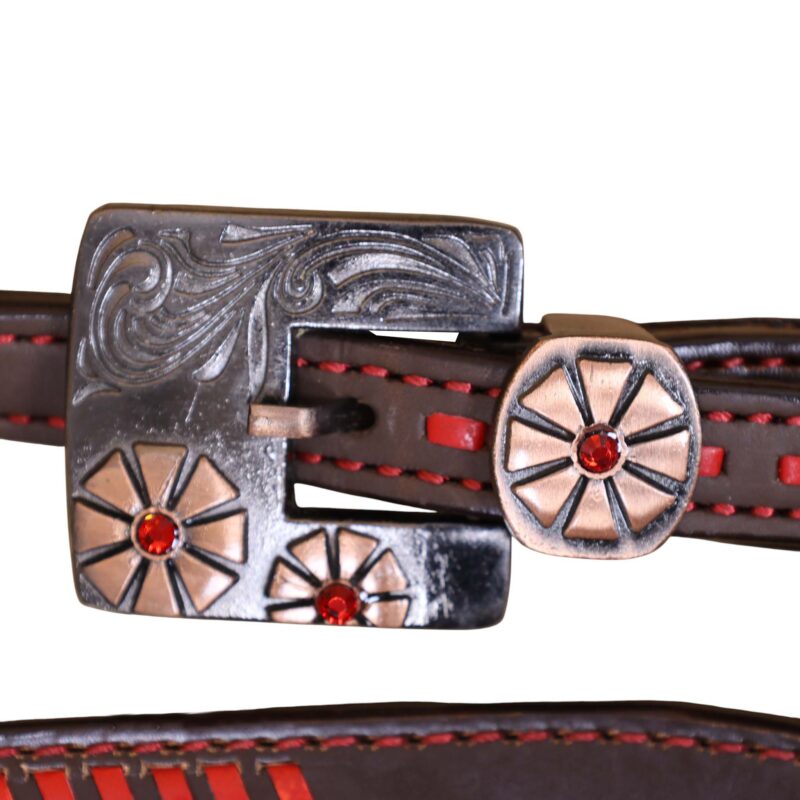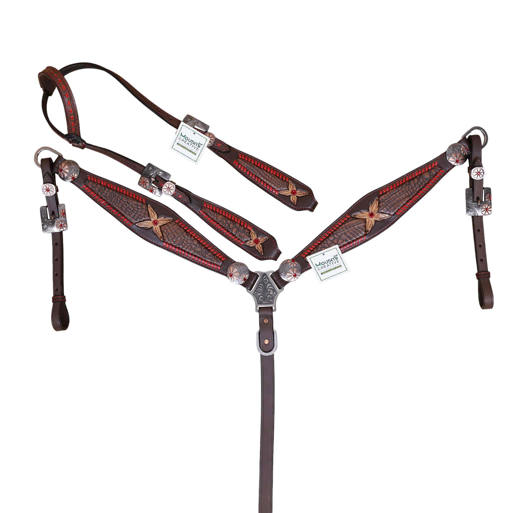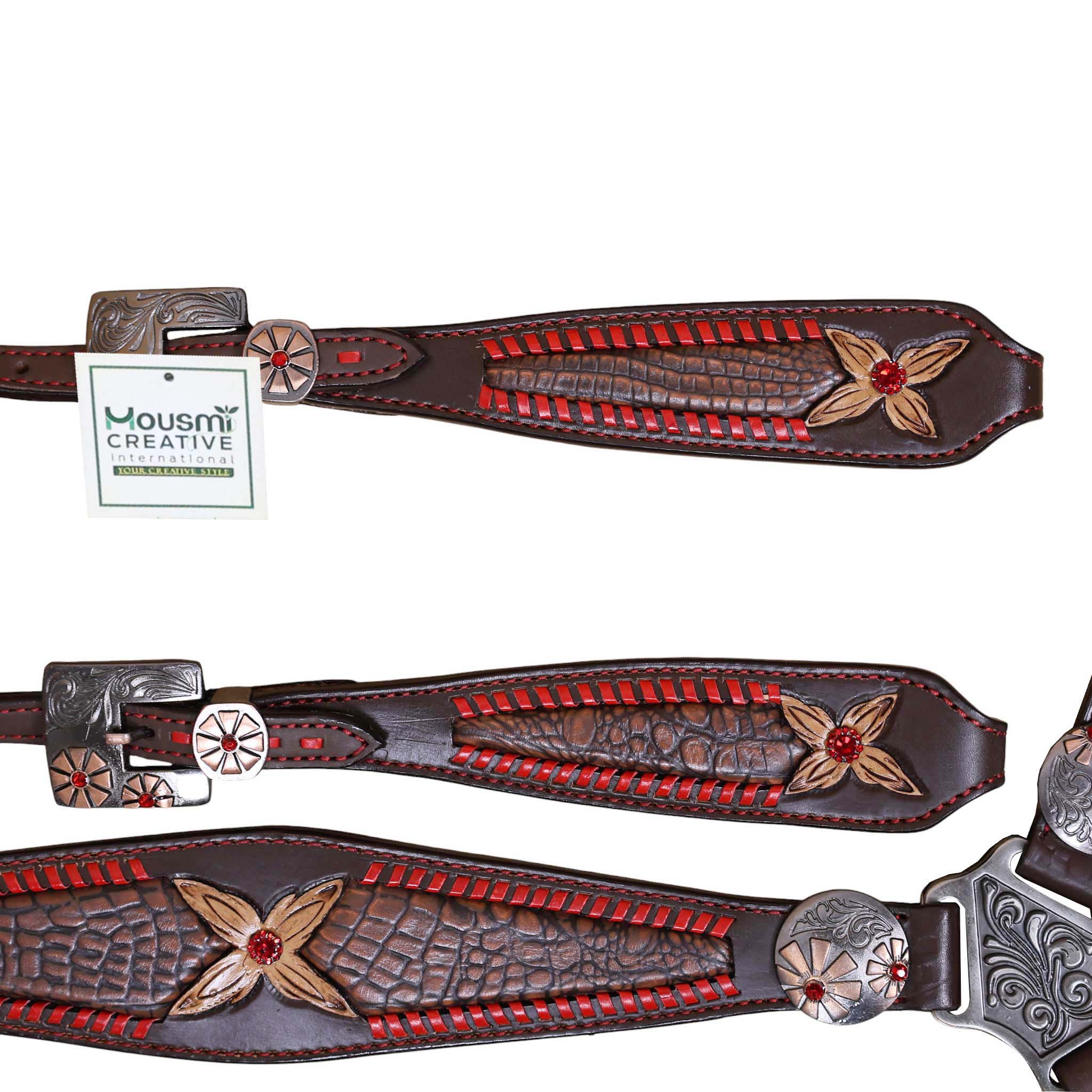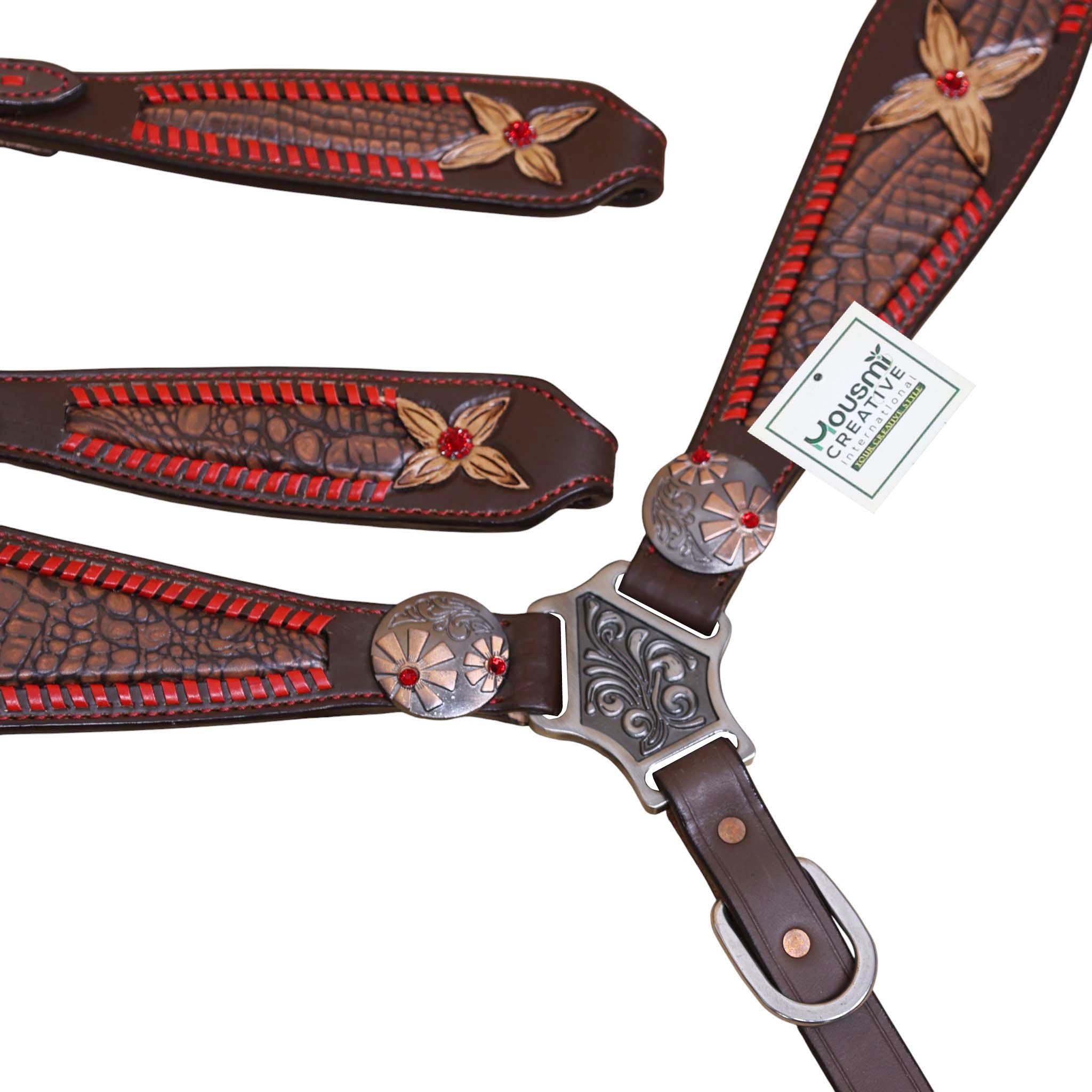 Headstall Type: Headstall and Breast Collar tack Set decorated with Red raw hide wipe stitching with tan colour alligator inlay and 2 tone hardware with red jewel flower carving