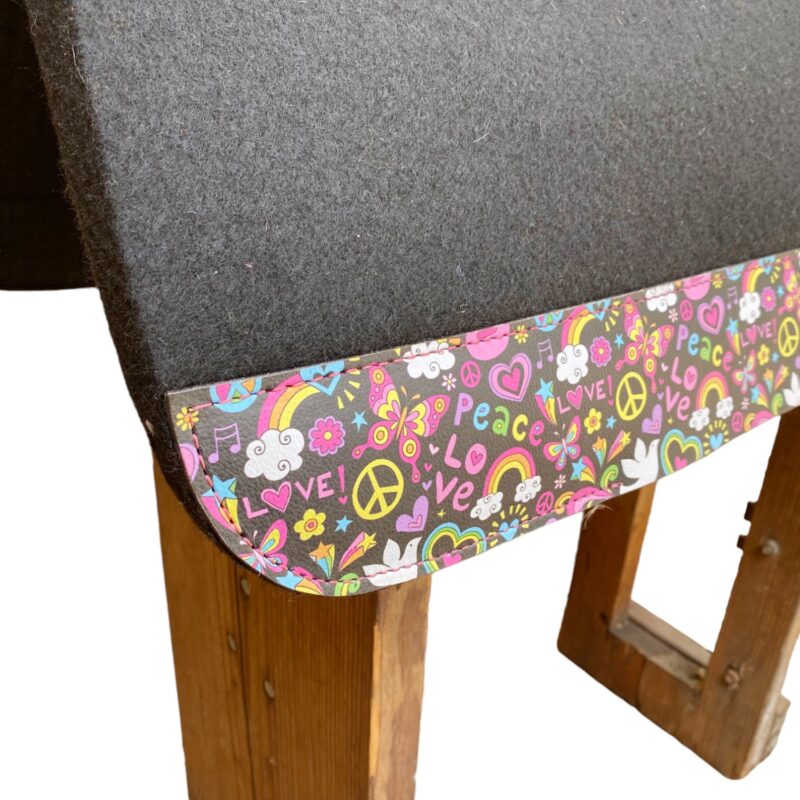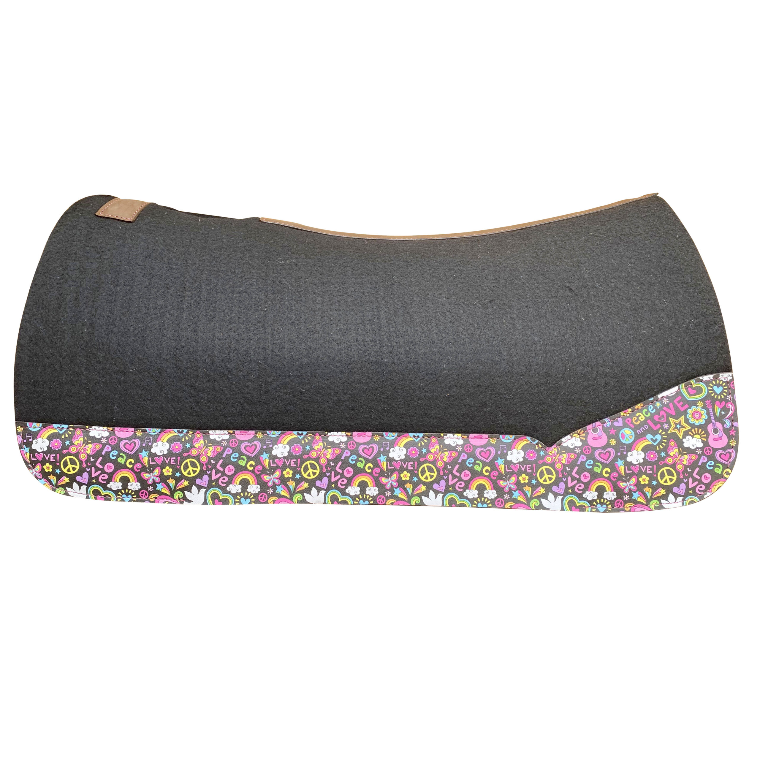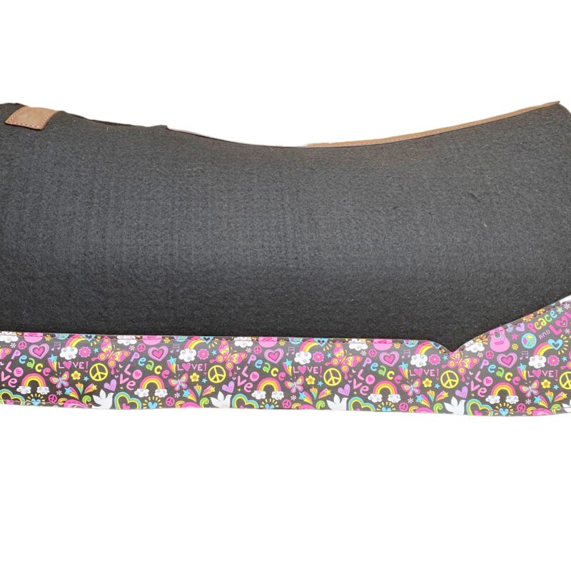 Description: Saddle Pad with Cut out wither and leather reinforced spin and printed heart emojis patch inlay at the bottom of the pad on Argentina cow leather