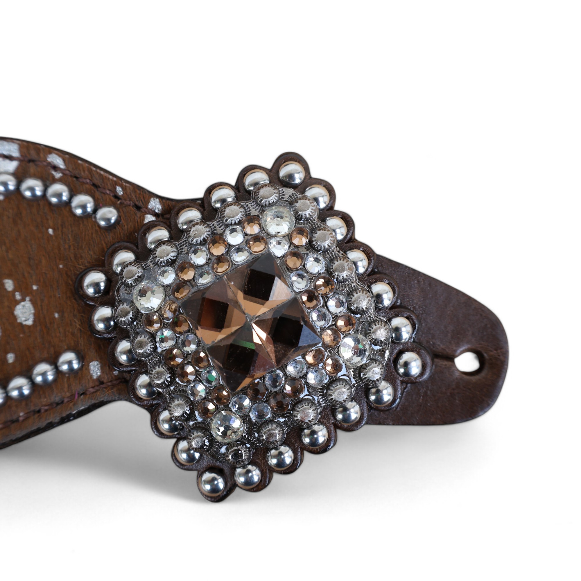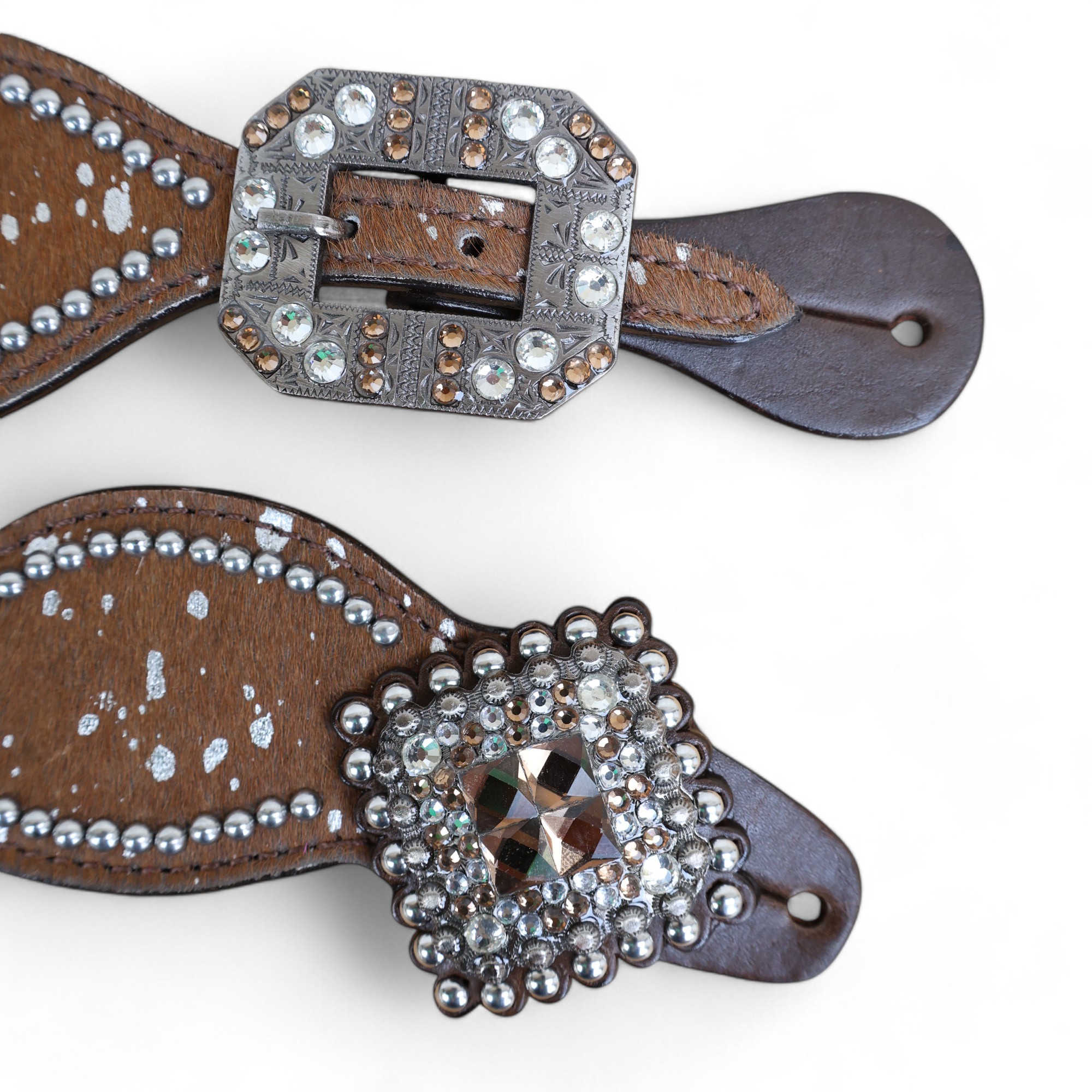 Add This Spurs Strap to Your Gear Collection. This Spurs is Elegantly Decorated with Acid Wash Hair On Leather and Rhinestone Jewelled Antique Nickel Conchos and Buckles. Round Head Rivets are Studded Around the Strap Add More to Its Beauty. Made From High Quality Argentina Cow Leather, This is not Only Stylish But Also Durable and Comfortable For You to Wear During Rides.