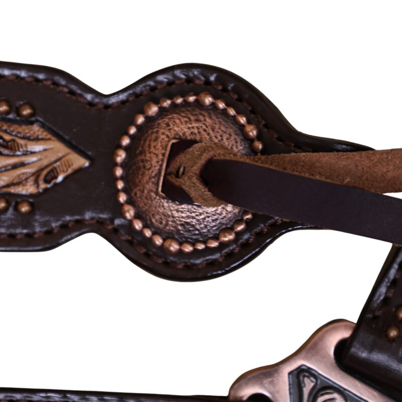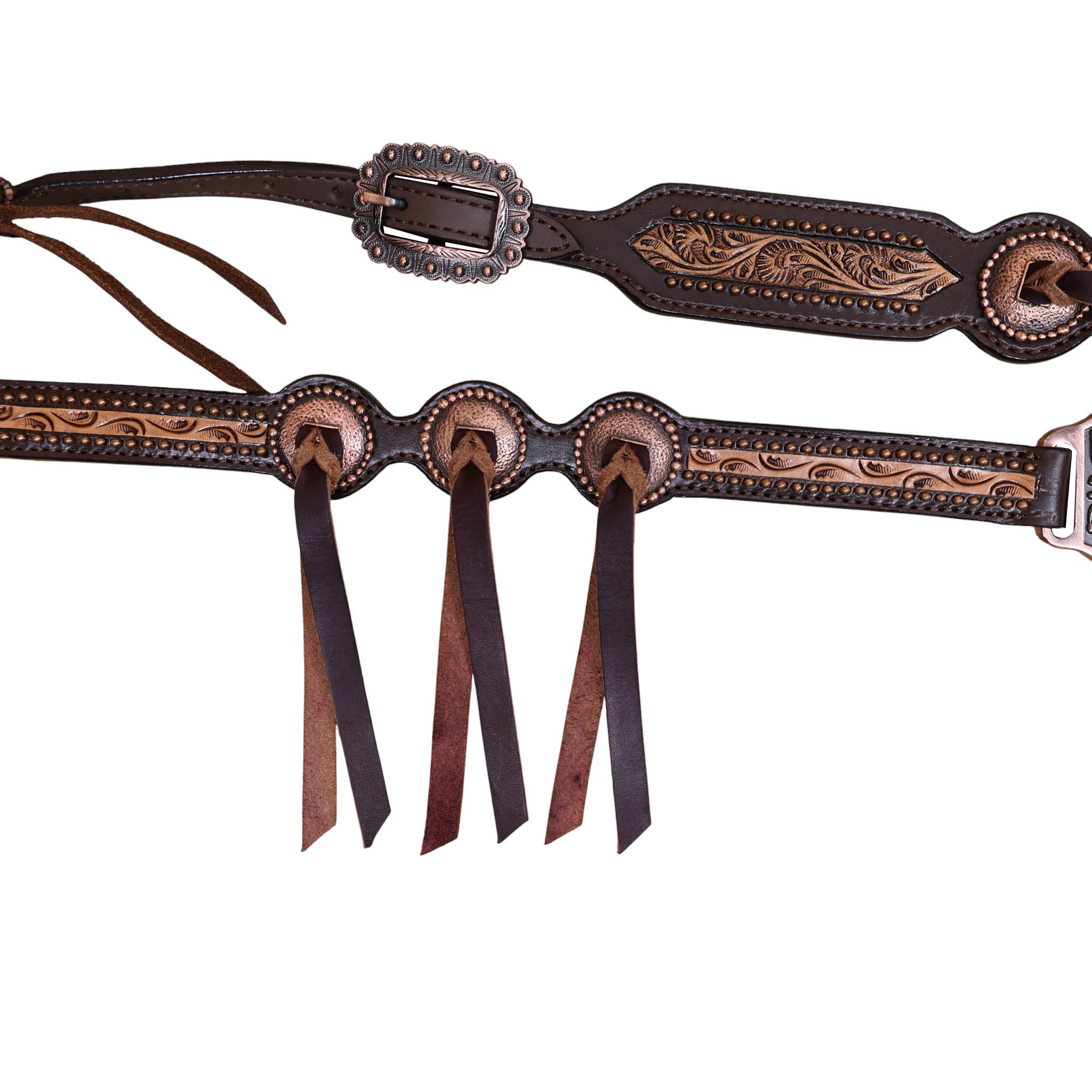 Headstall Type: Headstall and Breast Collar tack Set decorated with hand carving border with very tiny copper studs with matching slot conchos and burgundy leather laces