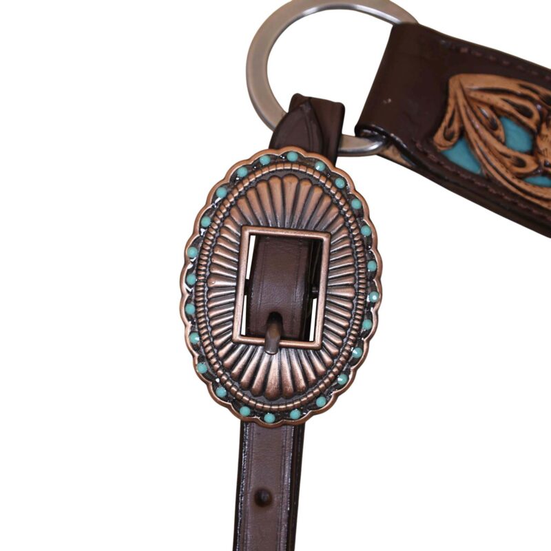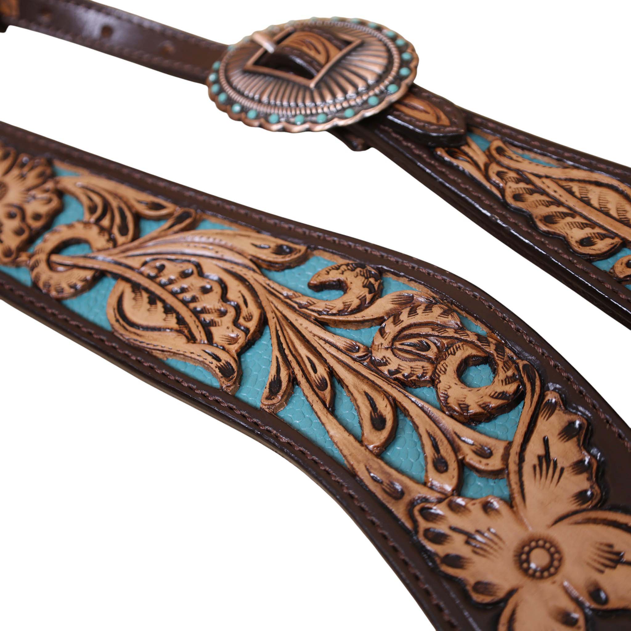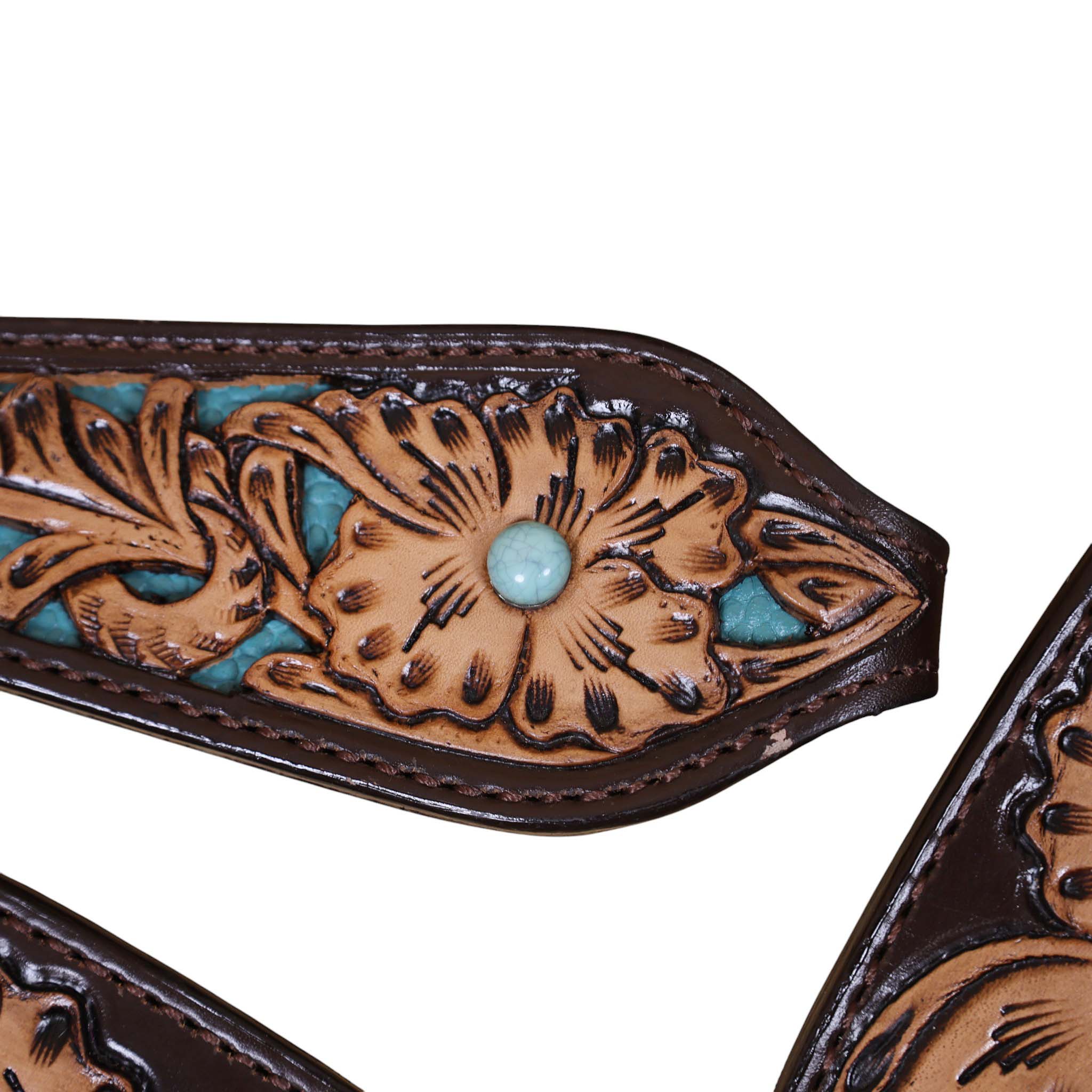 Headstall Type: Headstall and Breast Collar tack Set decorated with window tooling, rawhide buckle stitching, and turquoise & White gem stone on embellished horse tack