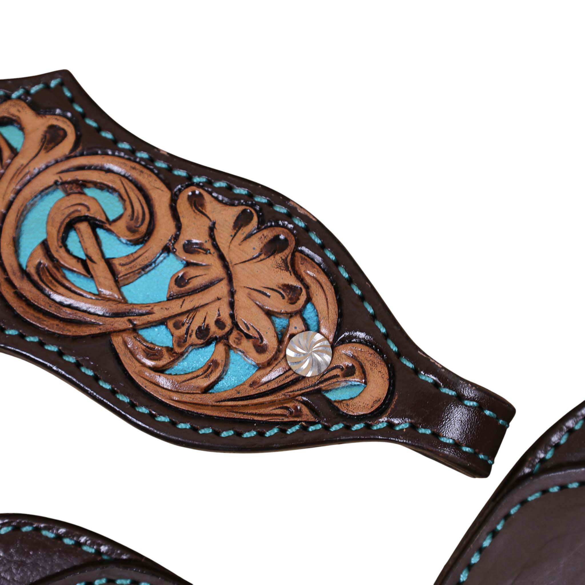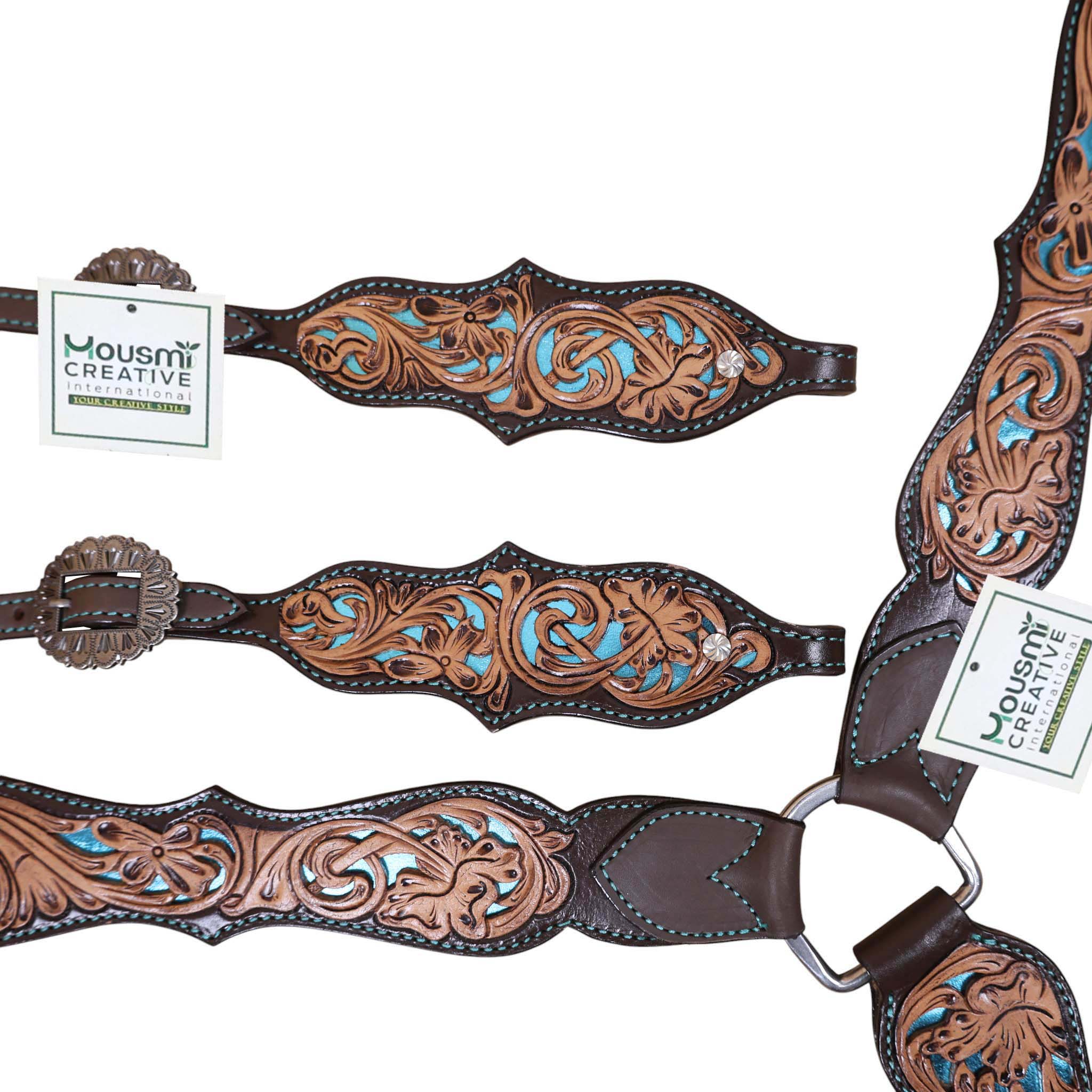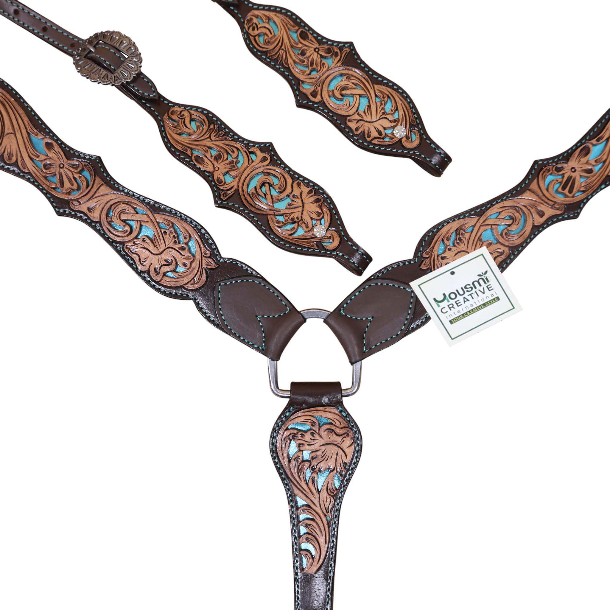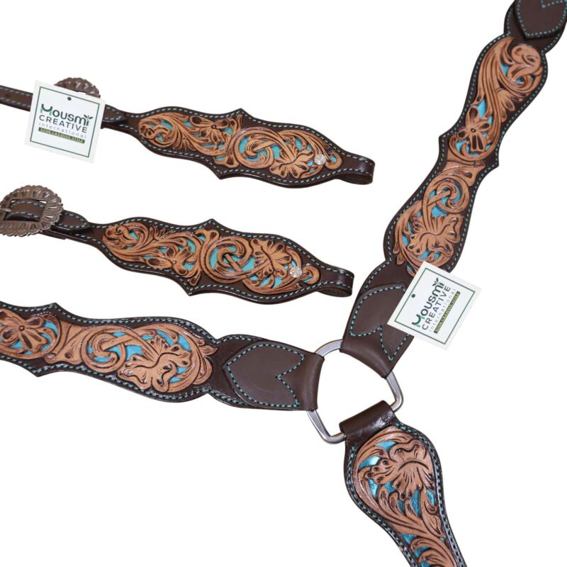 Headstall Type: Headstall and Breast Collar tack Set decorated with flower hand tooled and filigree carving with turquoise inlay, antique finish, big sun burst buckles