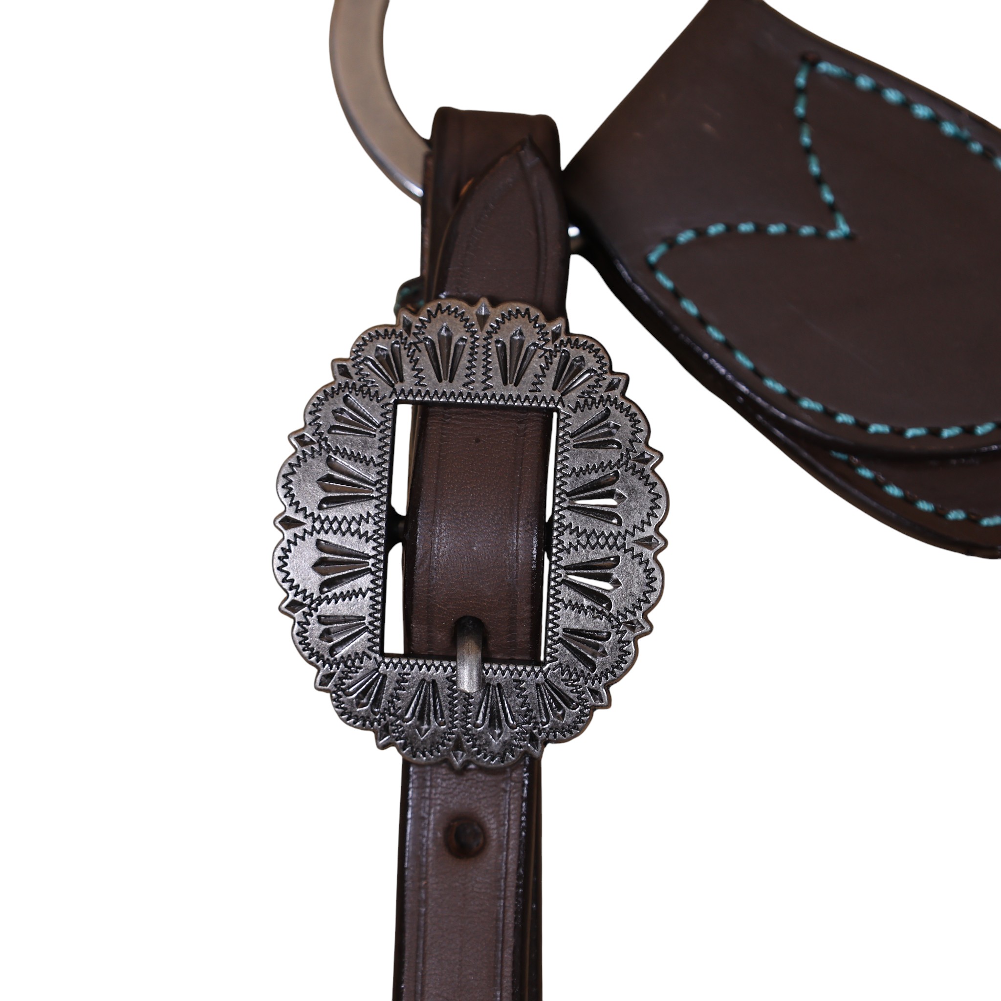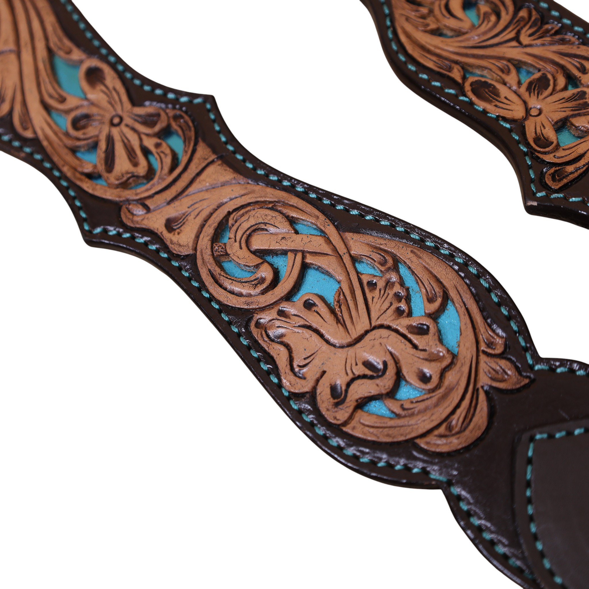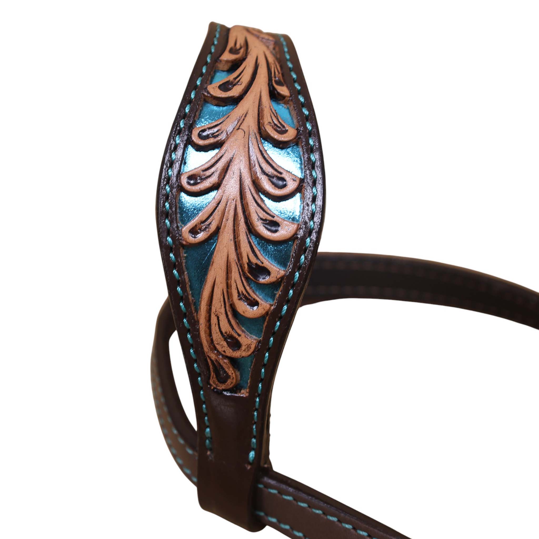 Headstall Type: Headstall and Breast Collar tack Set decorated with flower hand tooled and filigree carving with turquoise inlay, antique finish, big sun burst buckles
