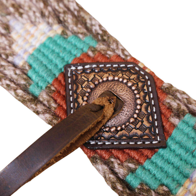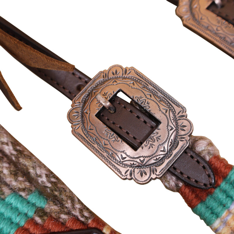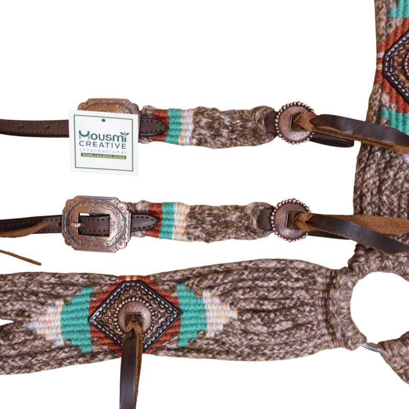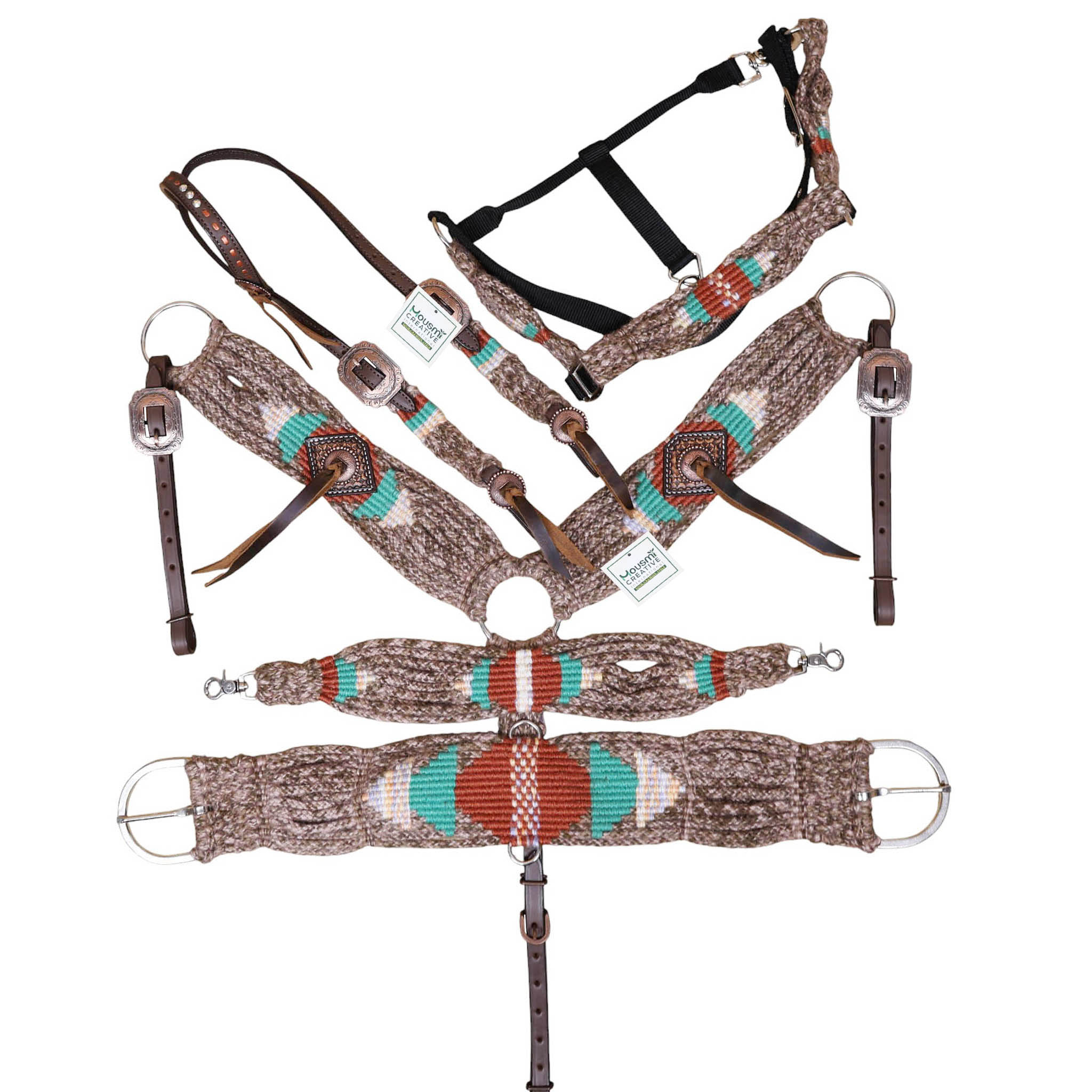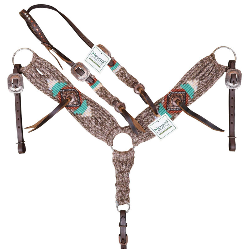 Headstall Type: Western Headstall and Breast Collar tack Set decorated with Baze, Turquoise and radish brown Mohair Headstall tack set decorated with matching front girth 32″ on argentina leather