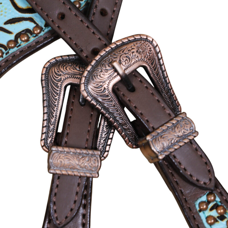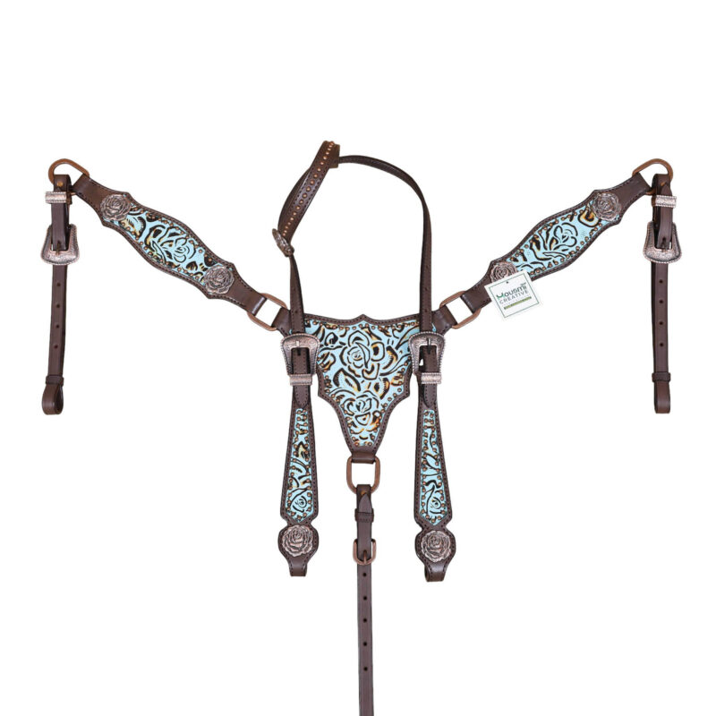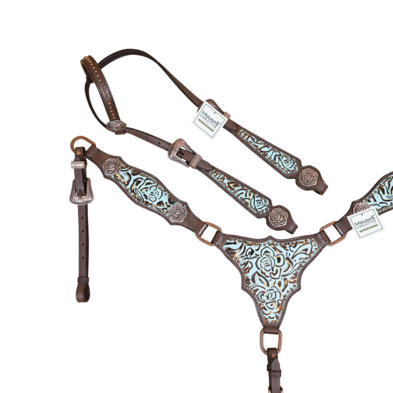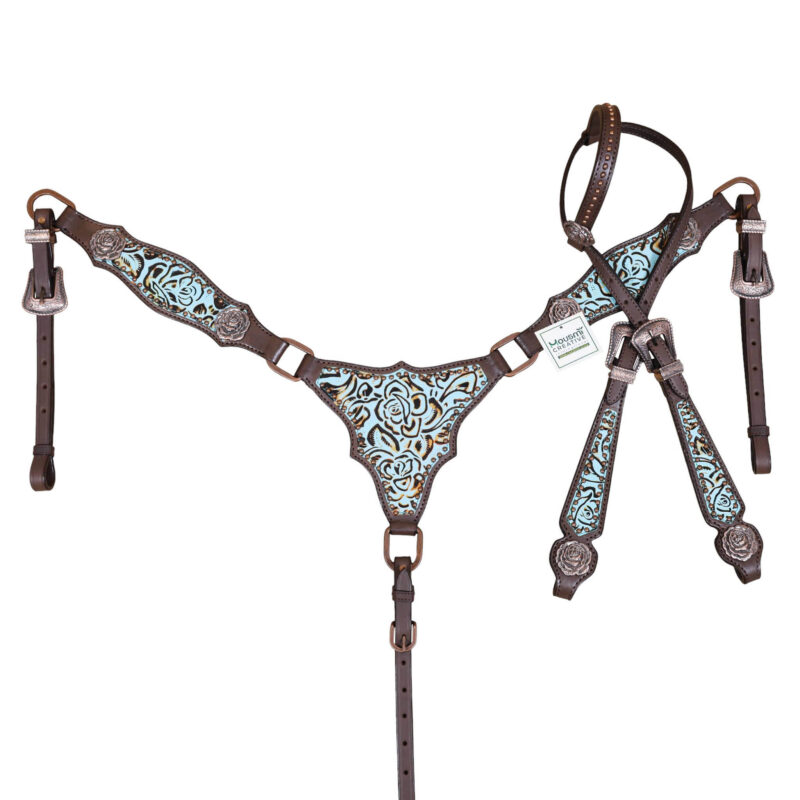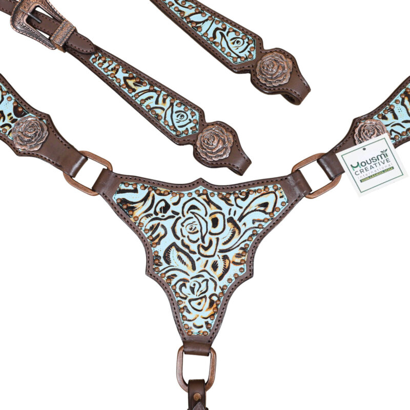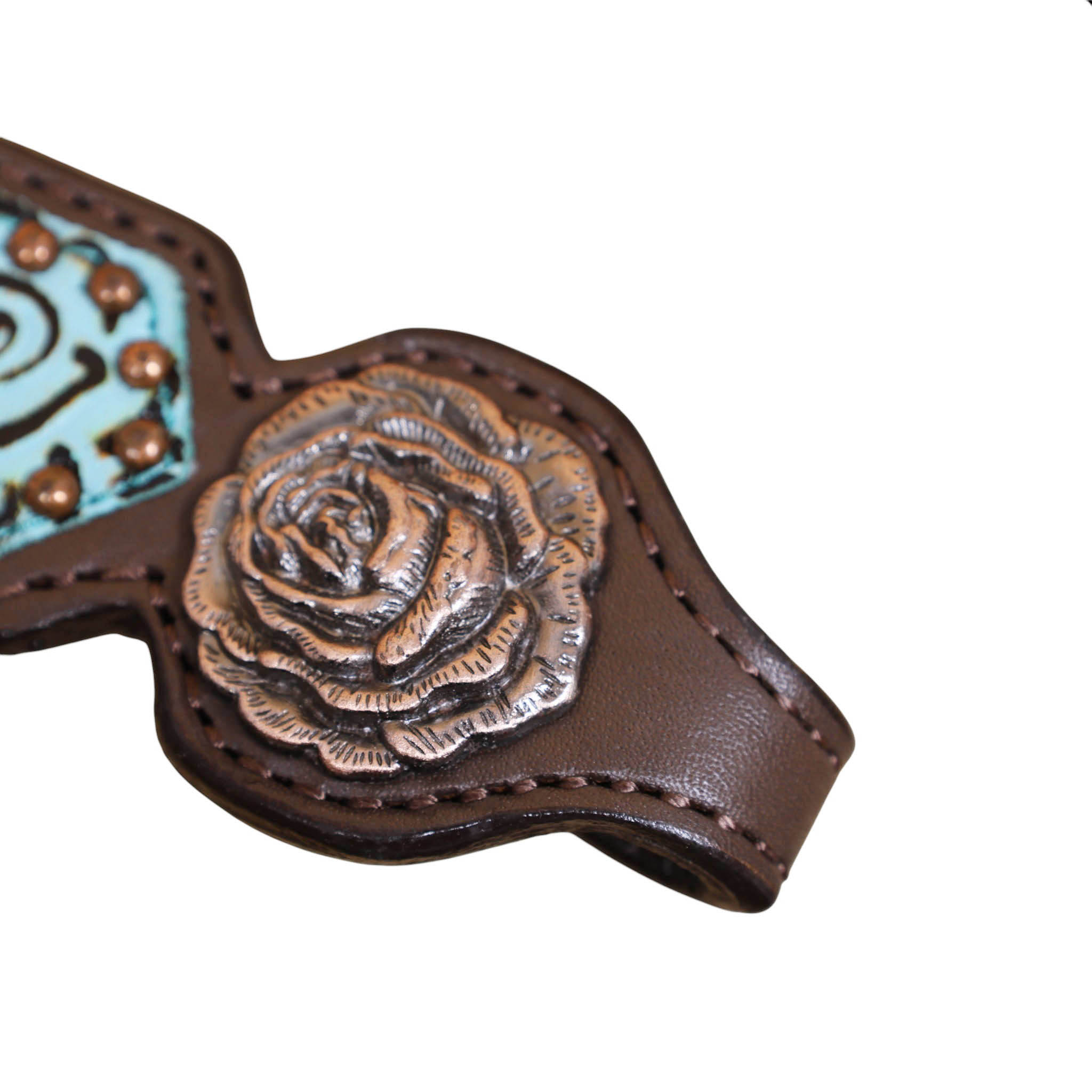 Headstall Type: Western Leather Headstall and Breast Collar tack Set decorated with Turquoise rose embossed leather patches with copper studs and rose hardware